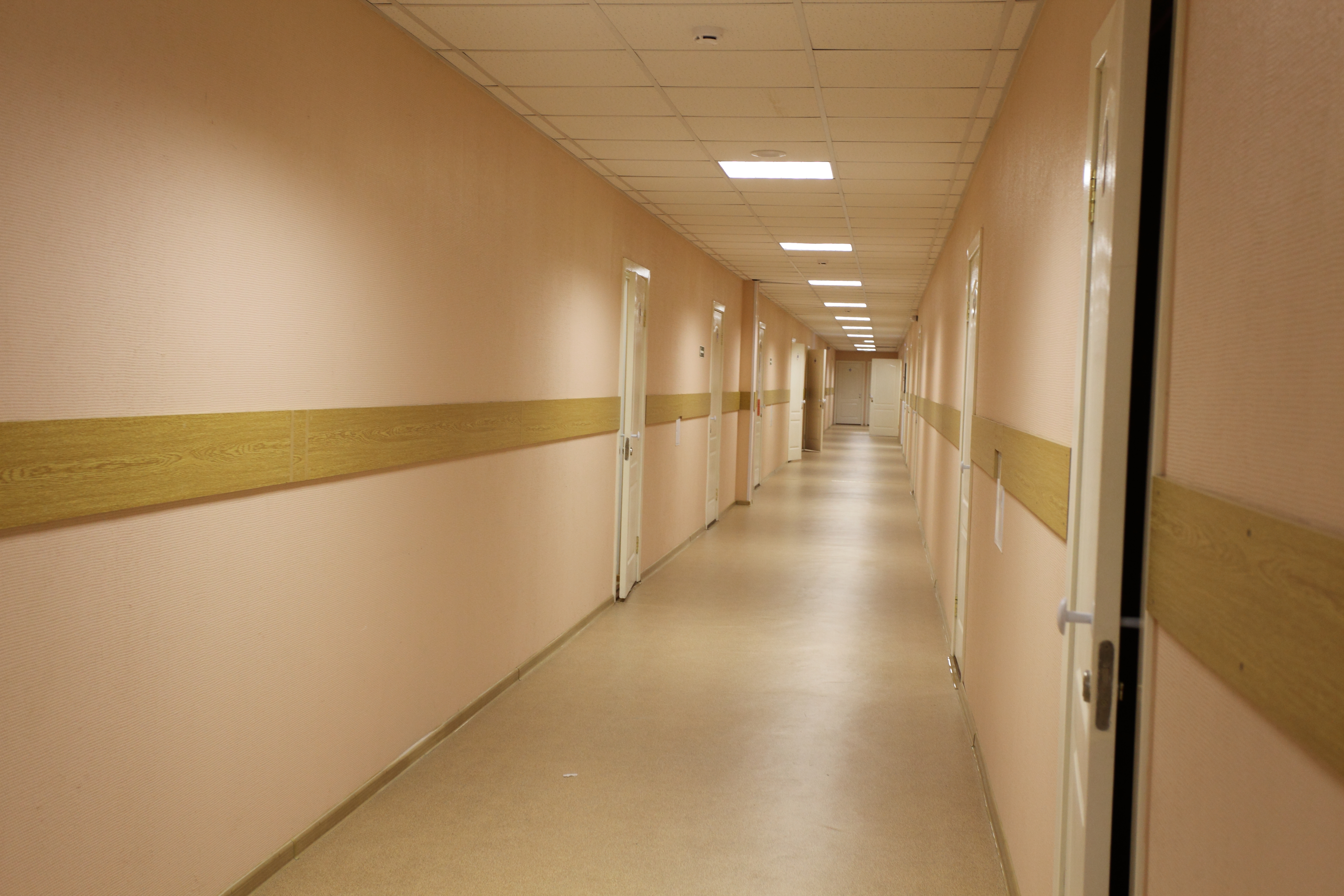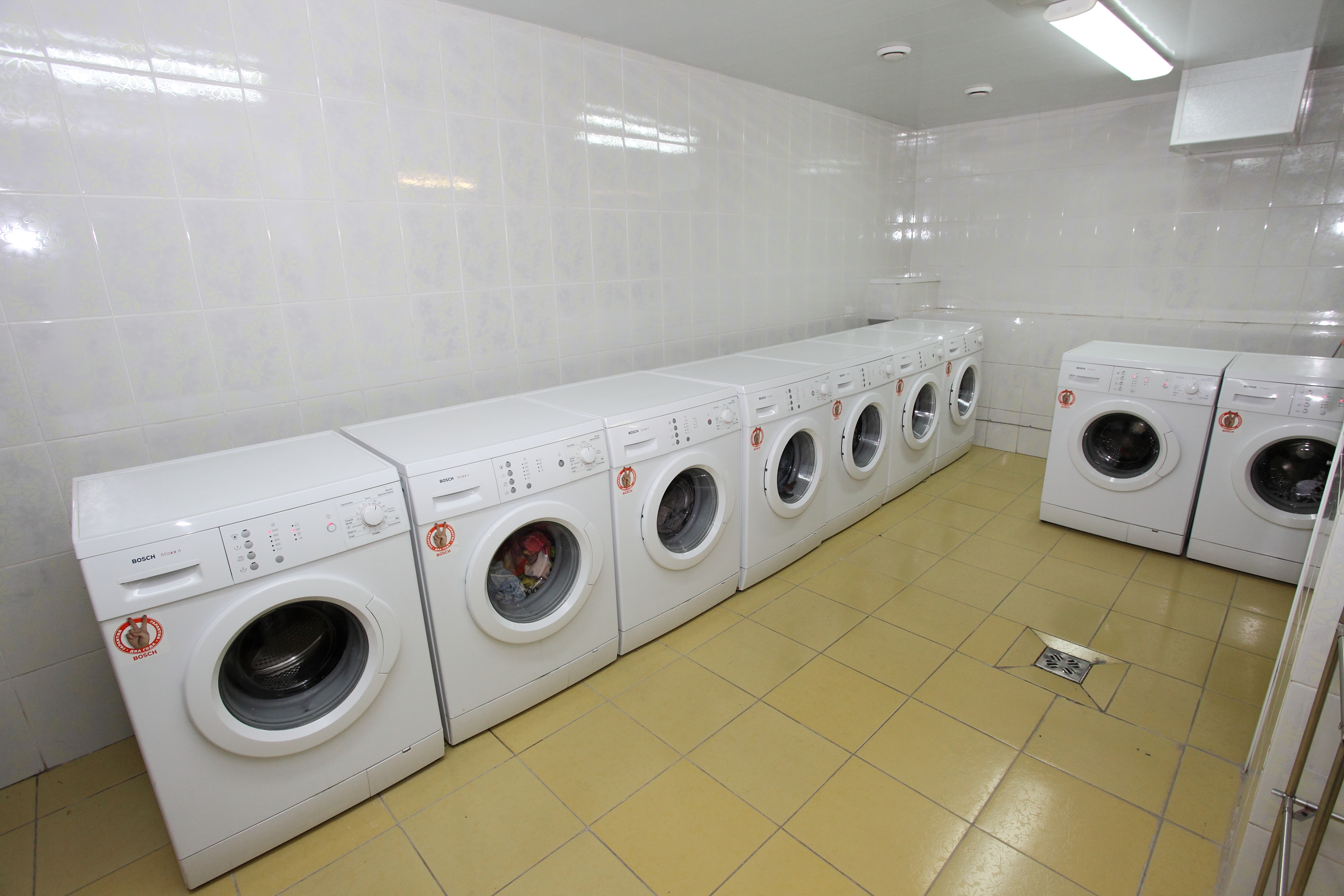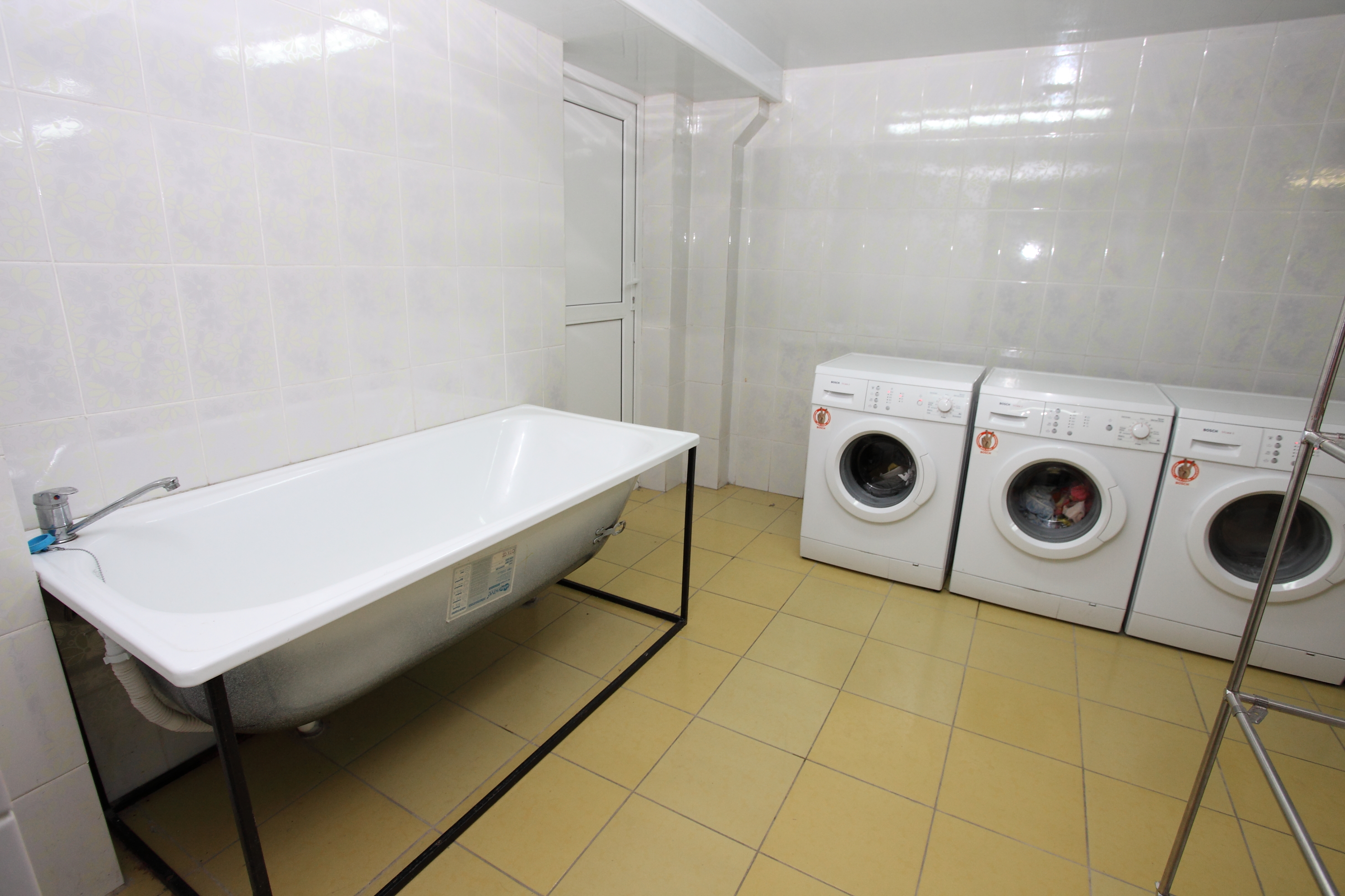 На цокольном этаже работают две душевые, камера хранения, прачечная со стиральными и сушильными машинами, кастелянная.