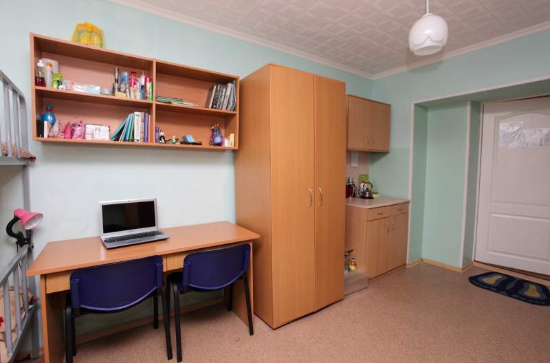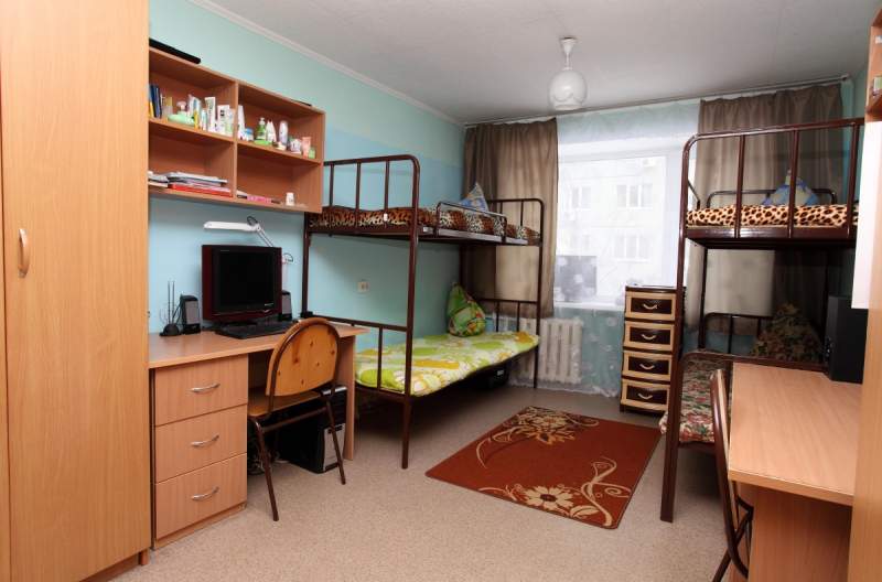На каждом этаже по 40-41 комнате. Комнаты для проживания рассчитаны на троих человек, укомплектованы мебелью: