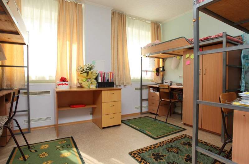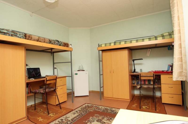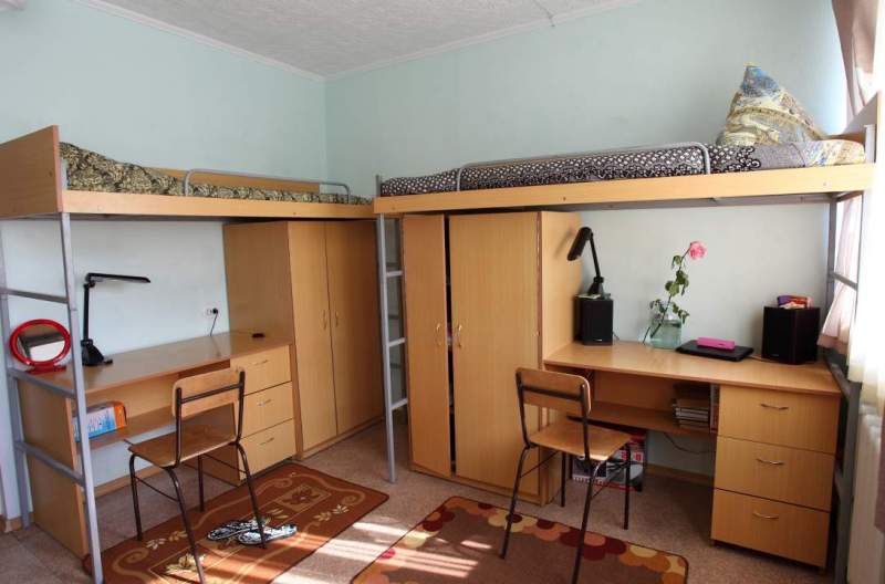 - «Уголок студента» (кровать, шкаф для одежды, стол письменный) на каждого проживающего;
