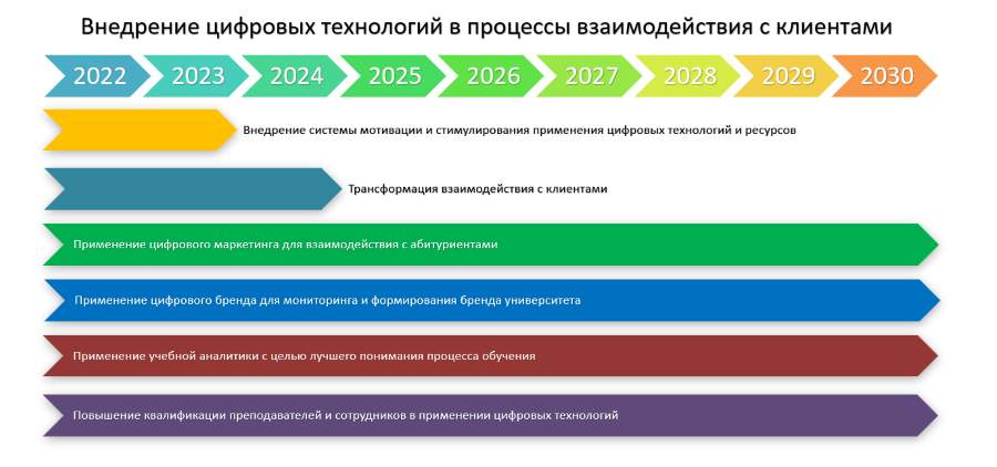 Цифровая трансформация взаимоотношений с клиентами университета состоит во внедрении цифровых технологий в процессы взаимодействия со студентами (учебная аналитика, «цифровые следы») и абитуриентами (цифровой маркетинг – продвижение персонализированных маркетинговых материалов для различных целевых групп: иностранные граждане, «высокобалльники», «целевики» и т.п.). Большое значение имеет и цифровой брендинг, предусматривающий мониторинг восприятия бренда университета, лояльности персонала и студентов, формирование привлекательного имиджа, мониторинг социальных сетей.