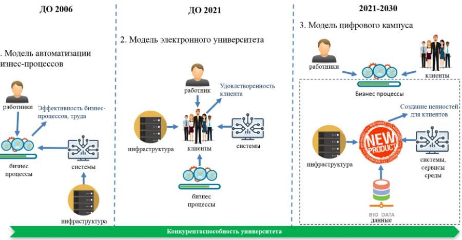 Таким образом, результатом цифровой трансформации университета должен стать переход к модели Цифрового кампуса, обеспечивающего создание продуктовой ценности для клиента, ведущий к изменению модели образовательной деятельности и формирующий цифровую культуру клиентов и сотрудников.