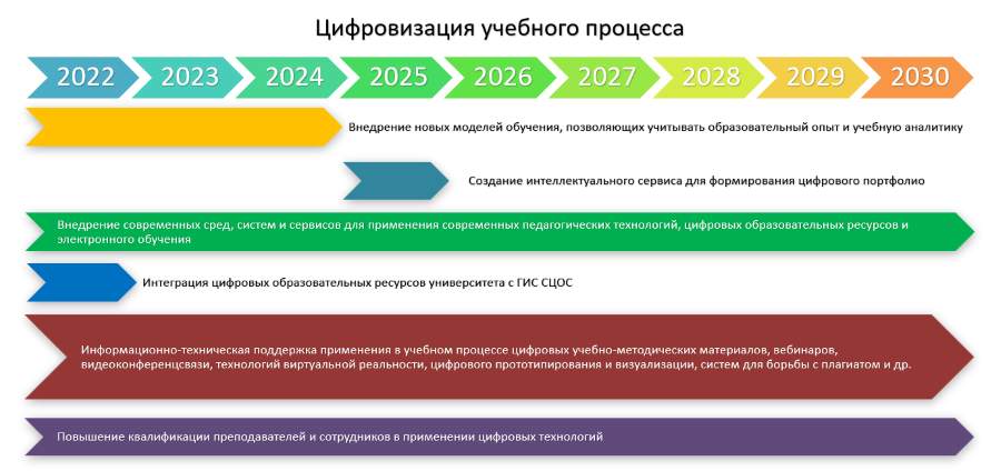 В последние годы в университете проводится цифровая трансформация, состоящая в принятии новой модели деятельности на основе внутреннего обновления, понимания необходимости изменений и инноваций в вузе на основе применения передовых цифровых технологий. Ключевые активности в цифровом переходе связаны с людьми и корпоративной культурой, что создает новые возможности для студентов быть успешными в учебе, а для работников – повысить результативность на основе обновленных или новых подходов и моделей деятельности, использующих преимущества цифровых технологий.