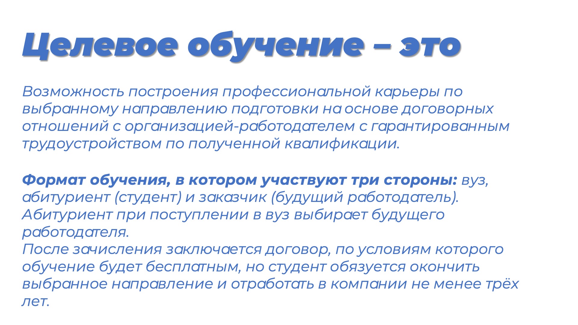 Целевое обучение – это форма обучения, при которой абитуриент после зачисления в университет заключает договор со своим будущим работодателем. По этому договору студент учится бесплатно, получает стипендию, а также может претендовать на дополнительные меры поддержки от будущего работодателя (например, возмещение расходов на проезд, предоставление жилья, оплата питания и др.).