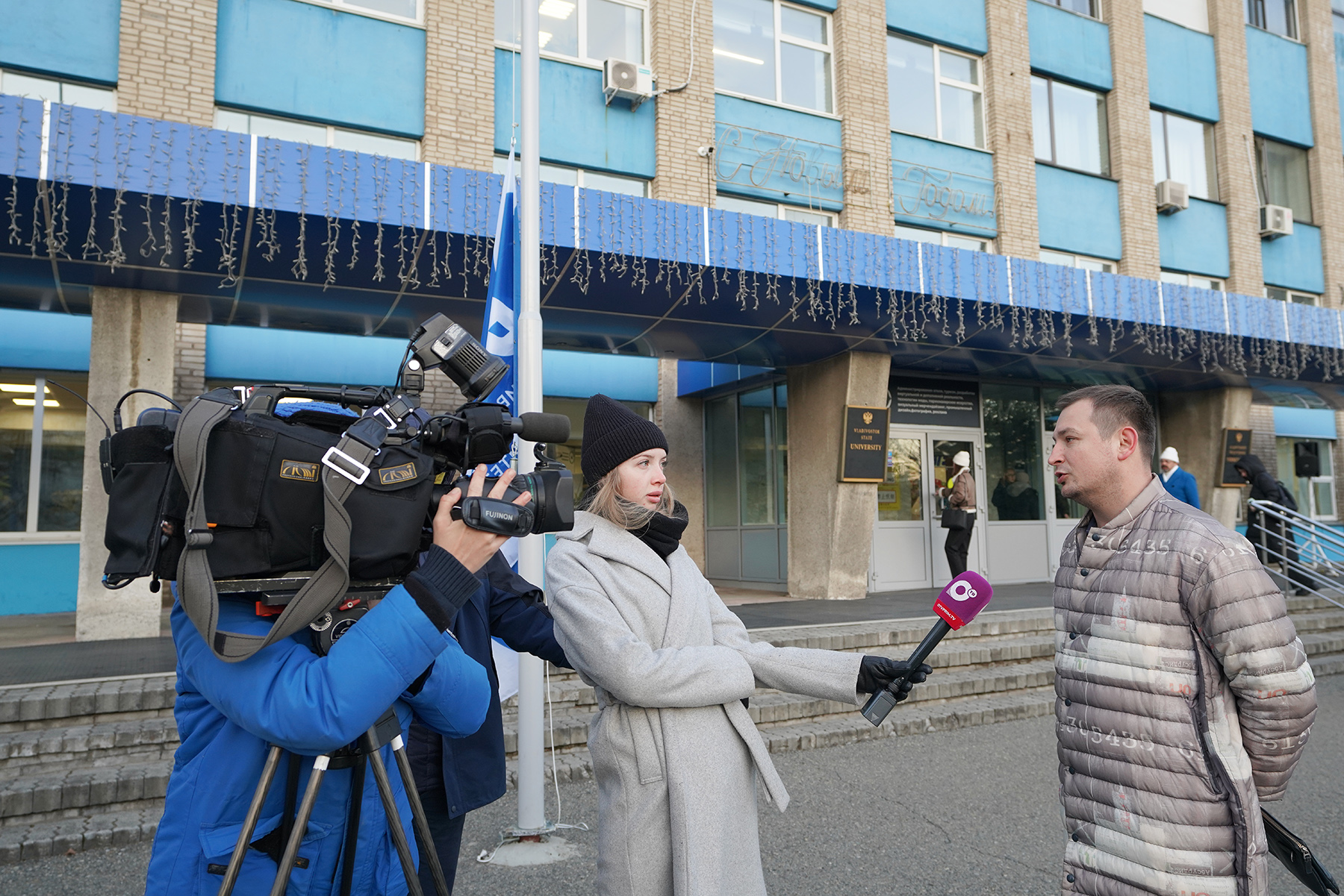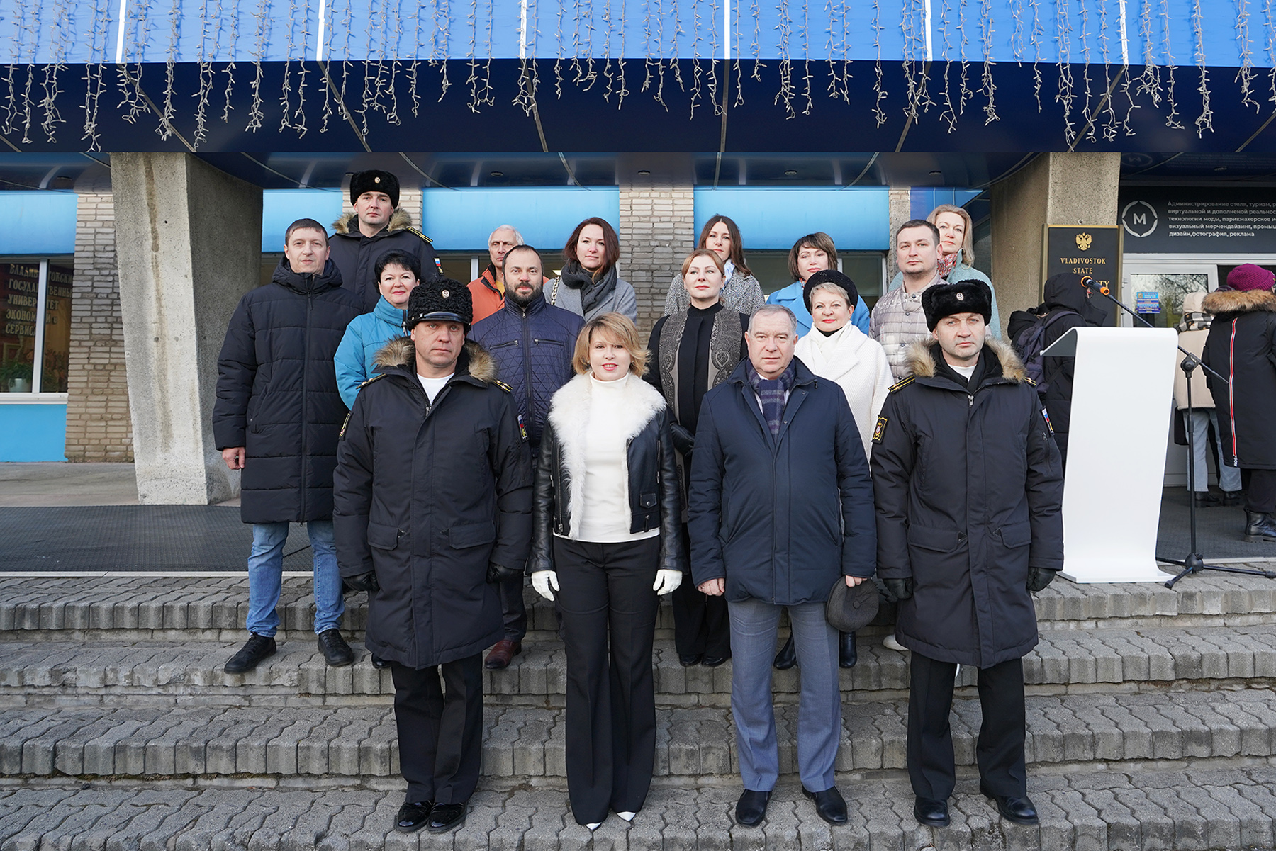 14-го ноября у главного входа Владивостокского государственного университета, где установлены флагштоки, был дан старт новой традиции: каждая учебная неделя отныне будет начинаться с торжественного подъема флагов. В 08:30 на церемонии собрались преподаватели и студенты университета, курсанты Военного учебного центра ВВГУ.