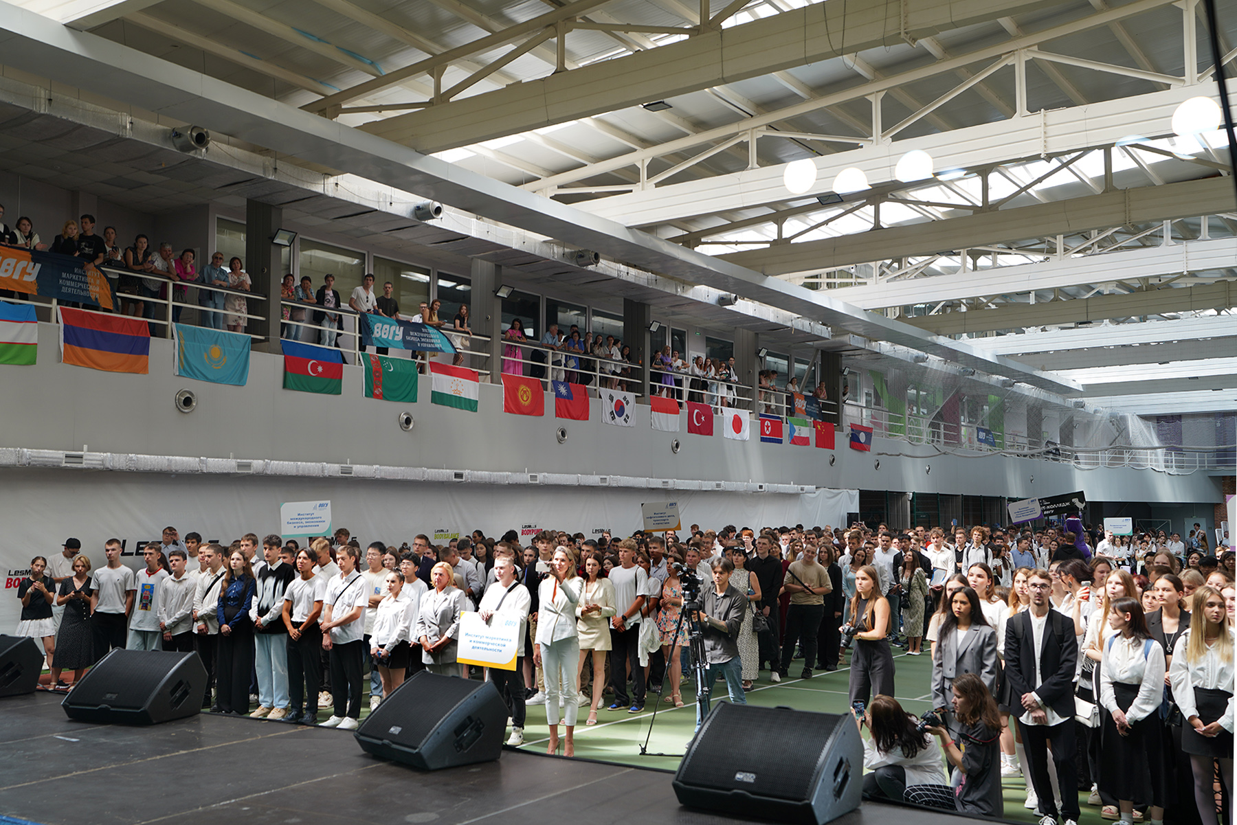 8 сентября первокурсники всех направлений обучения программ высшего и среднего профессионального образования встретили начало первого учебного года в ВВГУ на торжественной линейке в манеже спорткомплекса «Чемпион». Зал был украшен десятками флагов – институтов и колледжей ВВГУ, стран и субъектов РФ, из которых прибыли студенты, Владивостока и Приморья, Российской Федерации – собрание проходило под лозунгом «Равнение на флаги!».