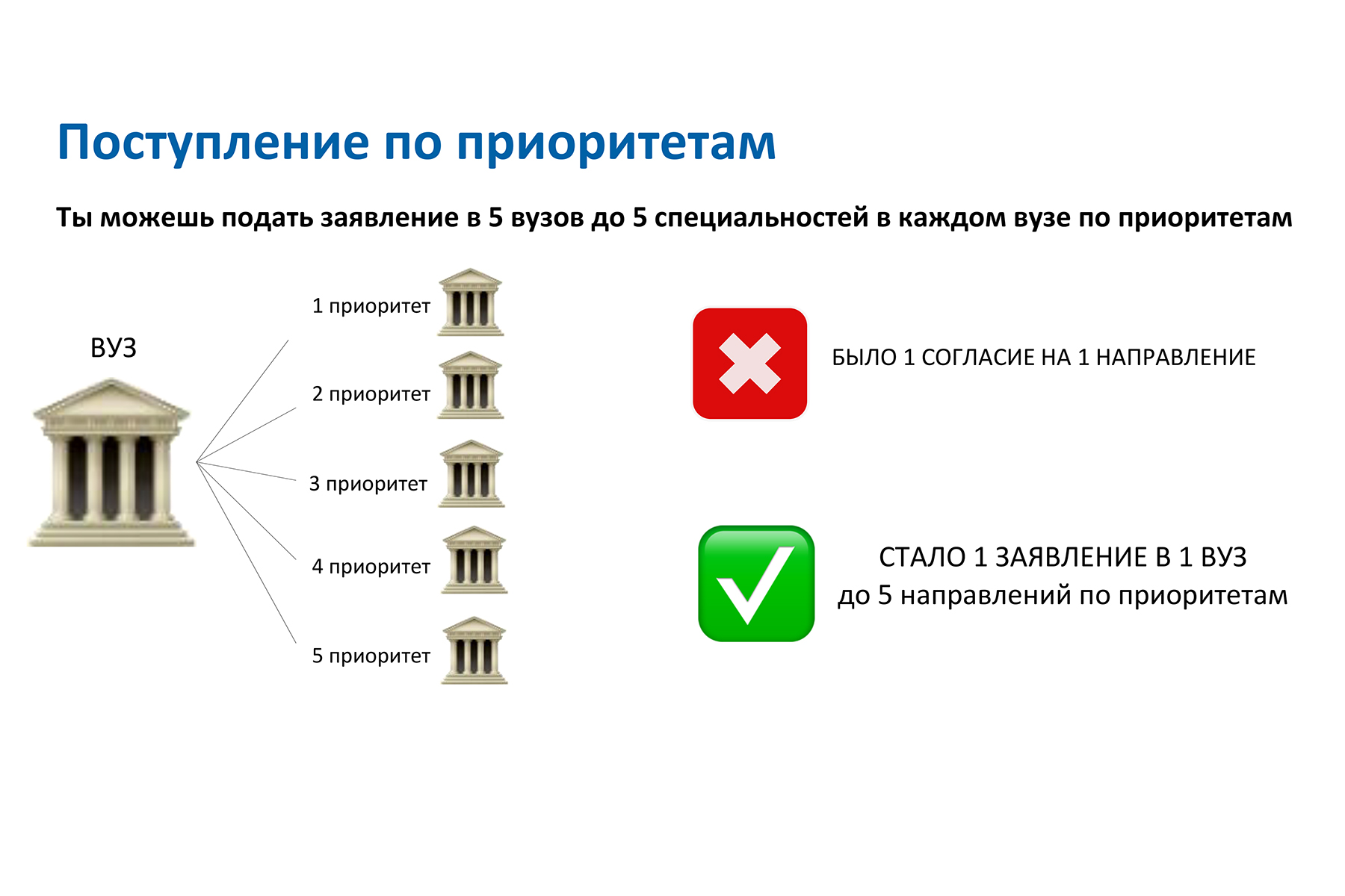 На каждом этапе зачисления вуз определяет наиболее высокий приоритет, по которому поступающий проходит по конкурсу. Порядок приоритетов можно поменять до окончания приема документов 25 июля.