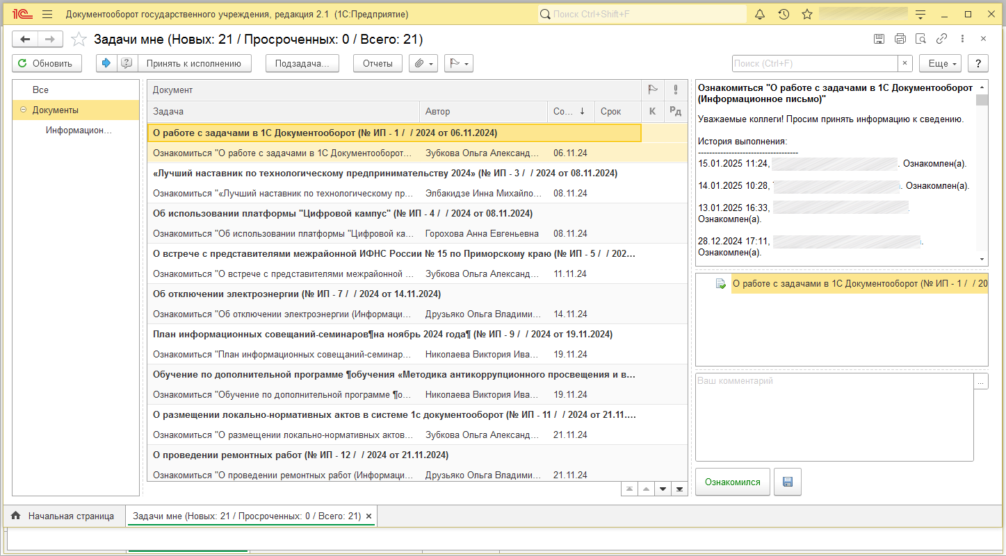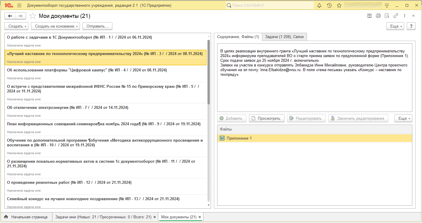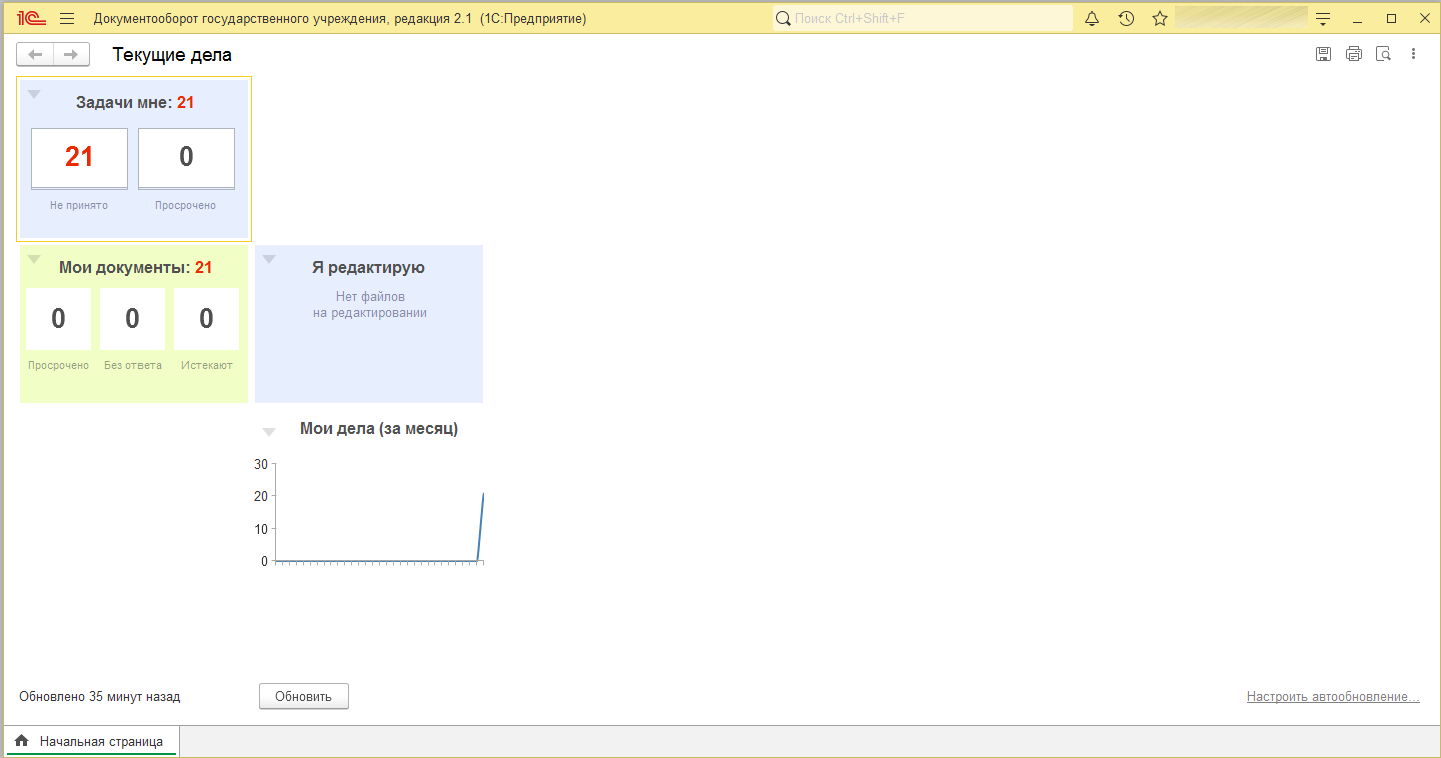В настоящее время 1С:Документооборот государственного учреждения используется для учета и обработки входящей корреспонденции, рассылок распорядительных документов, формировании приказов на оплату труда, при проведении инвентаризации.
