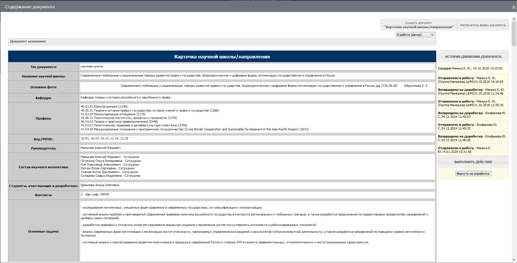 Карточка научной школы/направления – описание научных школ или направлений исследований.