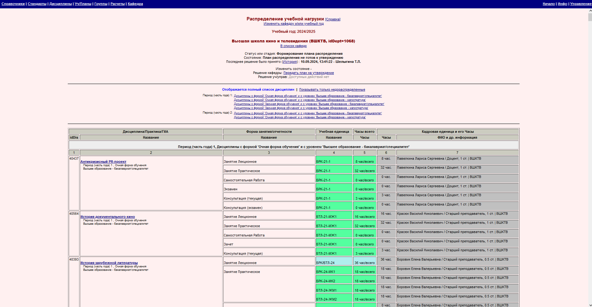 - распределение нагрузки между преподавателями (плановое и текущее расписание);
