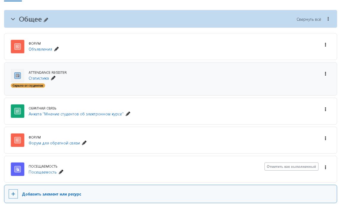 Преподаватель может по своему усмотрению использовать как тематическую, так календарную структуризацию курса. При тематической структуризации курс разделяется на секции по темам. При календарной структуризации каждая неделя изучения курса представляется отдельной секцией, такая структуризация удобна при дистанционной организации обучения и позволяет учащимся правильно планировать свою учебную работу.Редактирование содержания курса проводится автором курса в произвольном порядке и может легко осуществляться прямо в процессе обучения. Очень легко добавляются в электронный курс различные элементы: лекция, задание, форум, глоссарий, wiki, чат и т.д. Для каждого электронного курса существует удобная страница просмотра последних изменений в курсе.