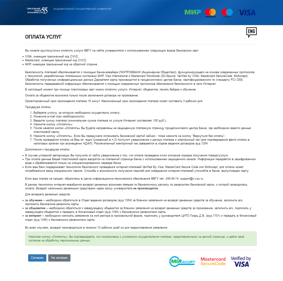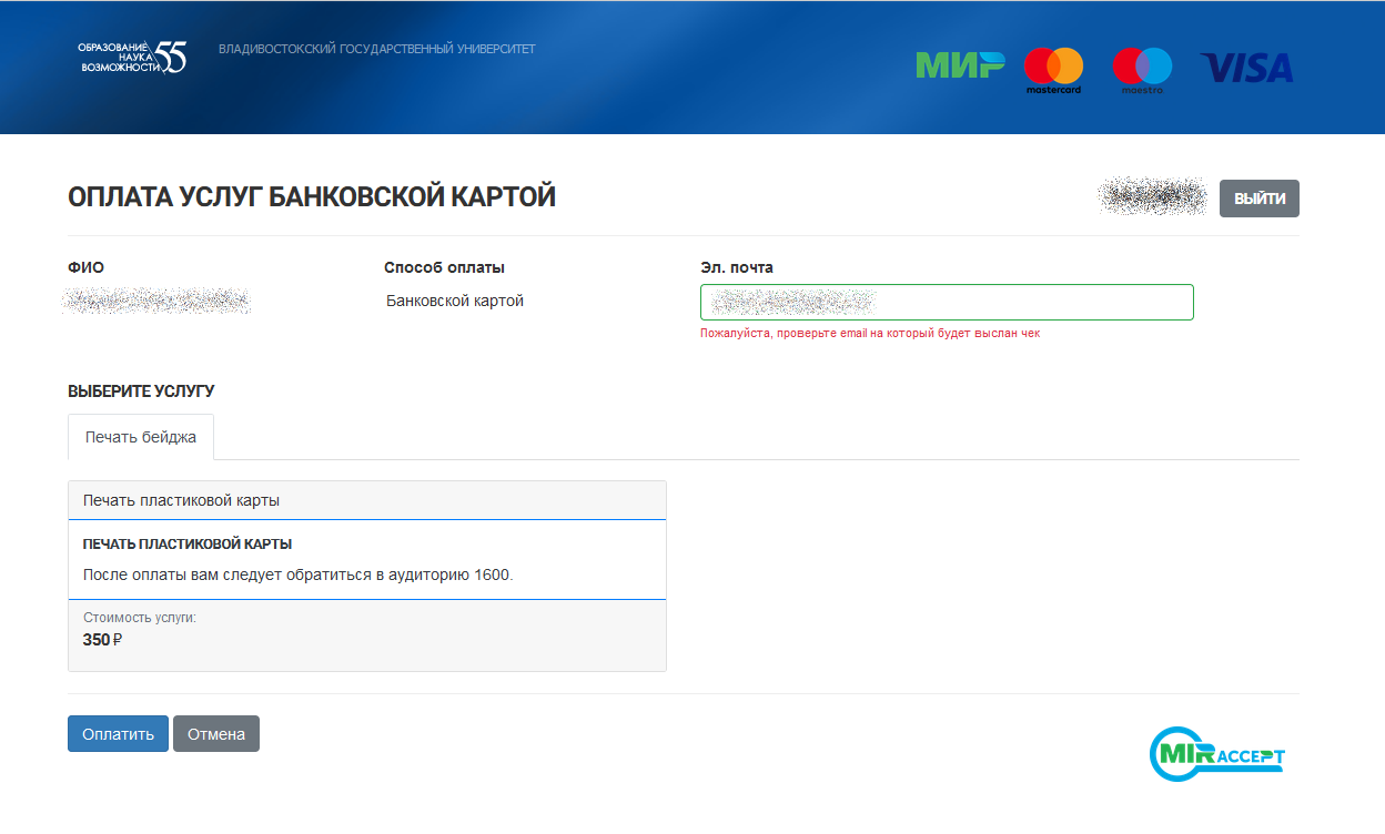 На сайте университета доступен сервис "Оплата услуг ВВГУ" при помощи банковских карт.