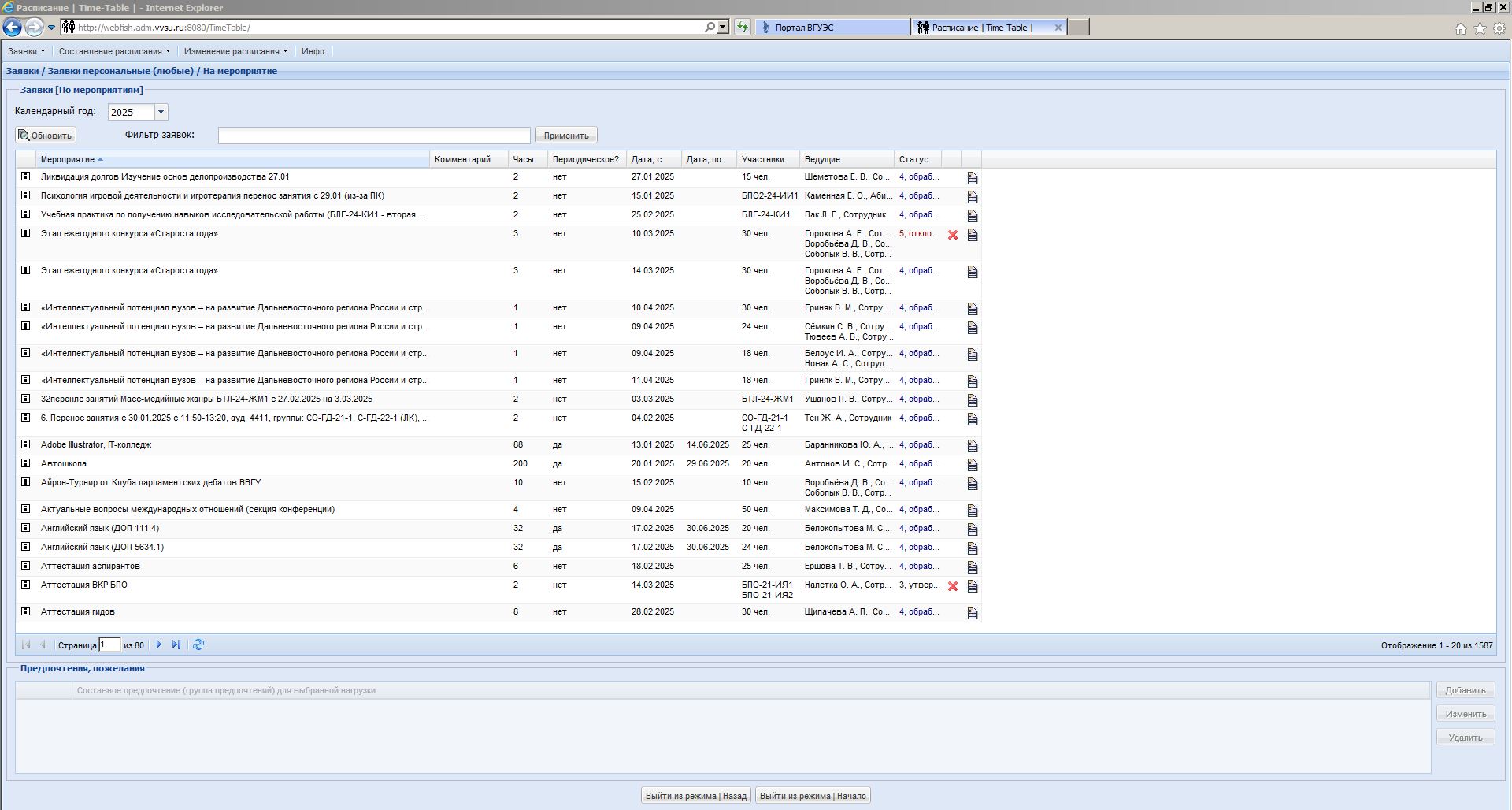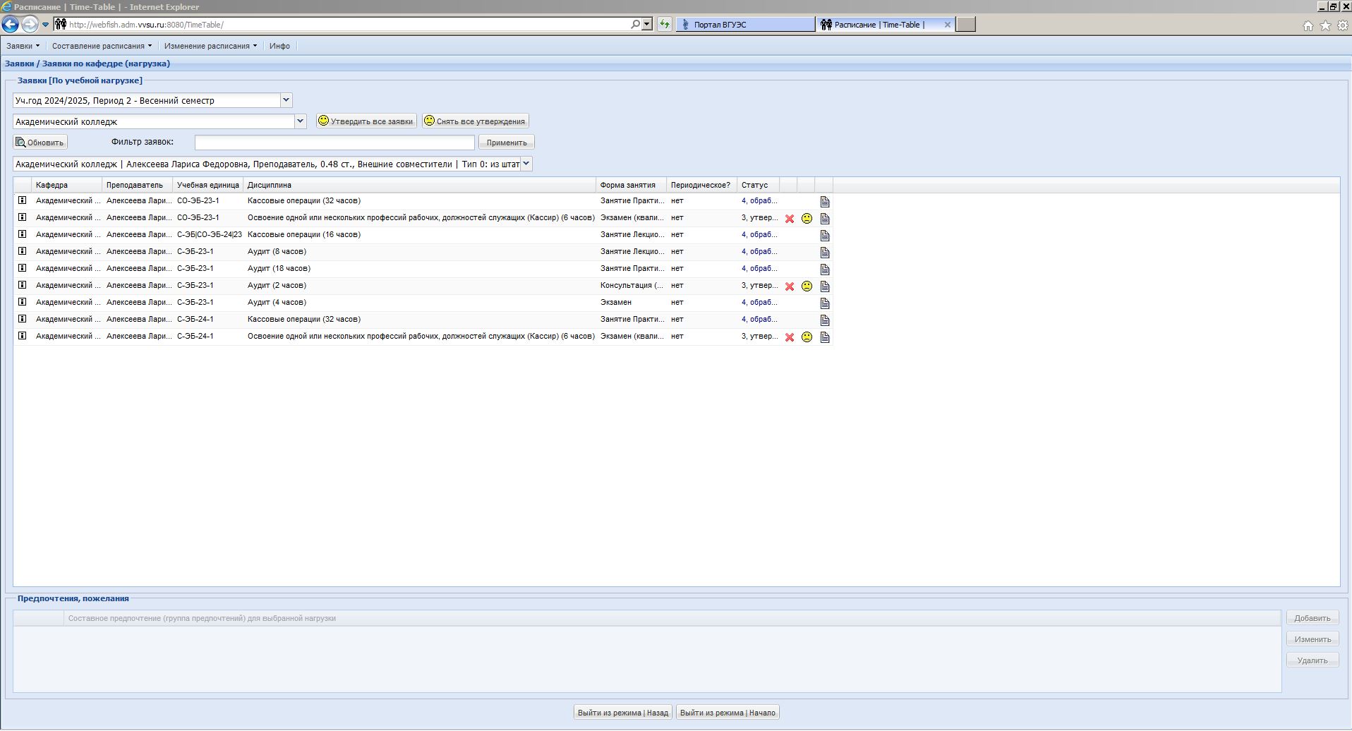 - собирать от преподавателей и других участников учебной деятельности заявки на использование аудиторий вуза для включения в расписание с учетом предпочтений (время, необходимое оборудование и т.п.);