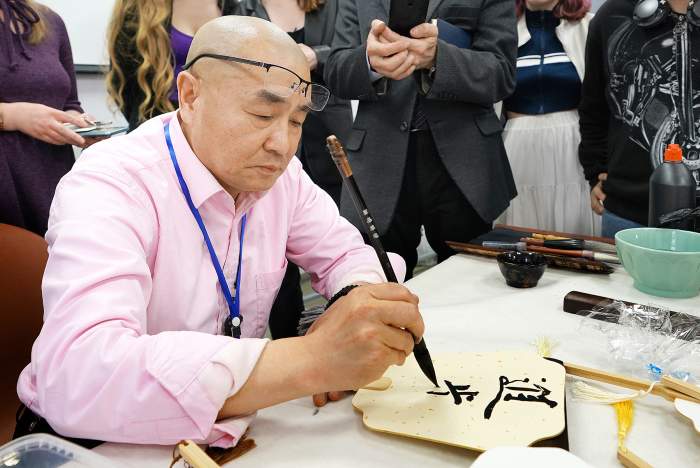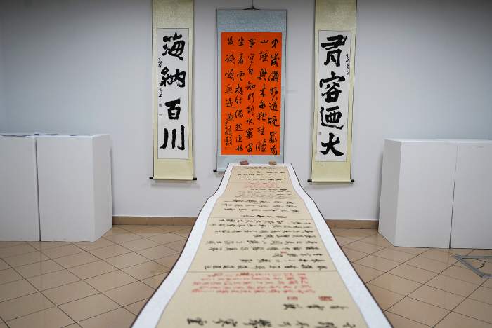 Основу экспозиции составляют работы руководителя Школы каллиграфии и живописи «Гу Юйсюань» Ли Ехуа. В выставке также принимают участие его ученики: Чжэн Хунян, Хань Ин, Ли Ли, Мао Минюань, Гуань Бо, Чжэн Божуй. Их кисти принадлежат каллиграфические свитки, написанные в разных стилях (чжуаньшу, лишу, синшу, цаошу, кайшу). Каждый из стилей, будь то строгий официальный устав или вольная скоропись, обладает яркими эстетическими и энергетическими свойствами, богатой историей, сложившейся сферой бытования и использования в повседневной жизни, в том числе полиграфическом и промышленном дизайне, наружной рекламе, моде. Каллиграфия в своём «чистом виде», являясь самым почитаемым видом искусства в Китае, знакомит с высокими образцами философской и литературной мысли. На выставке можно увидеть серию каллиграфических свитков, представляющих один из главных буддийских текстов «Сутру сердца», стихотворения Ли Ю и Су Ши, высказывания Лао-цзы и других философов. Так, один из свитков гласит: «Древние говорили: “Напитай свое сердце потоком воды, и ты научишься быть тихим и окруженным горами”».