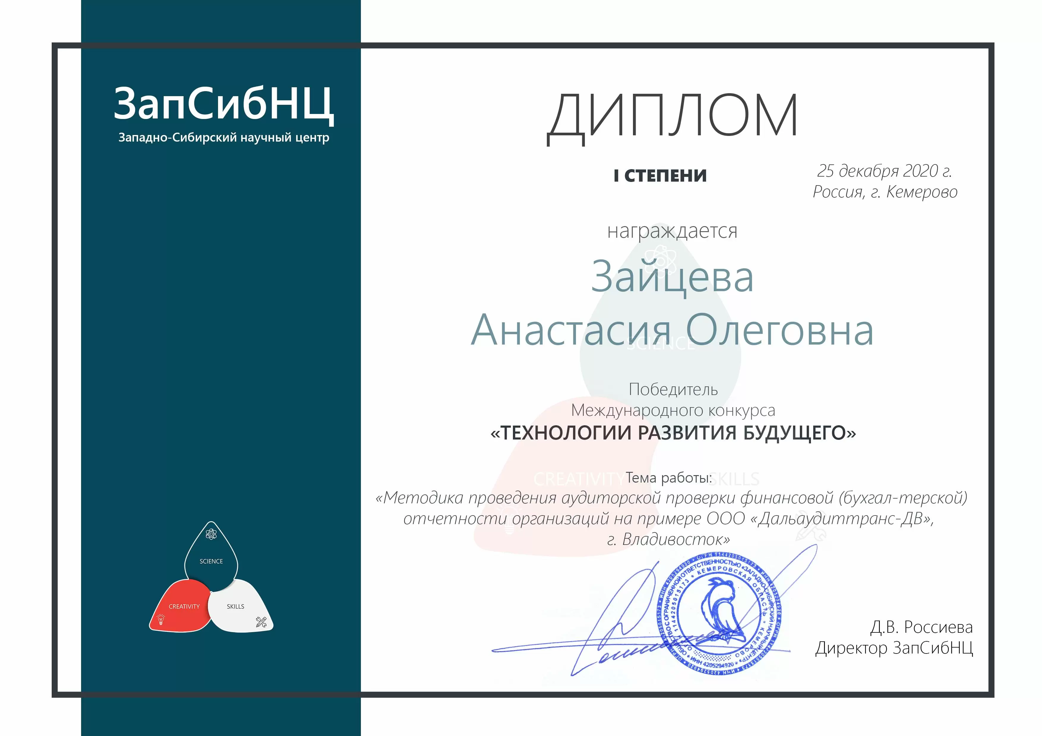 Выпускница кафедры экономики и управления ВГУЭС Зайцева Анастасия была награждена дипломом за первое место (тема Методика проведения аудиторской проверки финансовой бухгалтерской отчетности организаций . Конкурс учрежден Западно- Сибирским Федеральным университетом и проводится при поддержке Евразийской экономической комиссии и Общественной палаты Российской Федерации. Выпускница кафедры экономики и управления ВГУЭС является магистрантом ВГУЭС .Научный руководитель, доцента кафедры Василенко Марина Евгеньевна награждена дипломом за профессиональную, добросовестную подготовку и активное участие в МЕЖДУНАРОДНОМ КОНКУРСЕ