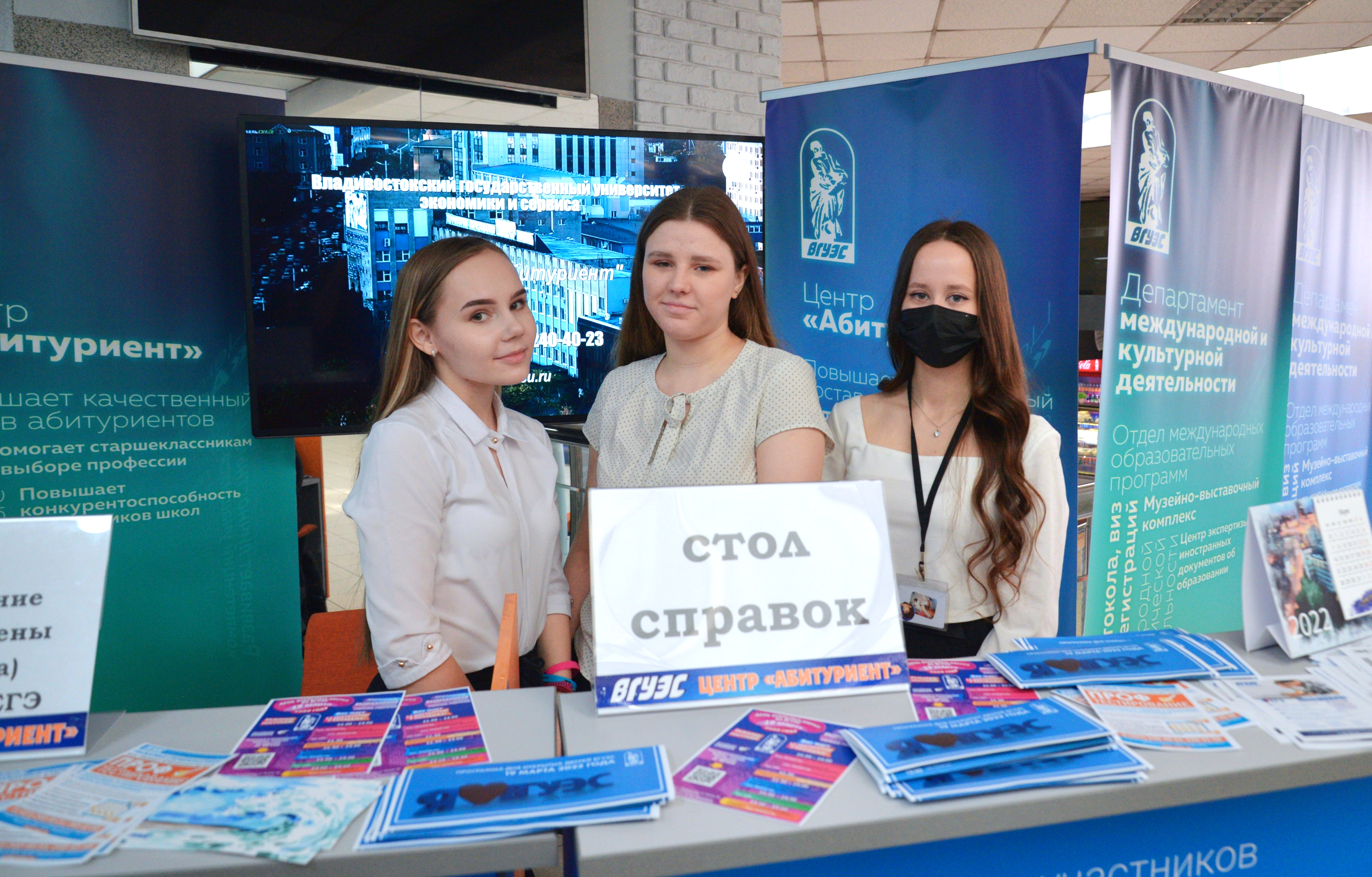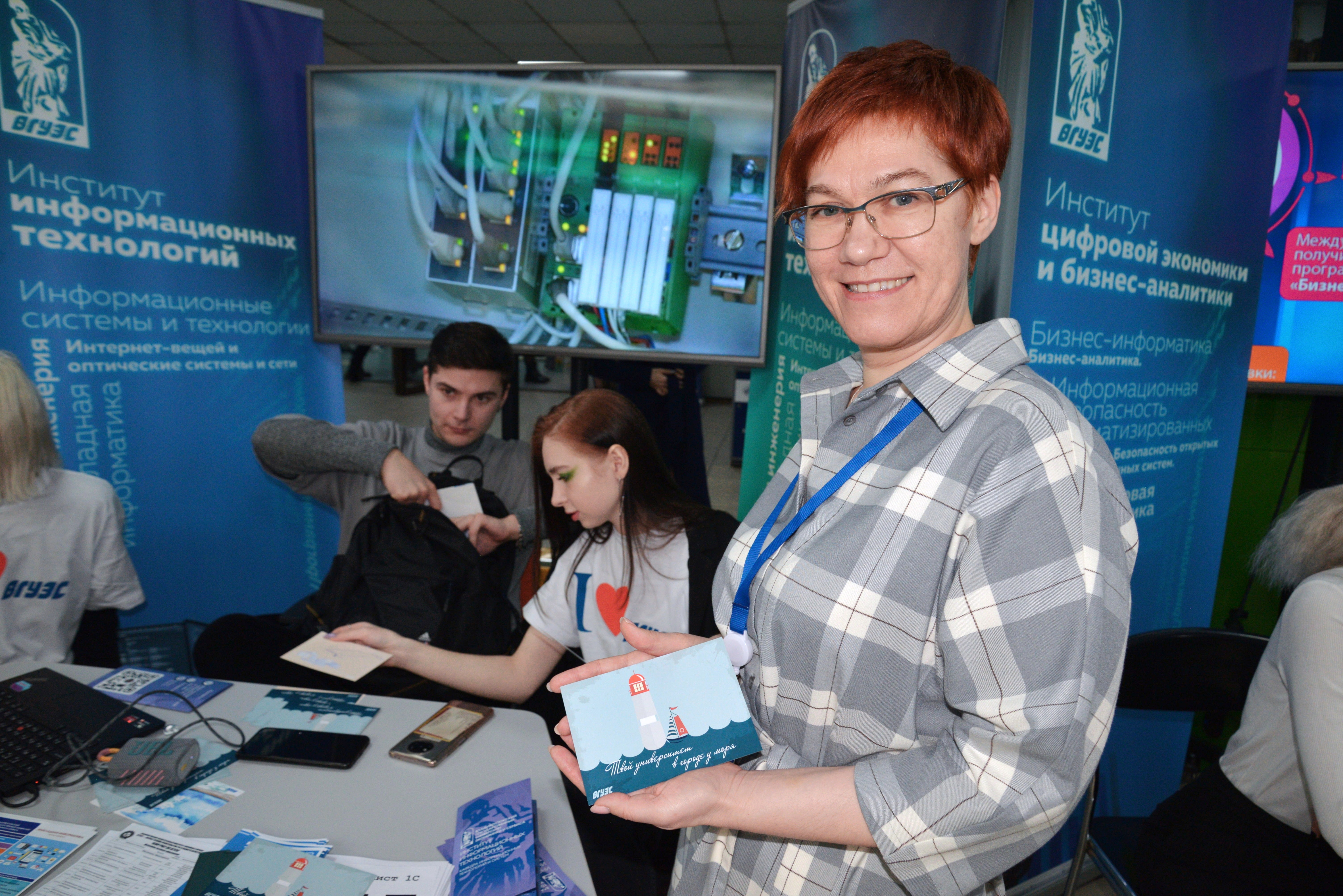 Консультирование старшеклассников и их родителей по всем вопросам о 4 образовательных программах и правилах поступления в IT-институт ВГУЭС проводила команда представителей кафедры: заведующая Кафедрой Информационные технологии и системы Елена Валерьевна Кийкова, заведующий лабораториями кафедры Артём Попутько, лаборант Максим Пивкин, гр. БИК-19-01 Инфокоммуникационные технологии и системы связи. Интернет-вещей и оптические системы и сети, студентки Даша Зинкевич и Лина Клюшенкова, гр. БИН-21-1 Программная инженерия.