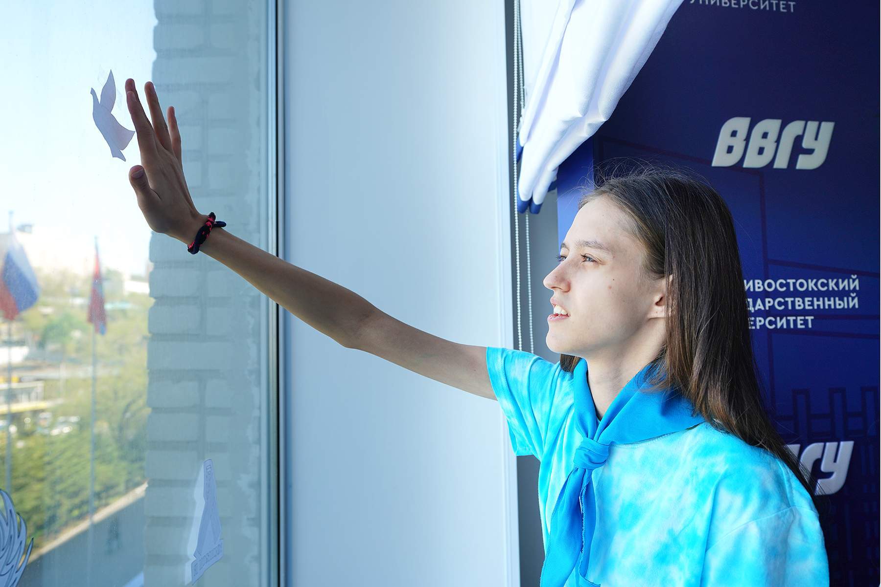 Акция направлена на сохранение памяти о ключевых исторических событиях и подвигах героев войны. Для участия в проекте сотрудники и студенты ВВГУ вырезали главные символы Победы: белых голубей, Вечный огонь, георгиевские ленточки. Далее изображения разместили на окнах университета.