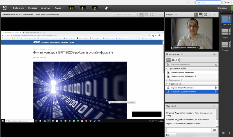11 мая состоялся онлайн-инструктаж участников финала с применением программного обеспечения для веб-конференций Adobe Acrobat Connect. Во время инструктажа доцент кафедры информационных технологий и систем Ивин Вячеслав Вадимович рассказал участникам установочного вебинара о процедуре проведения финала Конкурса ISFIT, о там как заполнить Карточку участника и разместить решёные задачи в облачном хранилище, а также напомнил перечень тем, вынесенных на финальное задание.