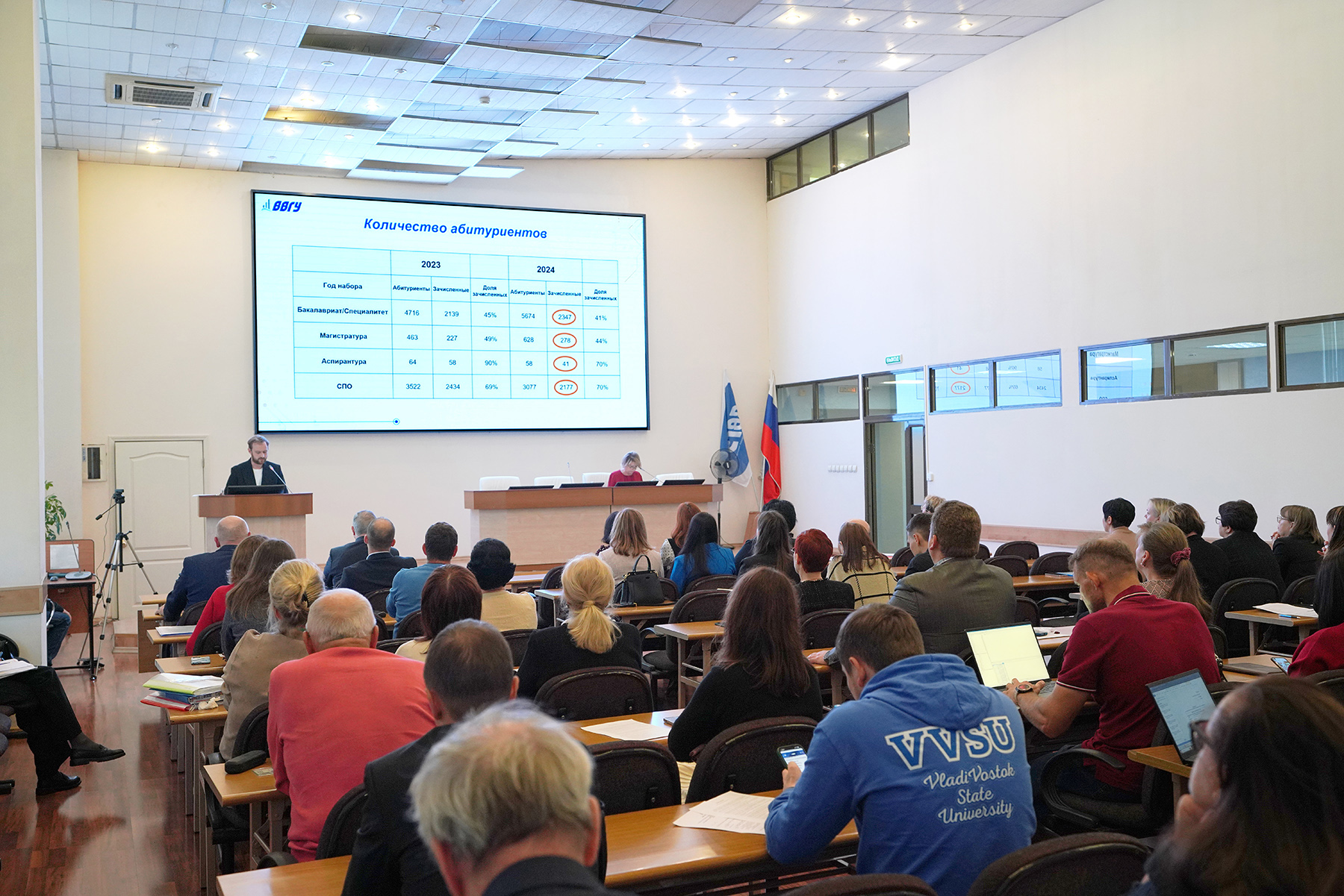 C докладом об итогах набора абитуриентов в 2024-2025 учебном году выступил заместитель ответственного секретаря приёмной комиссии, руководитель Центра по работе со школьными сообществами Артём Попутько. Подразделение занимается подготовкой будущих абитуриентов к поступлению в вуз. Выступающий привёл статистику по приёмной кампании 2024 года. В 2024 году приёмной комиссией вуза было принято 27283 заявления (в 2023 году – 18096) и 8916 абитуриентов (в 2023 году – 8709). В разрезе направлений среднего и высшего образования доля зачисленных студентов выросла. Темп роста по программе СПО вырос на 5,80 %, по программам высшего образования увеличился на 31, 40 %. Отмечается рост заявлений, поданных иностранными абитуриентами – 493 (в 2023 году – 274), в вуз обратился 241 абитуриент (в 2023 году – 171), зачислено 202 студента (в 2023 году – 164). Процент субъектов от набора 2024 года повысился на 14,5 % по сравнению с 2023 годом (13.3 %). В настоящее время ВВГУ занимает в Приморье второе место по количеству бюджетных мест и составляет 783 места.