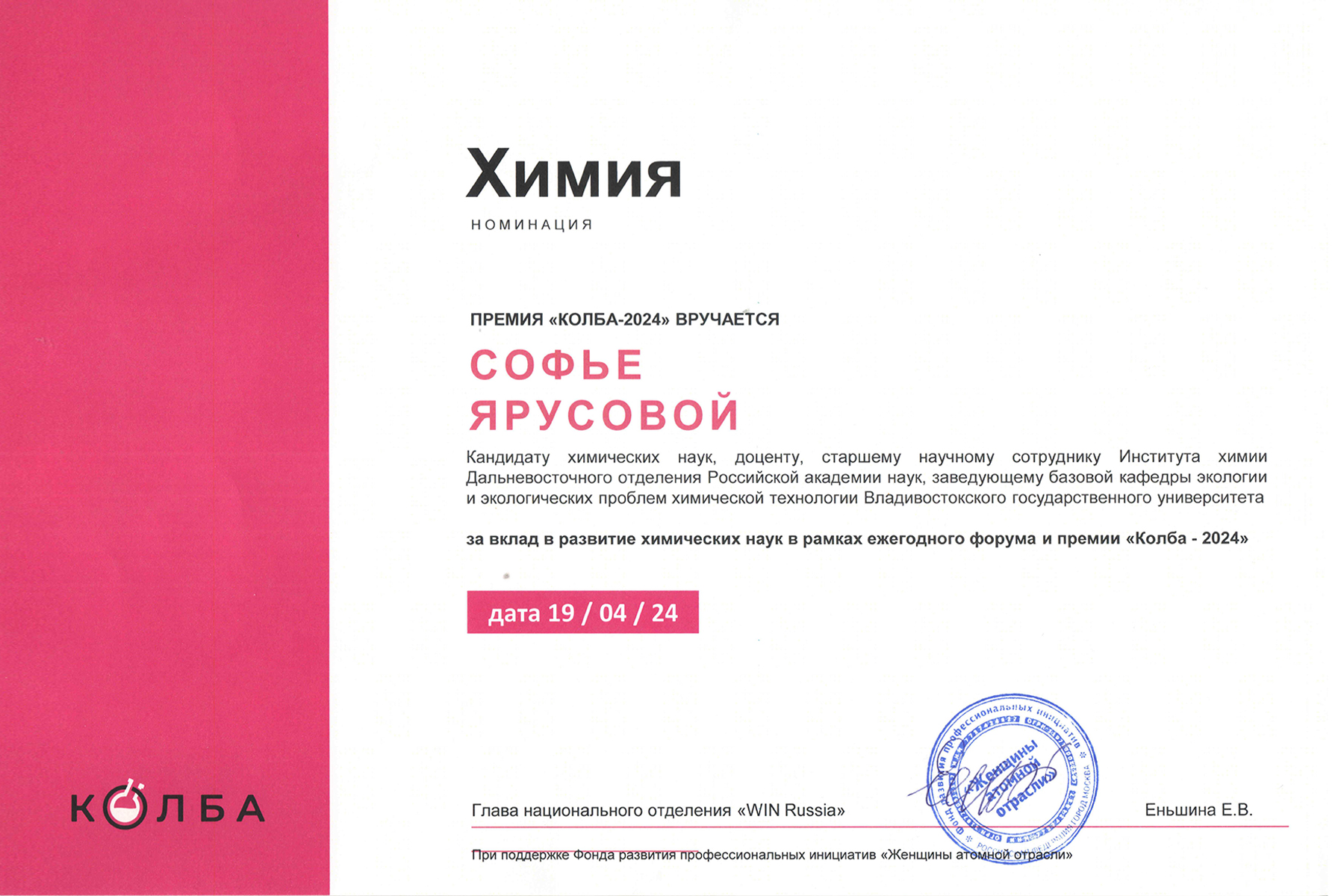 Заведующая базовой кафедрой экологии и экологических проблем химической технологии ВВГУ Софья Ярусова стала лауреатом Премии «Колба-2023» в номинации «Химия».