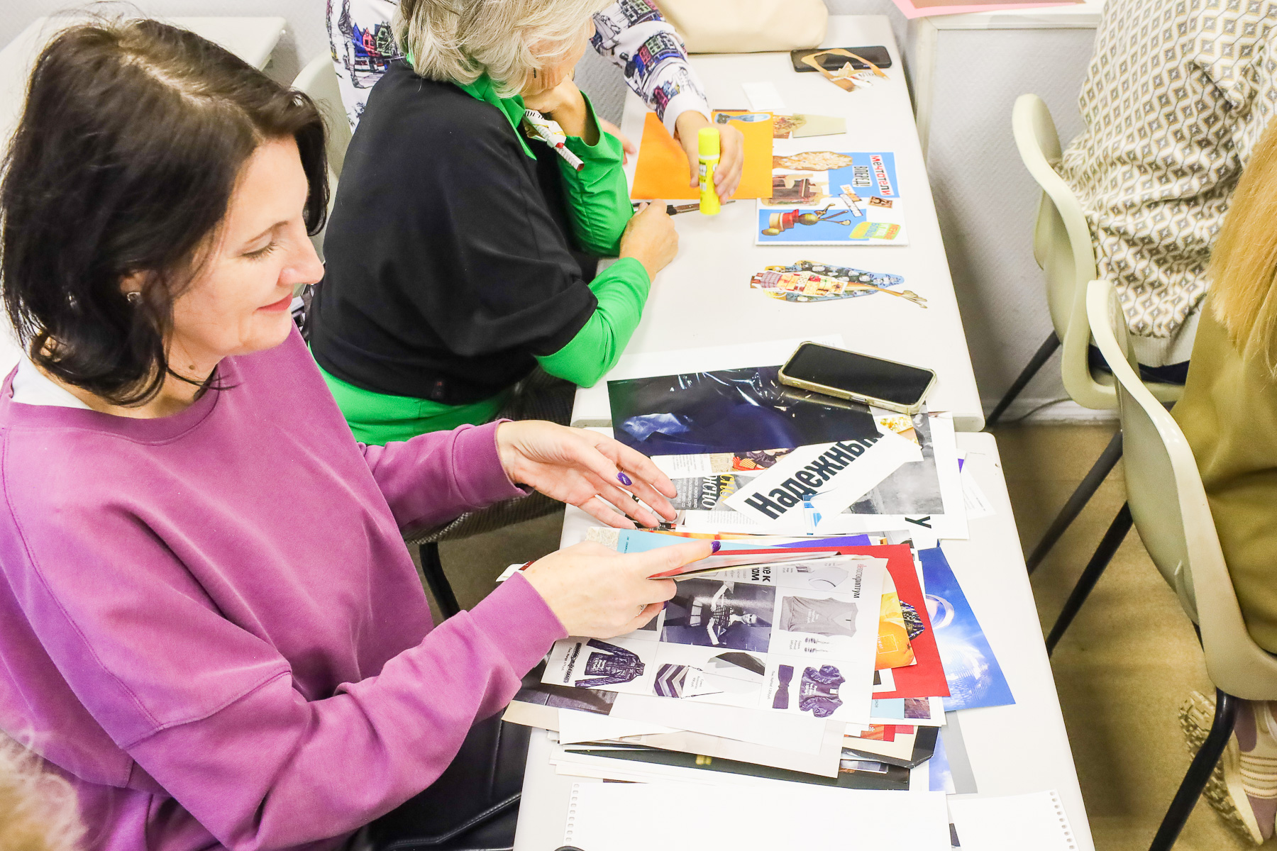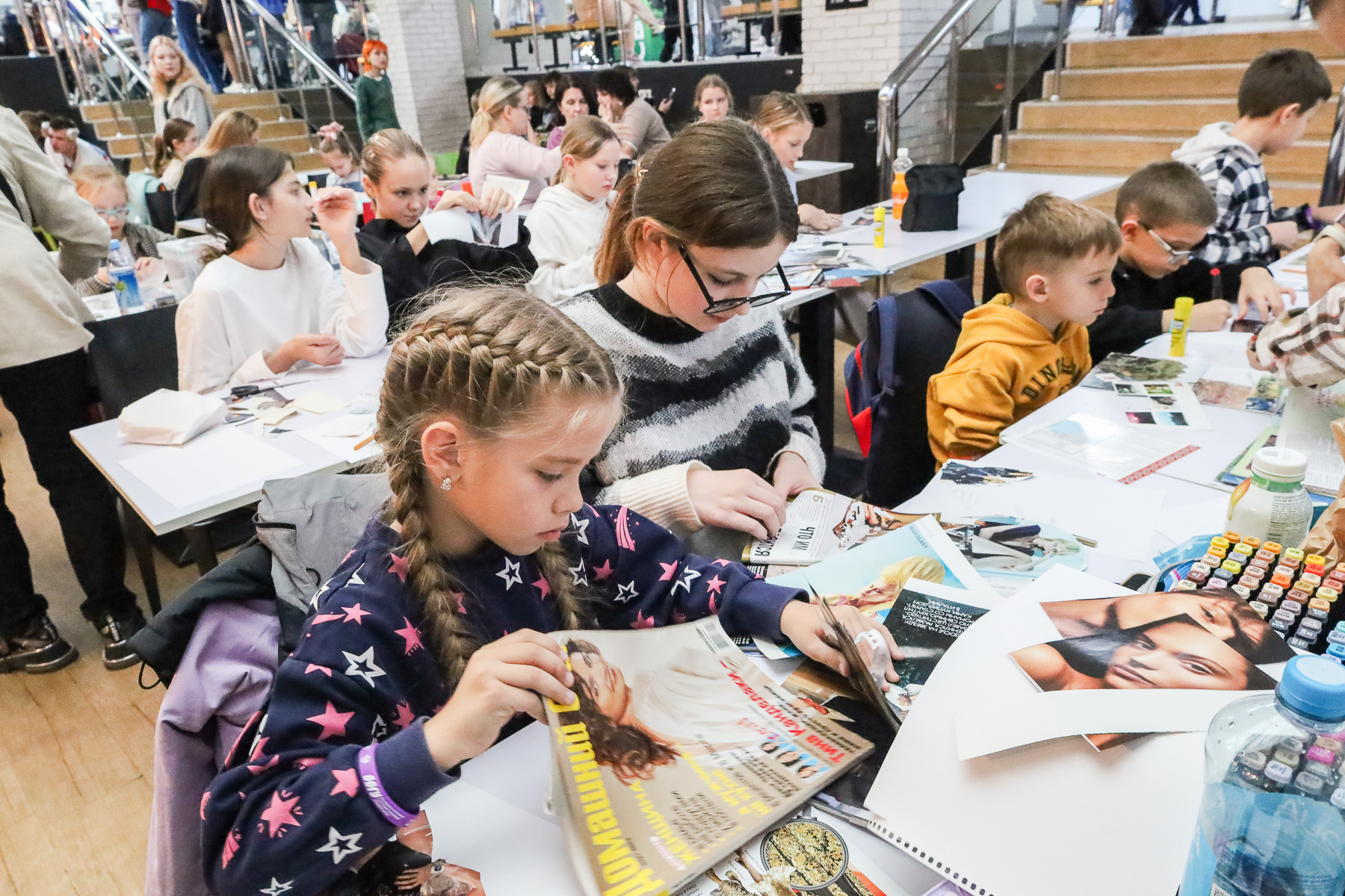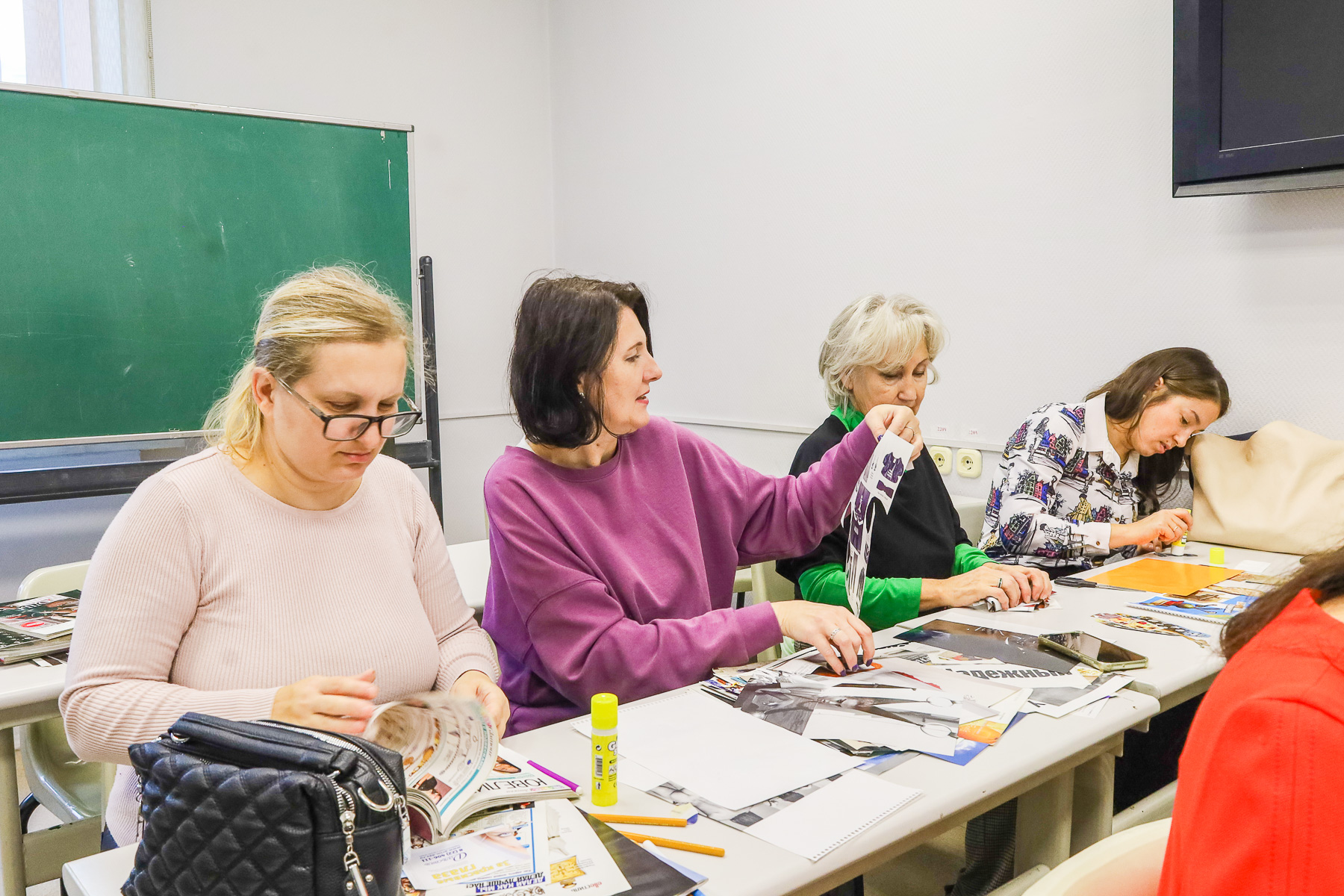 Также был проведён мастер-класс для родителей. Под руководством преподавателя Колледжа индустрии моды и красоты Альбины Макаренко родители будущих абитуриентов обучались созданию рекламных плакатов с помощью коллажирования.