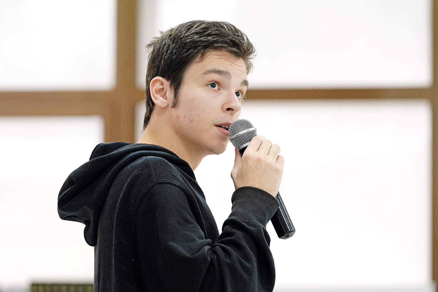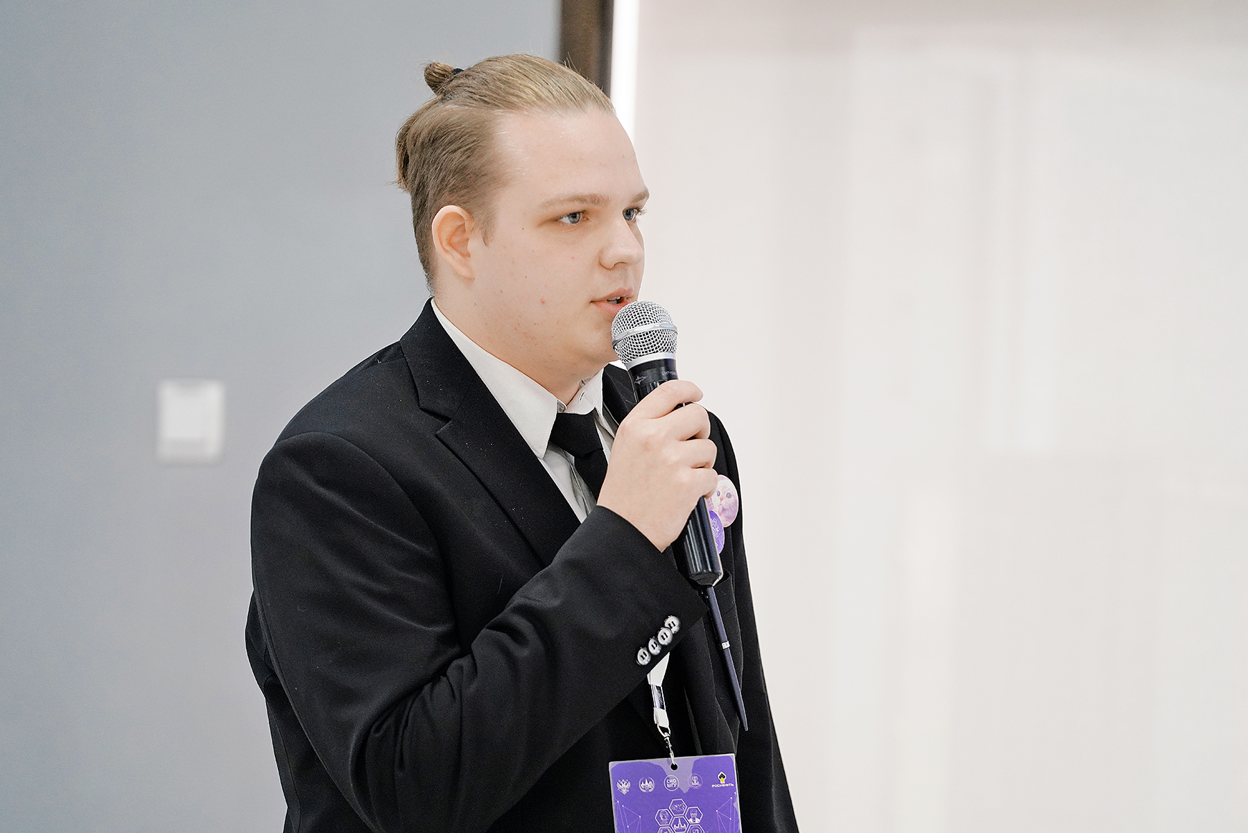 После выступил студент 2 курса кафедры экономики и управления Максимилиан Подакин. Он изложил свои идеи по развитию СНО на ближайший год, отметив своё участие в различных научных проектах.