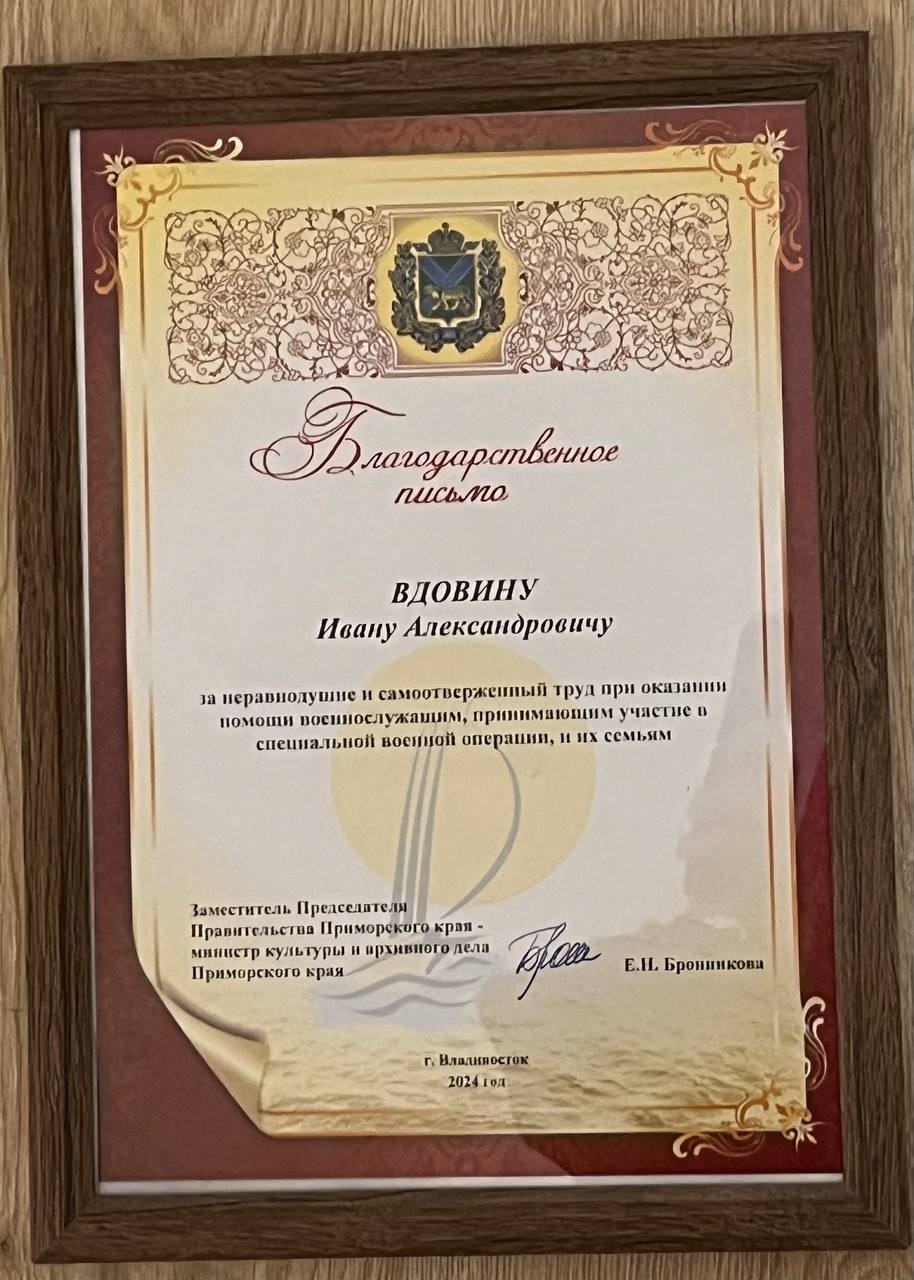 Заместитель председателя правительства Приморского края, министр культуры и архивного дела Приморского края Елена Бронникова вручила студенту Института международного бизнеса, экономики и управления Ивану Вдовину благодарственное письмо. Второкурсника ВВГУ наградили за его неравнодушие и самоотверженный труд в оказании помощи военнослужащим, участвующим в специальной военной операции, а также их семьям.