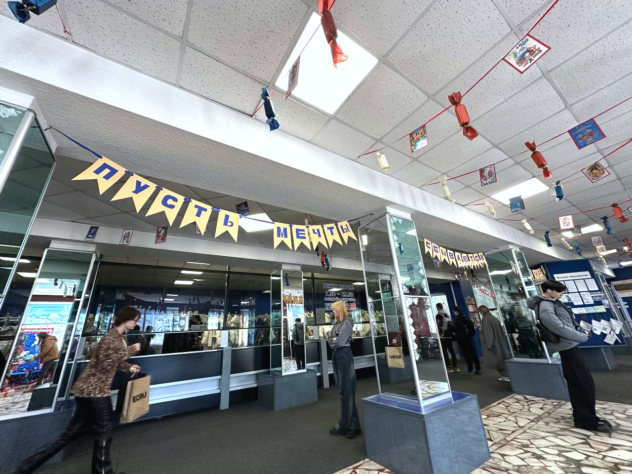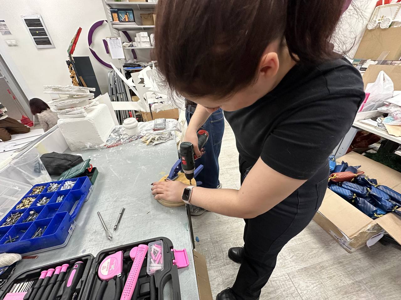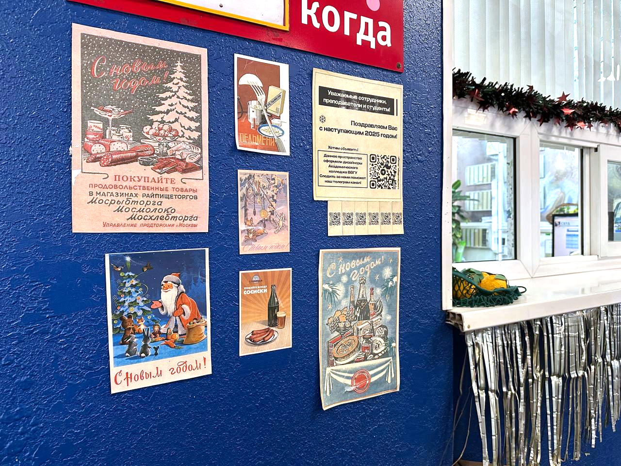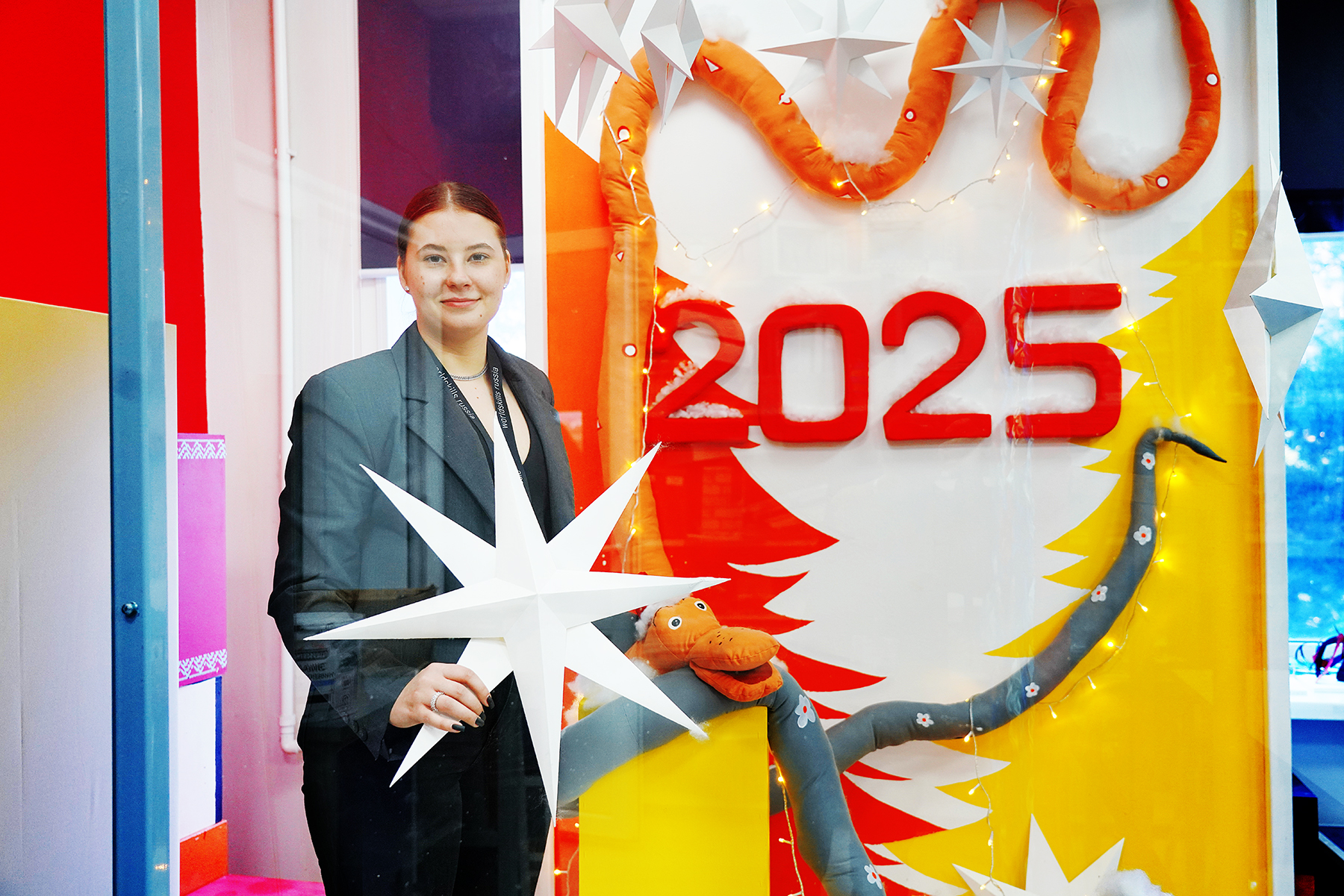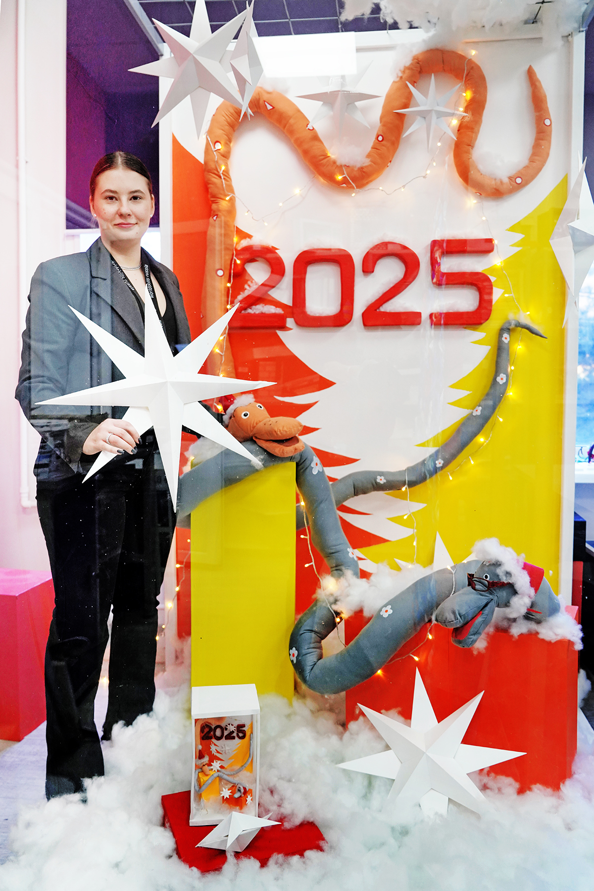 «В детстве Новый год был всегда мягким, атмосферным, праздничным. А детство наше проходило в 90-е и 00-е. Нам очень хотелось перенести студентов снова в тот самый праздник из детства – в постсоветский Новый год. Плюс в мире дизайна эта тематика сейчас в тренде», – рассказывает о выборе темы для новогодних декораций Ульяна Кислюкова, преподаватель Академического колледжа.