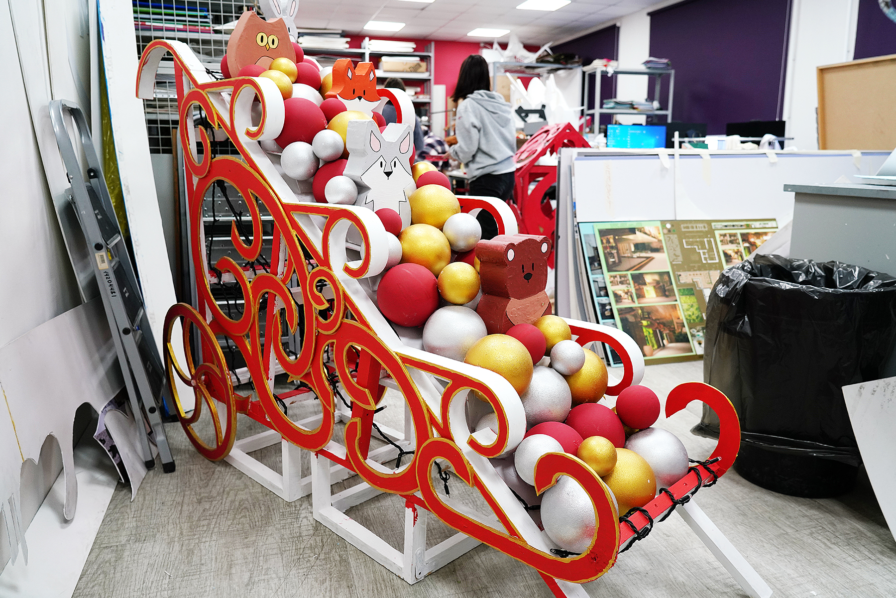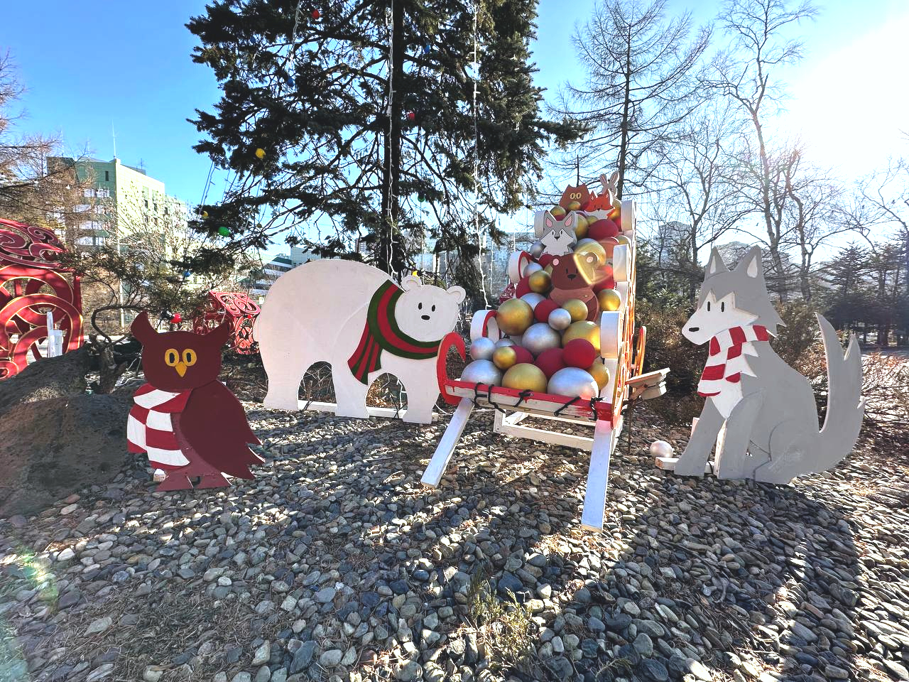 По словам Ульяны Кислюковой, самая сложная задача предстояла студентам, которые работали с улицей. Конструкции должны быть крепкими и выдержать любые погодние условия, свойственные изменчивому климату Владивостока. Ребята изготовили и оформили сани, укрепили их, покрасили, изготовили дома, декорировали шары, которыми украсили ель у главного входа в вуз, провели подсветку, которая после захода солнца переливается разными цветами. Кроме того, студенты решили сделать животных – изначально в концепции их не было.