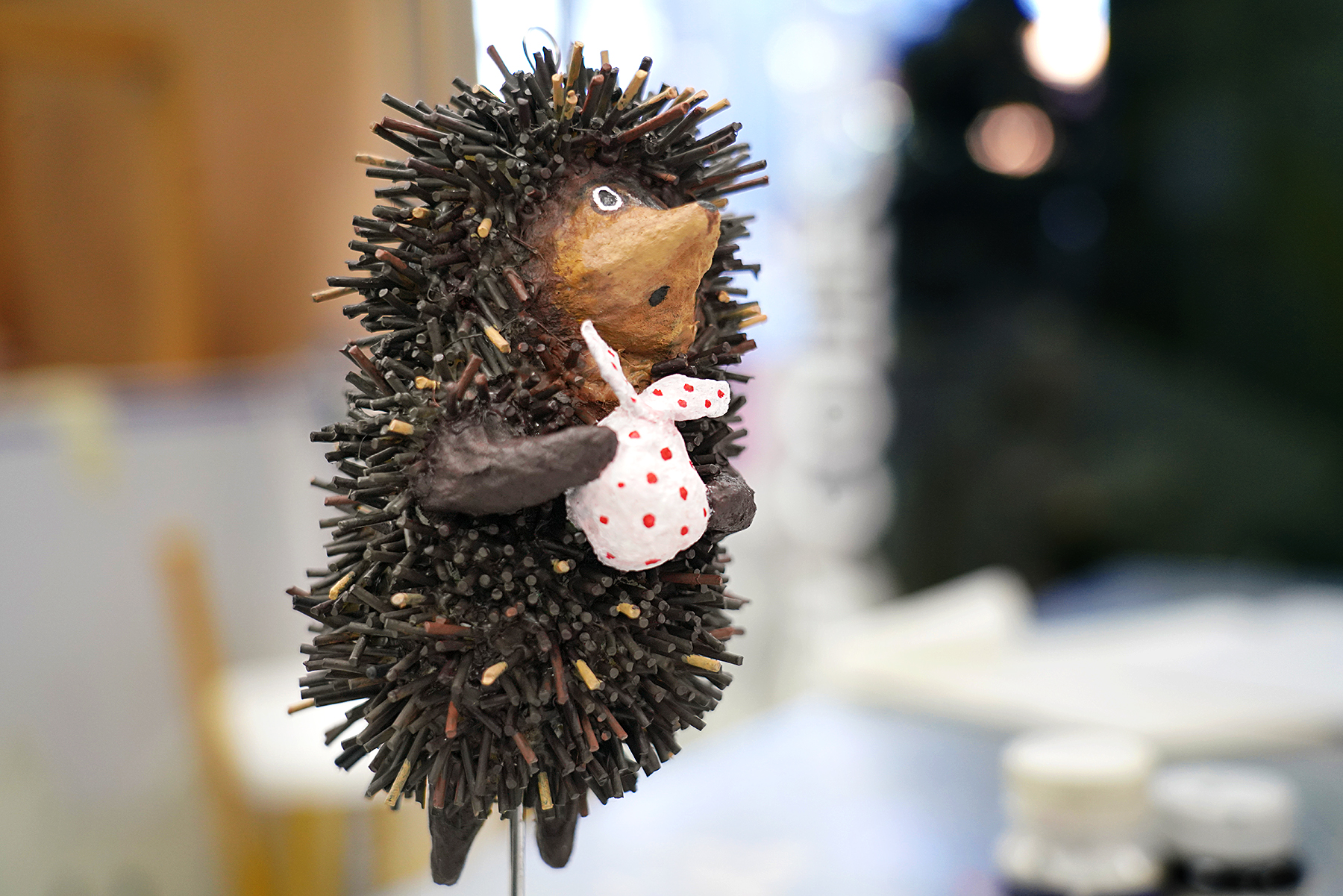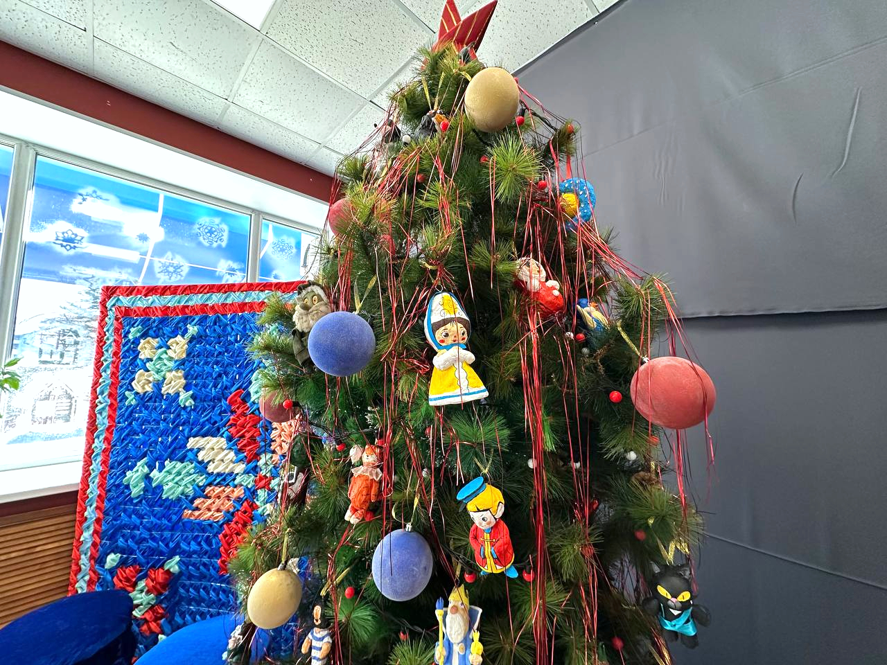 И как же без елки? Ребята нарядили и ее. Игрушки – это персонажи любимых мультфильмов, которых студенты также изготовили сами. Рядом с зеленой красавицей стоят табуретки, которые помогают почувствовать себя уже за праздничным столом, за просмотром новогодних фильмов и программ в кругу семьи.