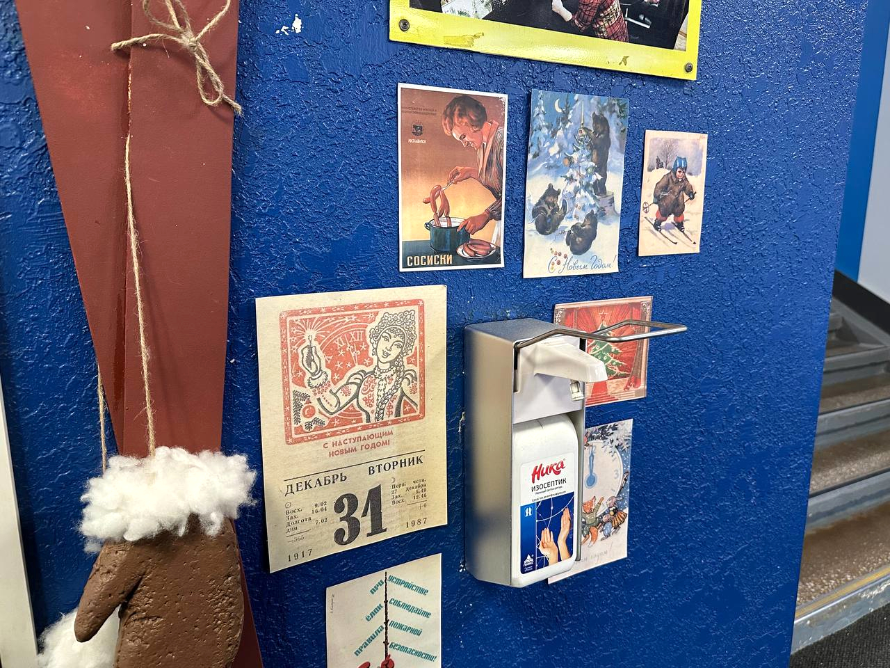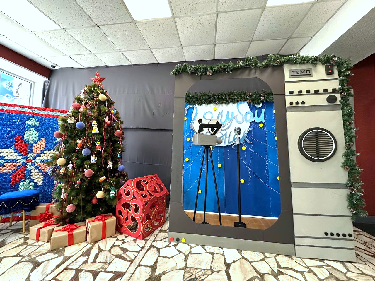 Непростой работой был и ковер ручной работы, который плели две недели. Пост охраны оформили в виде старого отделения почты. Несколько человек работали над телевизором – неотъемлемой частью Нового года в каждой постсоветской семье. Зона позволяет почувствовать себя в телевизоре – можно и постоять за камерой, и спеть в микрофон, как звезда «Голубого огонька», и буквально побывать в телевизоре, в виде которого оформлена фотозона.