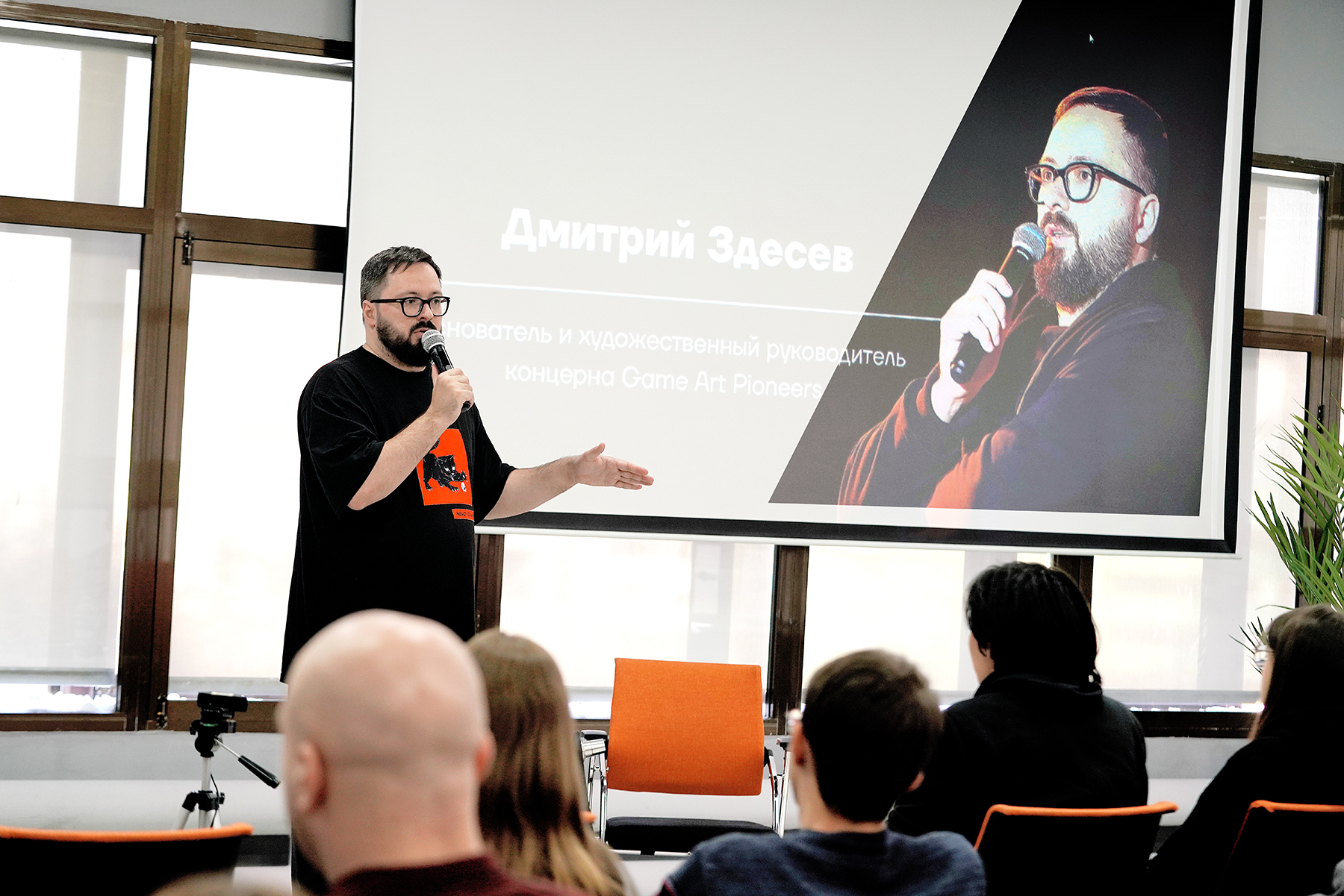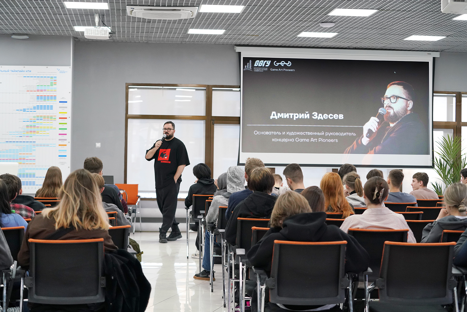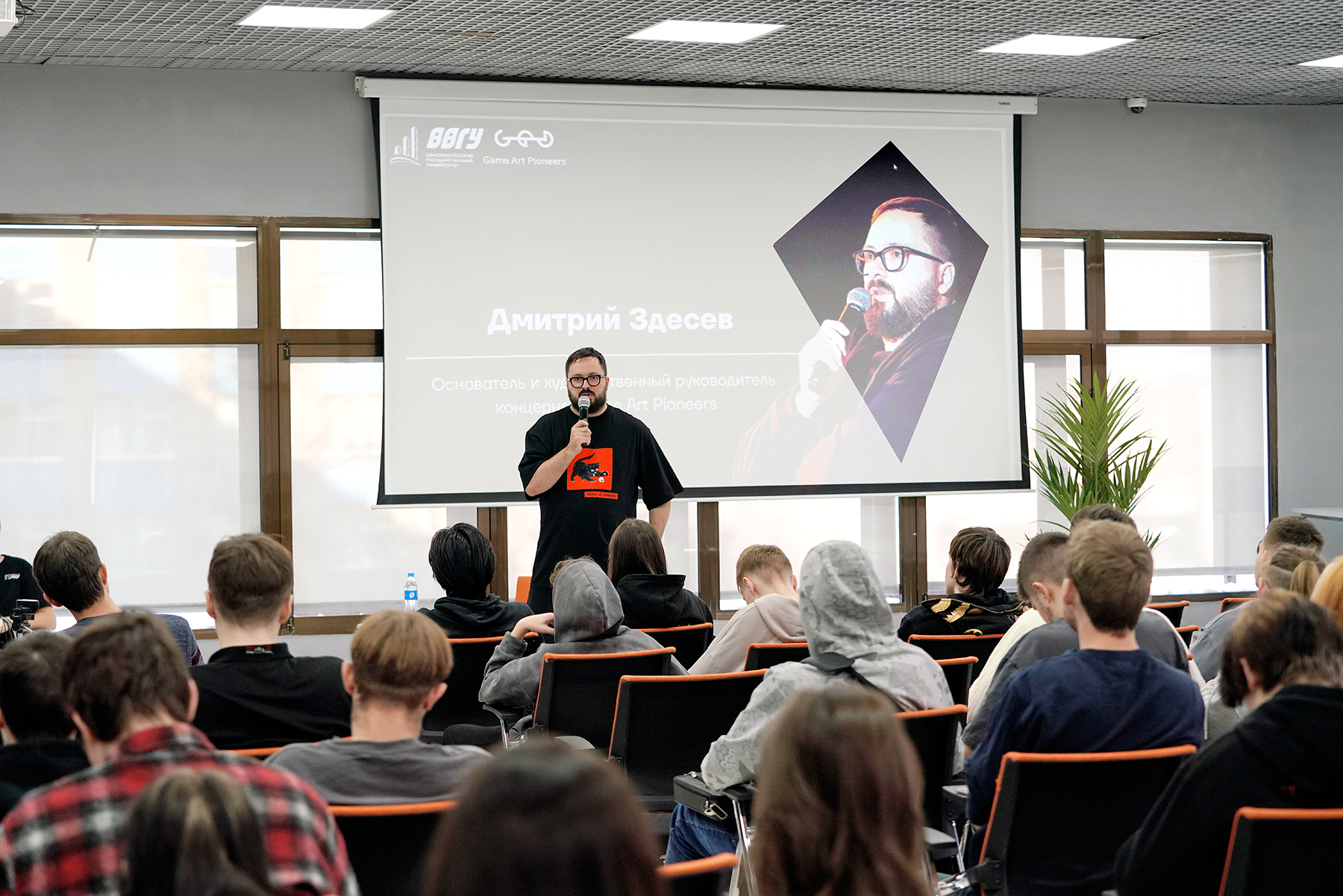 Он поделился с гостями своей историей развития в игровой индустрии. Дмитрий Здесев на примерах студентов разобрал, какой вклад они могут внести в профильную отрасль. Отвечая на вопросы учащихся, основатель Game Art Pioneers обозначил шаги, которые помогут молодёжи протоптать свой путь в перспективное будущее.