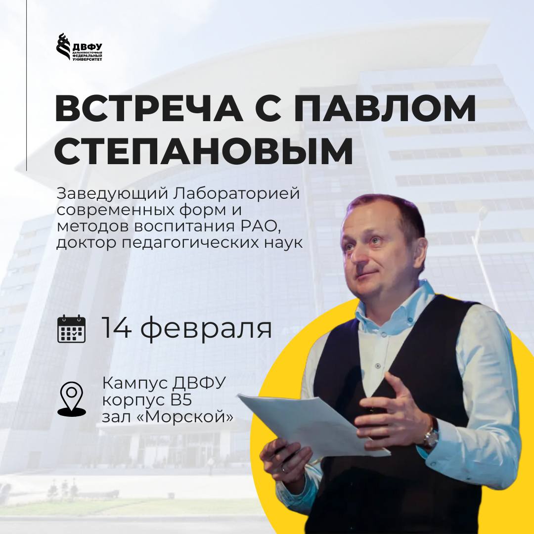 4 февраля в пятницу в Морском зале ДВФУ для студентов и преподавателей прошли мероприятия с участием заведующего лабораторией современных форм и методов воспитания Российской академии образования, доктора педагогических наук Павла Валентиновича Степанова.