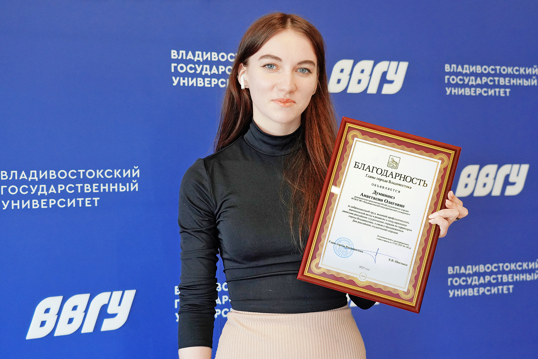 Благодарность главы города Владивостока Константина Шестакова вручили Анастасии Думиникэ, студентке колледжа индустрии моды и красоты. Не первый год учащаяся трудится в рядах студенческих отрядов ВВГУ. Девушка прошла путь от простого бойца до руководителя пресс-центра университетского штаба.