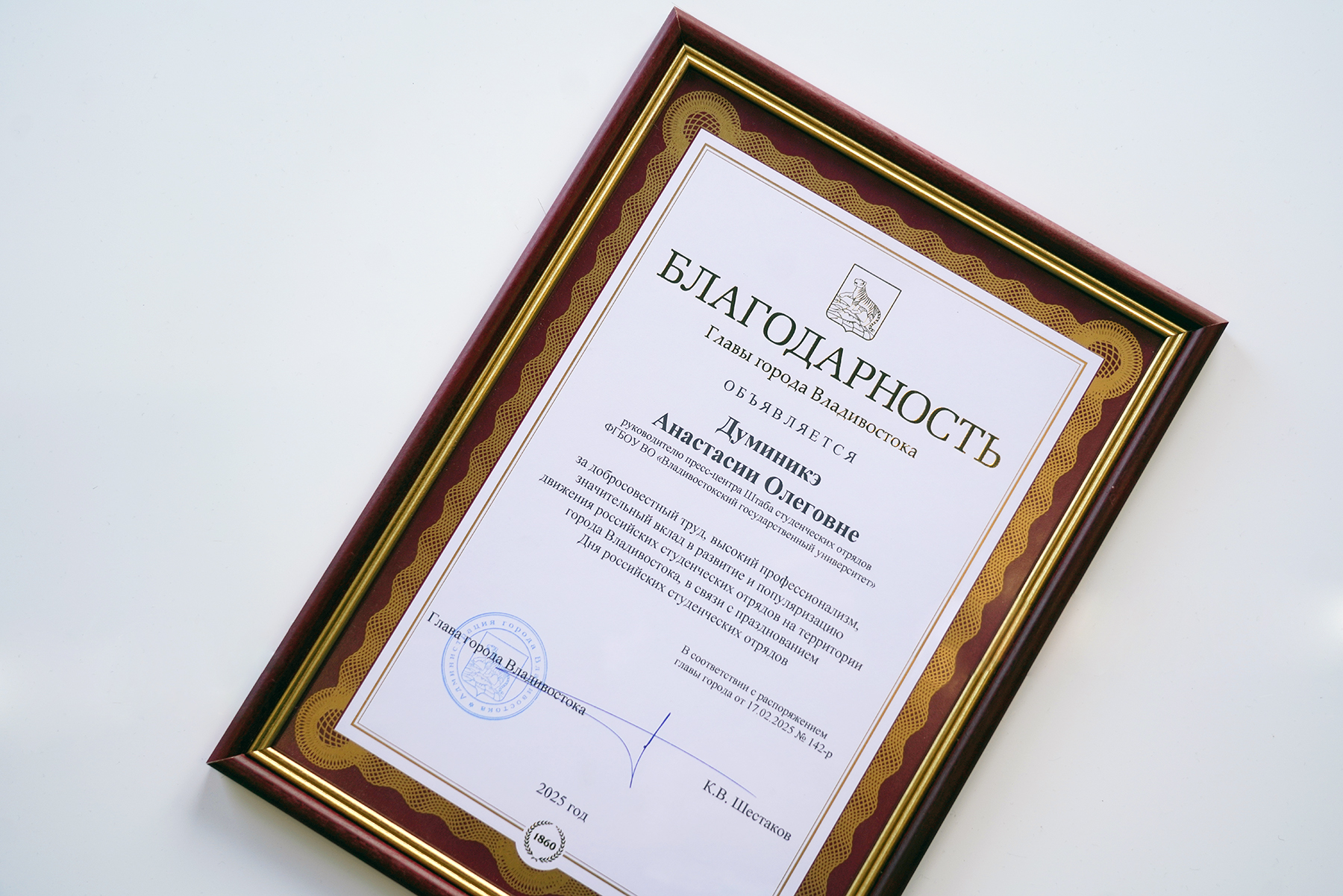 Глава города Константин Шестаков отметил значительный вклад Анастасии в развитие и популяризацию движения российских студенческих отрядов на территории Владивостока и всего Приморского края.