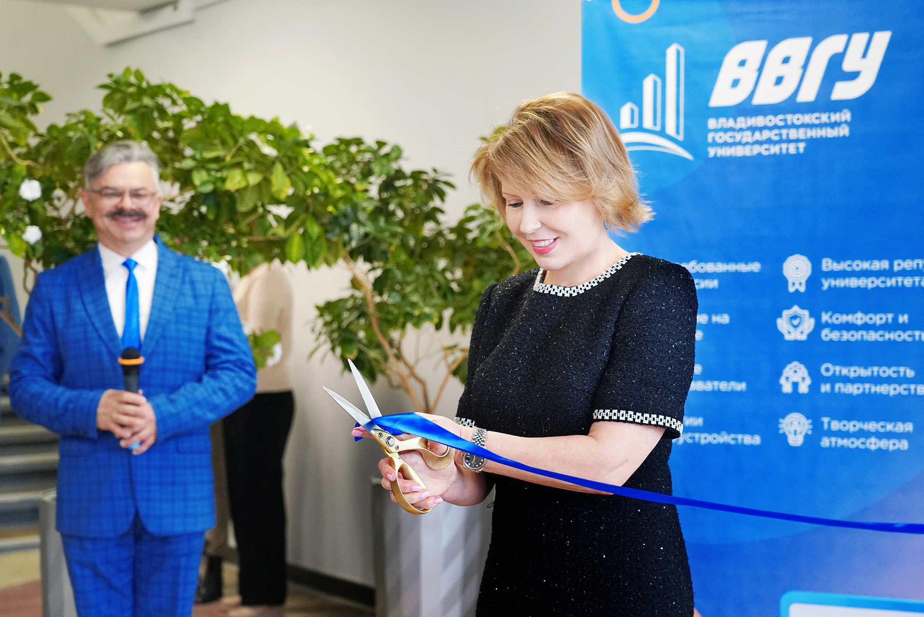 Во Владивостокском государственном университете состоялось торжественное открытие новой аудитории №1457. Почетное право перерезать символическую синюю ленточку предоставлено ректору ВВГУ доктору экономических наук, профессору Татьяне Терентьевой. В своем выступлении на церемонии открытия ректор ВВГУ подчеркнула важность модернизации инфраструктуры для студентов и преподавателей.