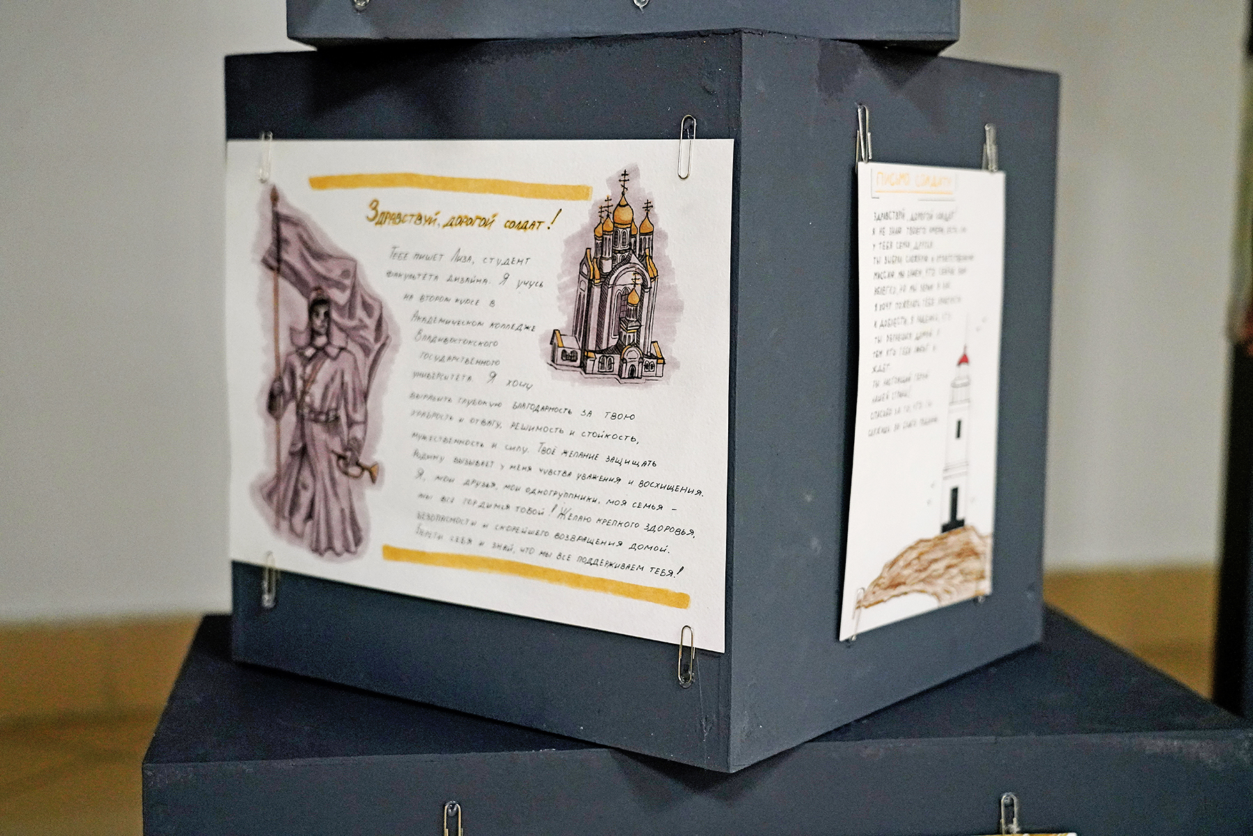 Студенты-дизайнеры, после посещения выставки ко Дню Победы в музее истории Дальнего Востока имени В.К. Арсеньева, где вдохновились фронтовыми письмами, под руководством преподавателей Татьяны Баишевой, Ольги Туговиковой, Оксаны Петровой создали 20 рисунков-писем солдатам СВО.