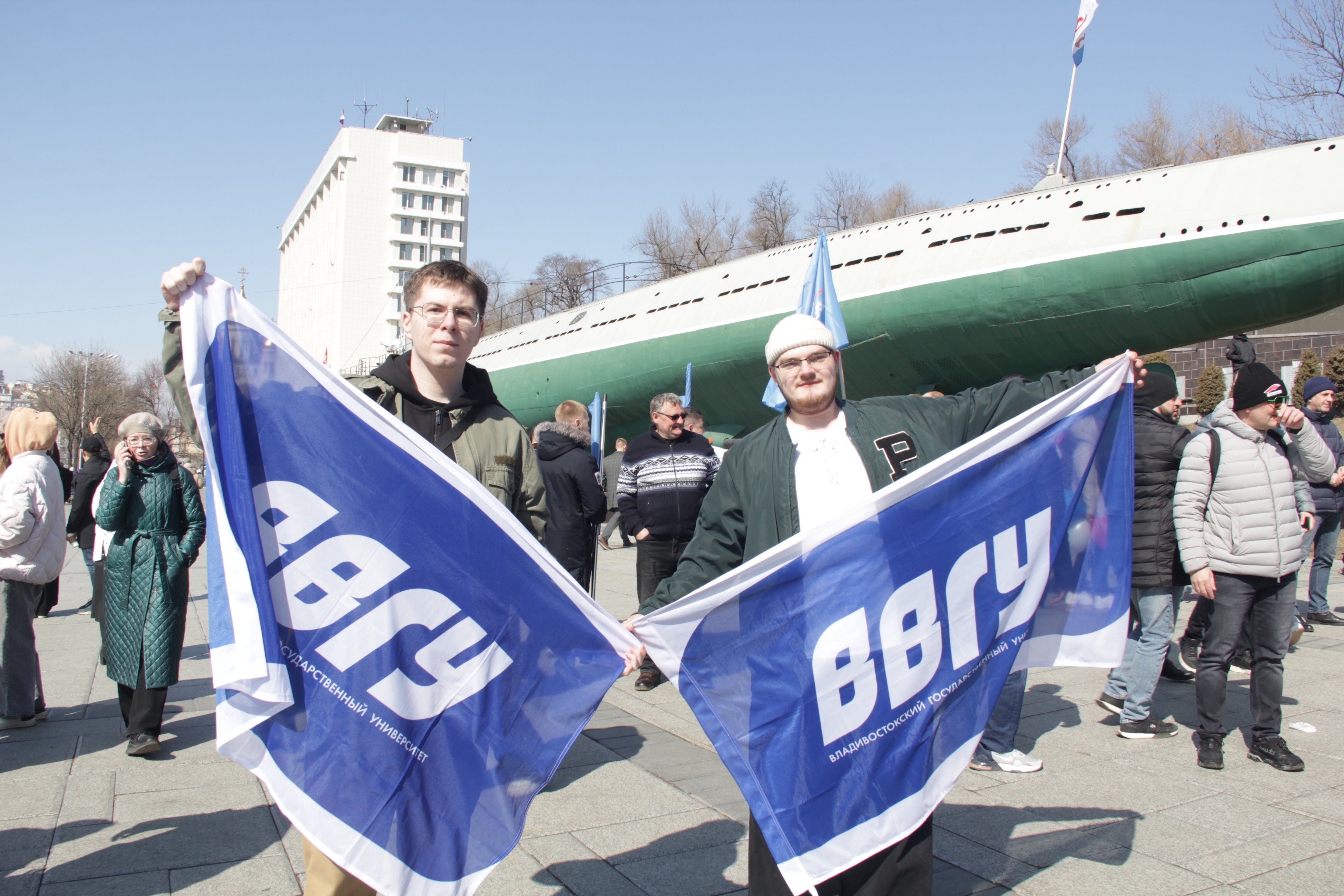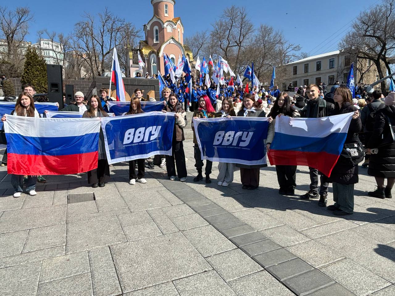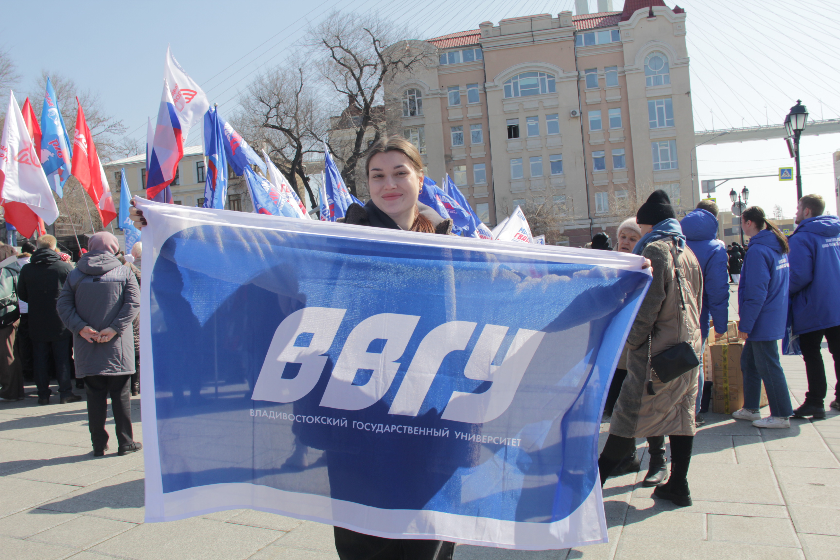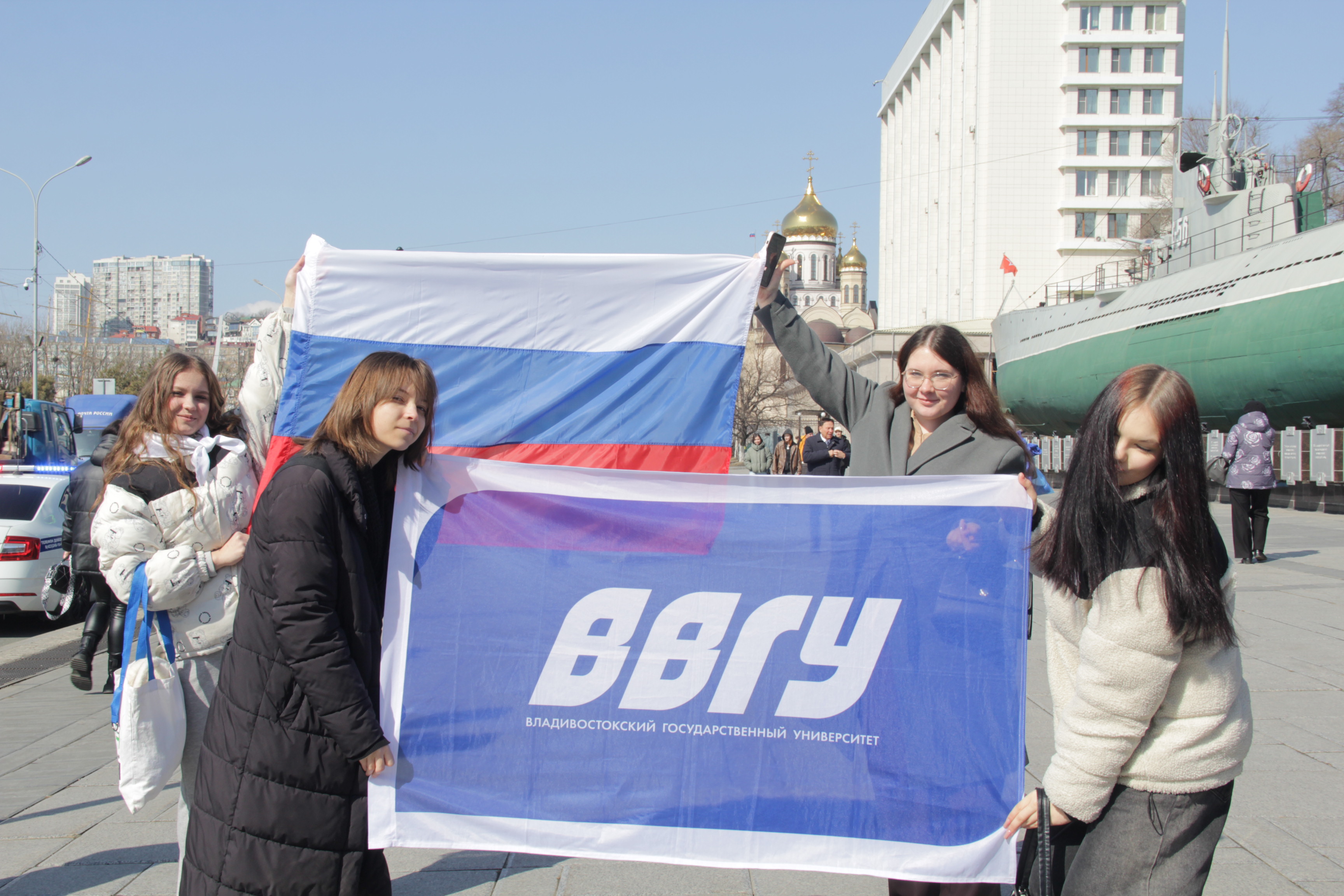 Студенты и сотрудники ВВГУ приняли участие в митинг-концерте ко Дню воссоединения Крыма с Россией. Масштабное мероприятие объединило во Владивостоке ветеранов, общественников и молодёжь со всего Приморья.
