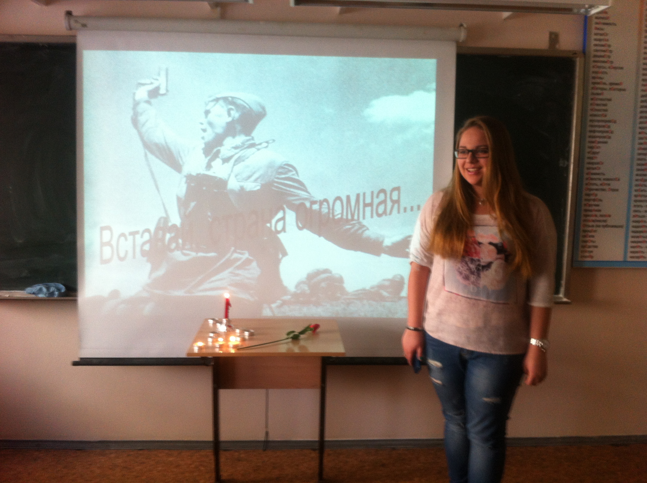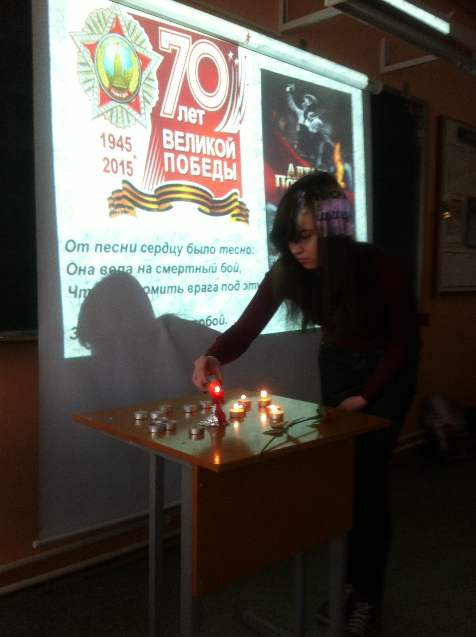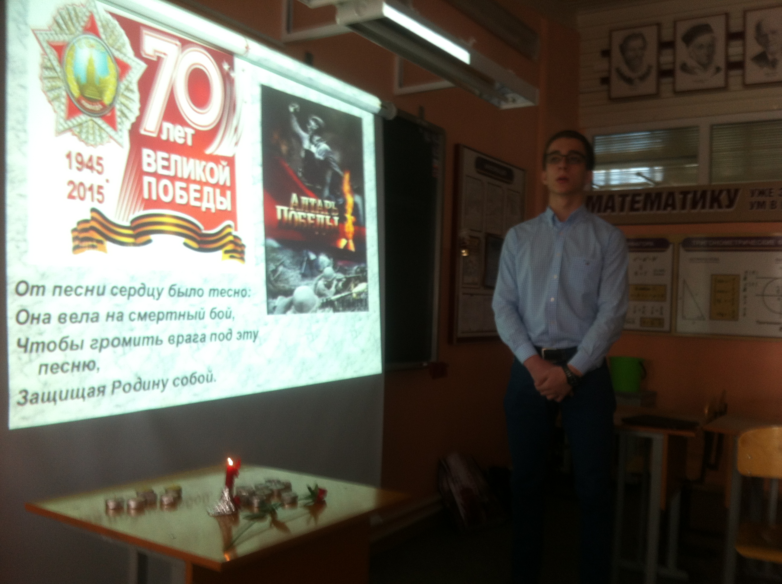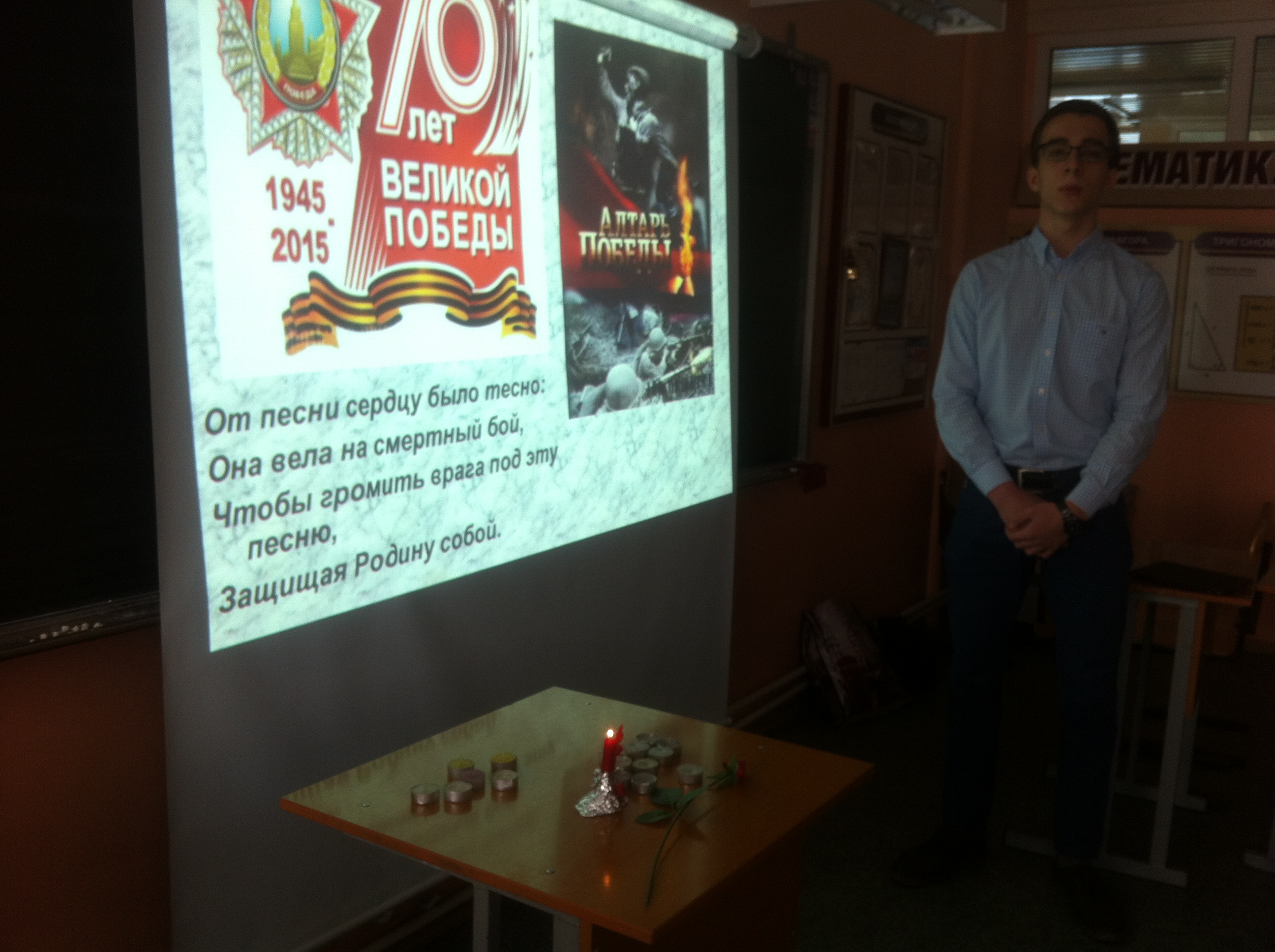 «Памяти Великой войны…» Именно так назывался урок литературы в 11-х классах. Звучали стихи поэтов, прошедших войну, откликнувшихся на это страшное событие: Исаковского, Джалиля, Твардовского, Симонова, Дегена, Друниной, Орлова и других. Их боль и память отозвалась в сердцах старшеклассников. Вспомнили на уроке и песни военных лет. Приятно, что строки этих песен знакомы одиннадцатиклассникам. А это значит, что память о великом подвиге народа сохранится в поколениях. Как сказали сами ребята, «мы обязательно будем рассказывать нашим детям и внукам о Великой Отечественной войне: «Никто не забыт и ничто не забыто» (О.Берггольц). Горели свечи памяти на уроке, была минута молчания… Всё это стало для ребят осмыслением Победы и ее роли в жизни нашего народа.