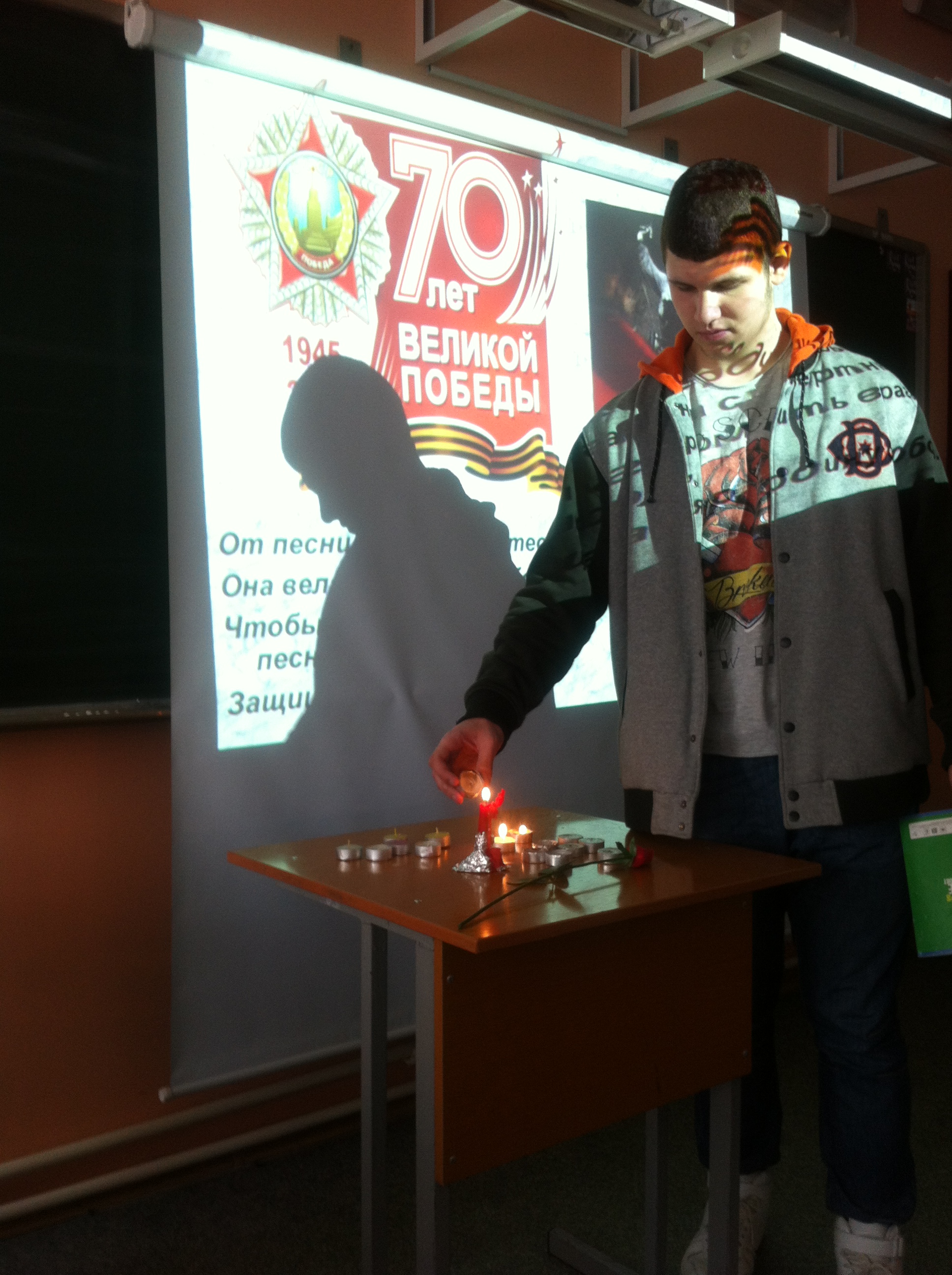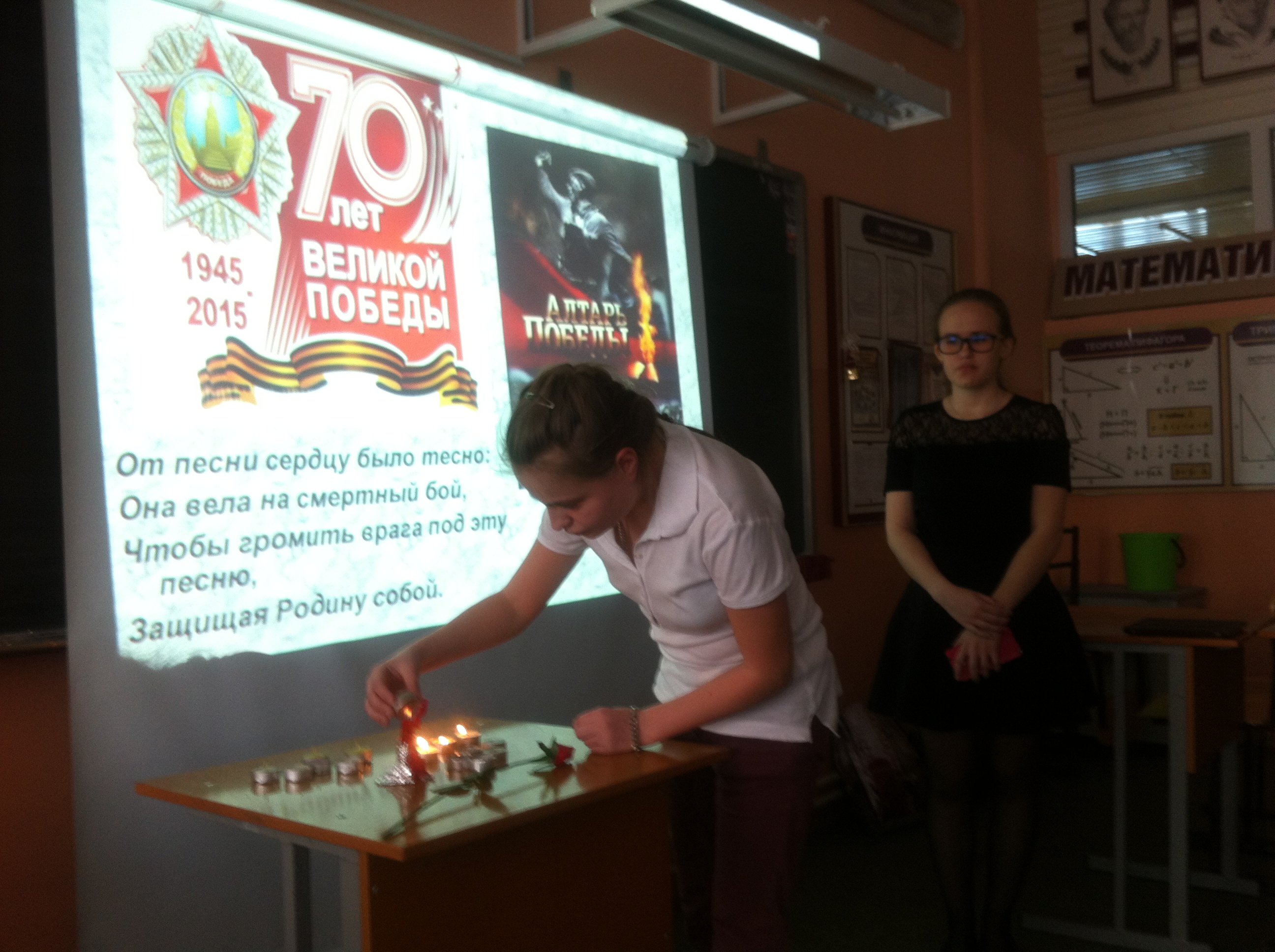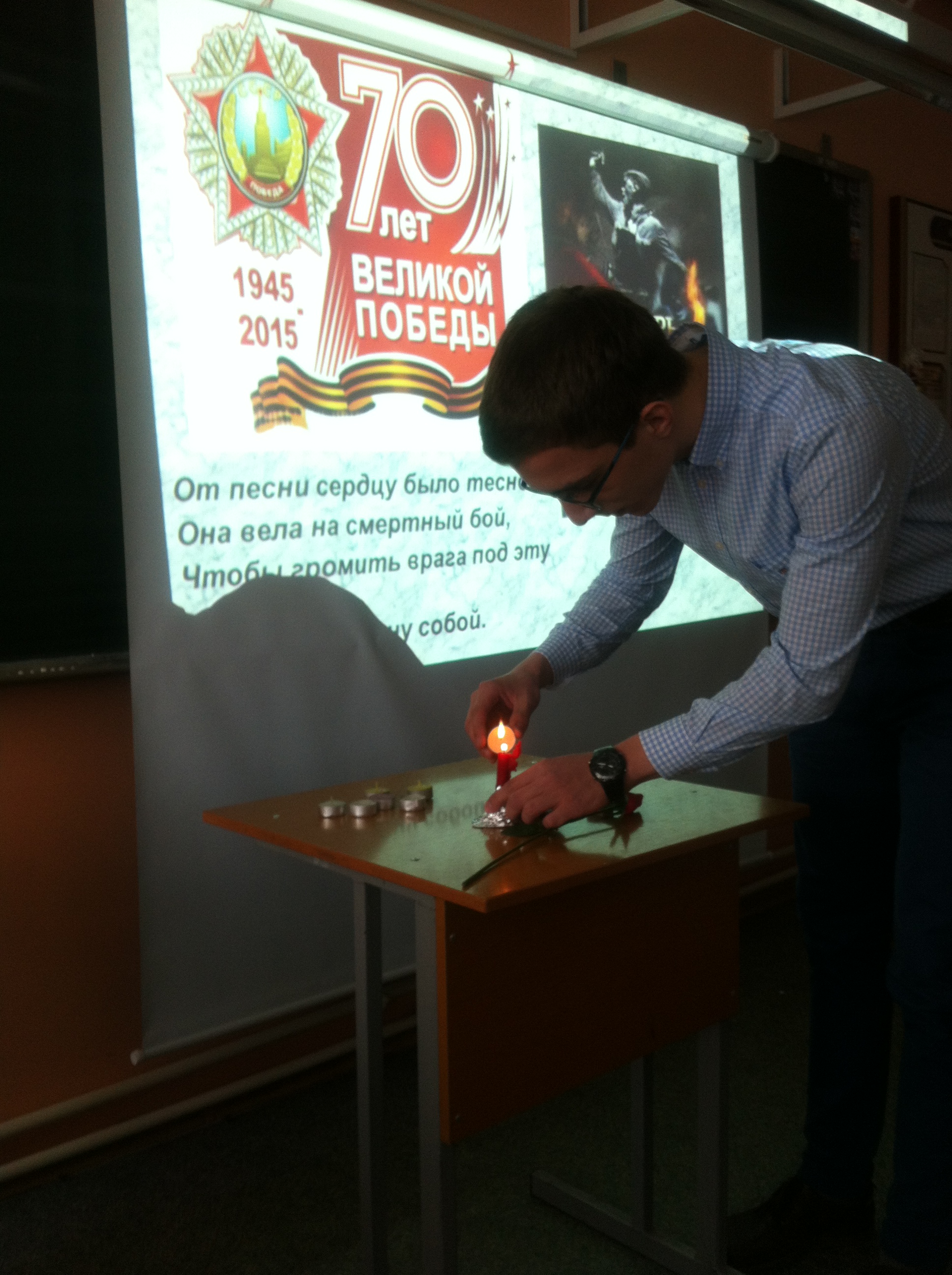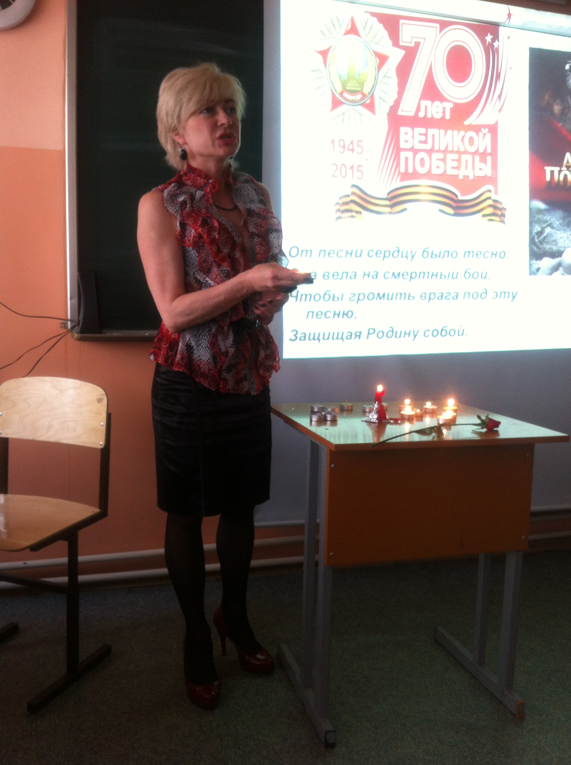 «Памяти Великой войны…» Именно так назывался урок литературы в 11-х классах. Звучали стихи поэтов, прошедших войну, откликнувшихся на это страшное событие: Исаковского, Джалиля, Твардовского, Симонова, Дегена, Друниной, Орлова и других. Их боль и память отозвалась в сердцах старшеклассников. Вспомнили на уроке и песни военных лет. Приятно, что строки этих песен знакомы одиннадцатиклассникам. А это значит, что память о великом подвиге народа сохранится в поколениях. Как сказали сами ребята, «мы обязательно будем рассказывать нашим детям и внукам о Великой Отечественной войне: «Никто не забыт и ничто не забыто» (О.Берггольц). Горели свечи памяти на уроке, была минута молчания… Всё это стало для ребят осмыслением Победы и ее роли в жизни нашего народа.