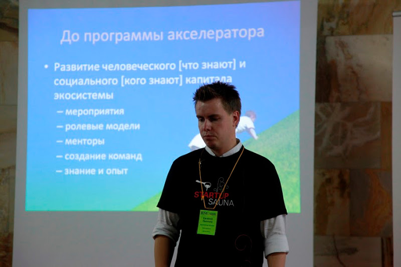 Евгений Пелтола рассказал о том, как работает один из лучших в мире студенческих Бизнес-акселераторовStartupSauna, основателем которого он является. Сейчас Финляндии необходимо создание 200 тысяч новых рабочих мест. Акселератор должен способствовать созданию и развитию новых компаний, таким образом, помогая в решении этих проблем. Для вовлечения активной молодежи используются яркие ролики, демонстрирующие обстановку внутри акселератора. Кроме того, что участие для студентов является бесплатным, запускаются такиемотиваторы, как статусность, репутация, влияние. За этим сейчас стремится молодежь.