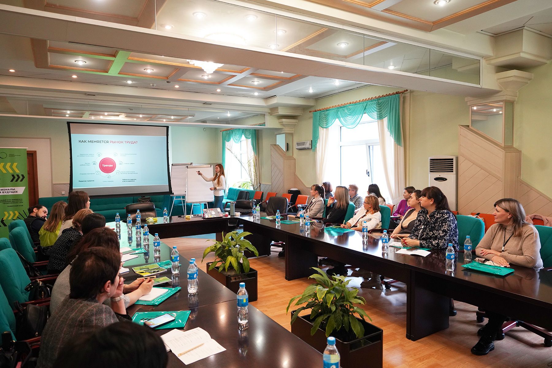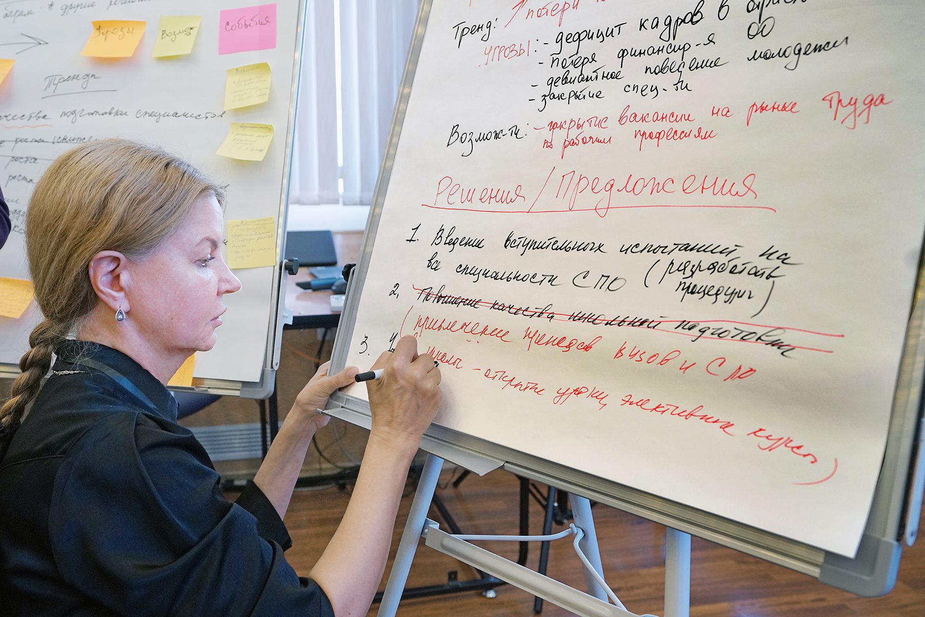 Во второй день мероприятия прошла форсайт-сессия по отраслевому принципу «Образ будущего отрасли: как к нему двигаться». Участники старались определить перечень востребованных и перспективных компетенций и навыков в секциях: «Туризм и сфера услуг», «Производство, транспорт и логистика», «Строительство», «Социальная сфера». Целью было получить формализованный запрос от бизнес-сообщества к системе профессионального образования.