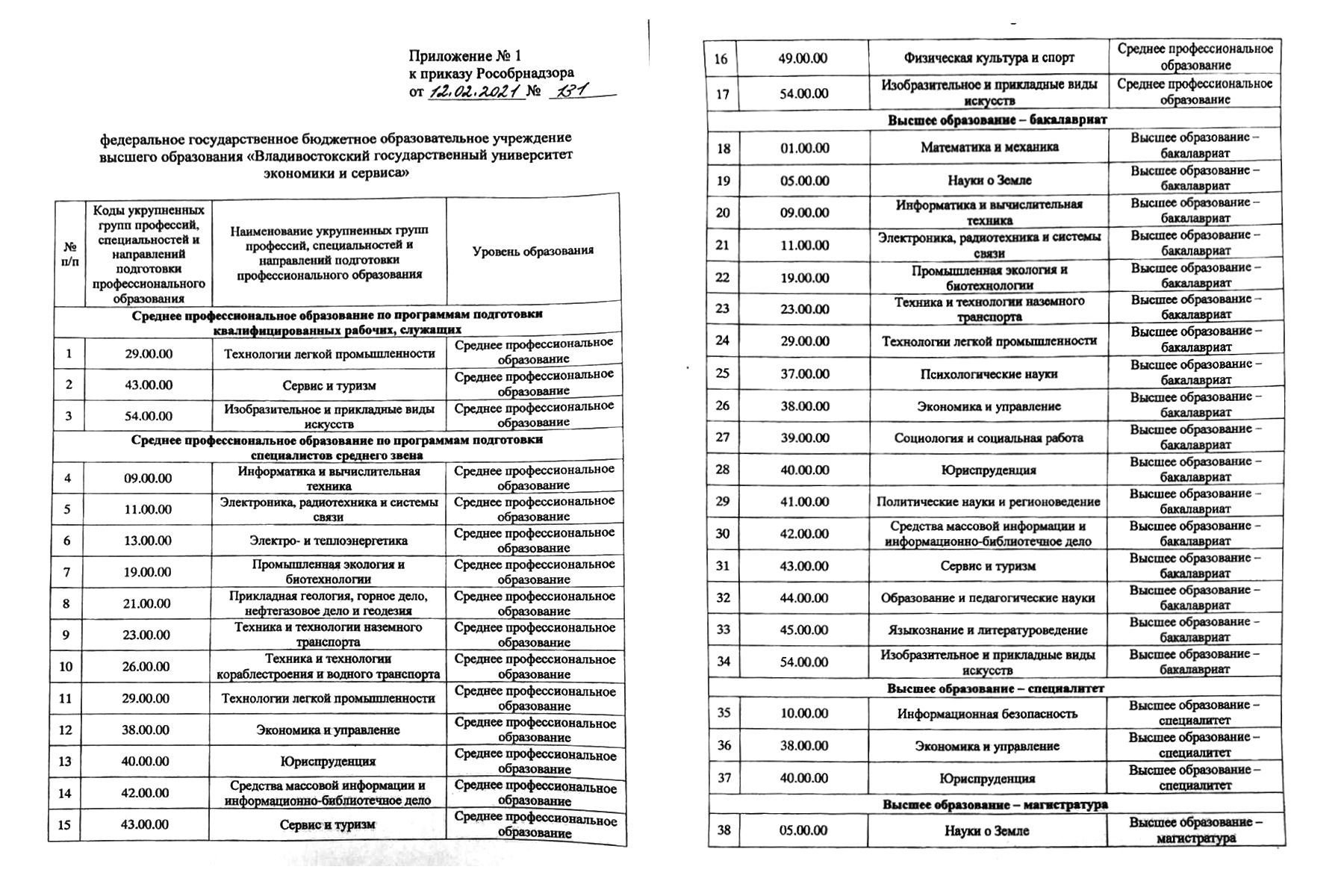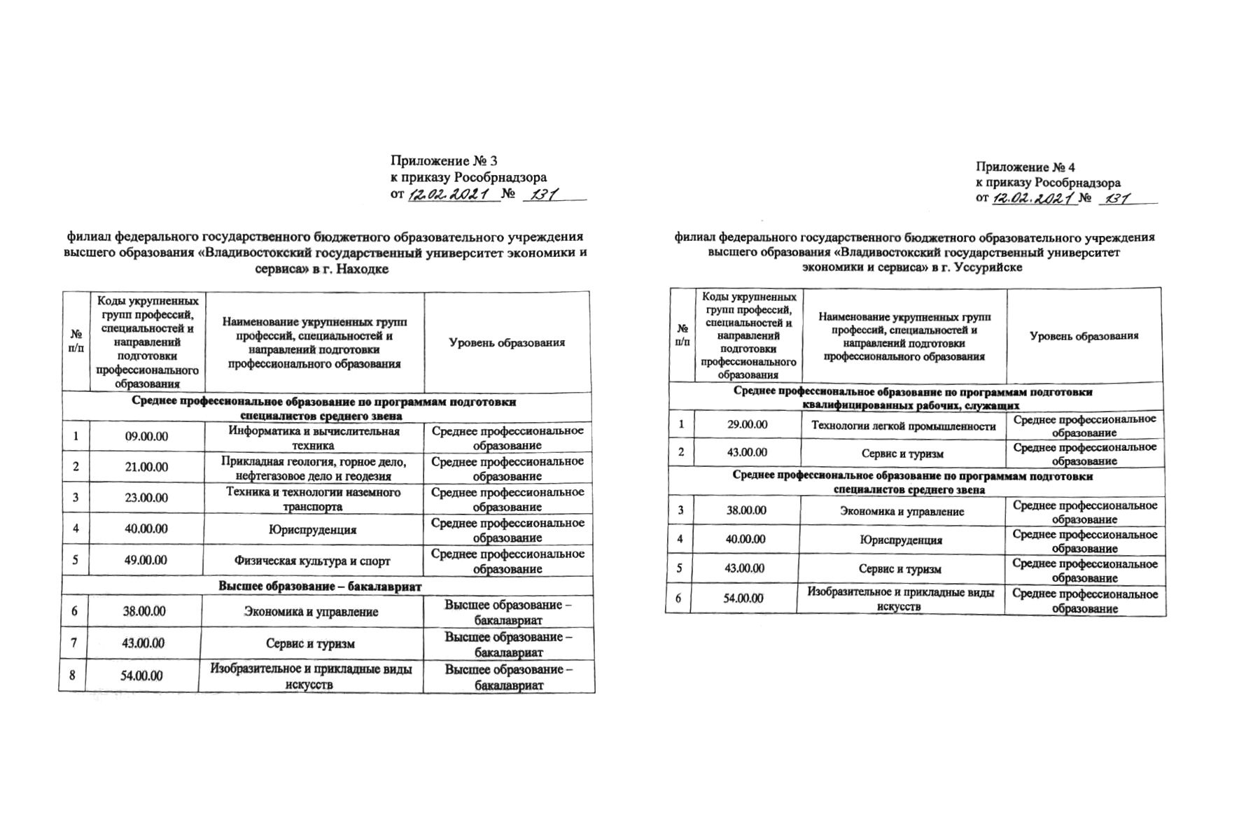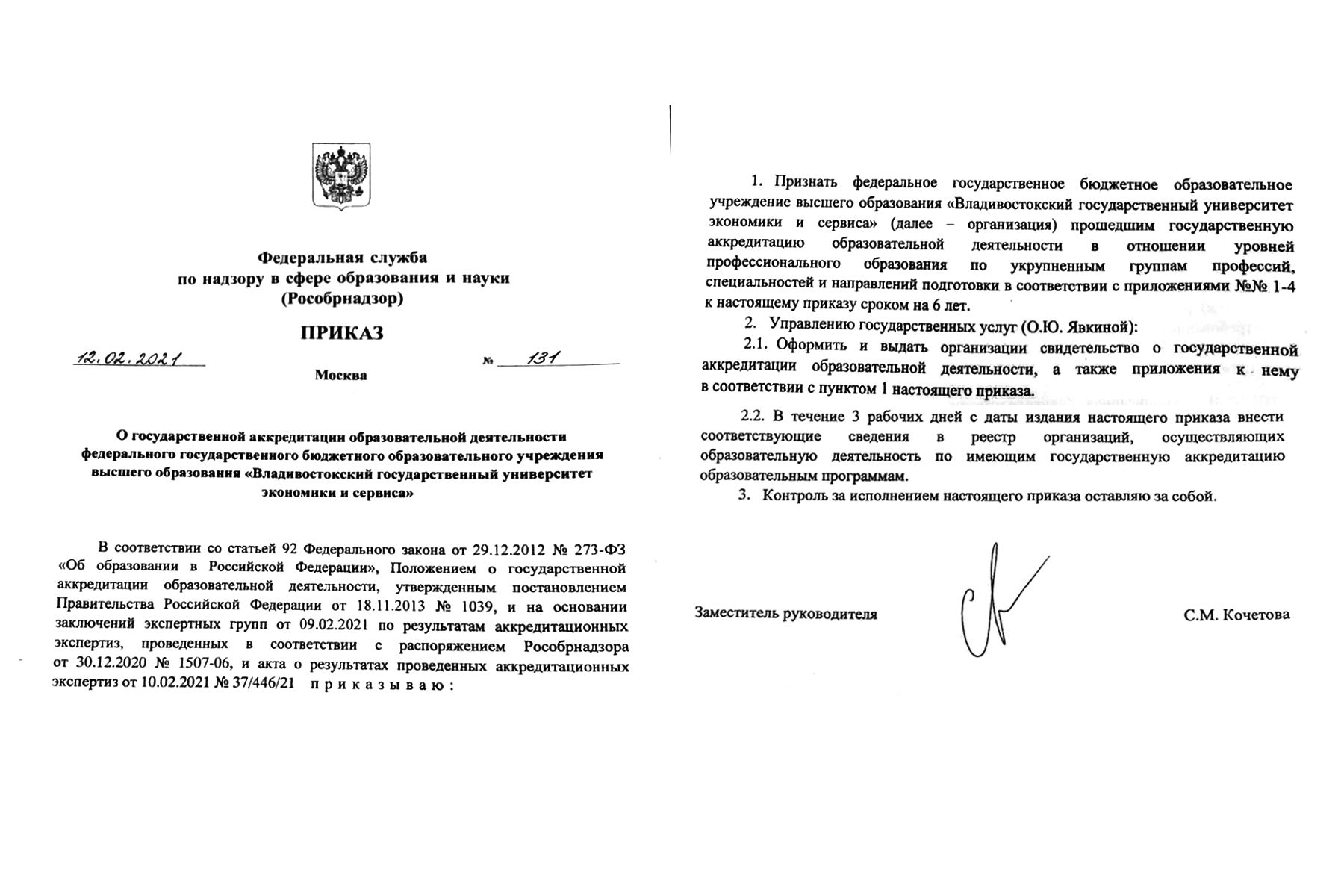 По результатам проведенных аккредитационных экспертиз на основании приказа Рособрнадзора № 131 от 12 февраля 2021 года федеральное государственное бюджетное образовательное учреждение высшего образования «Владивостокский государственный университет экономики и сервиса» признан прошедшим государственную аккредитацию образовательной деятельности сроком на шесть лет, до февраля 2027 года. Экспертами отмечено, что содержание и качество подготовки обучающихся по всем заявленным направлениям подготовки соответствует федеральным государственным образовательным стандартам среднего профессионального и высшего образования (ФГОС).