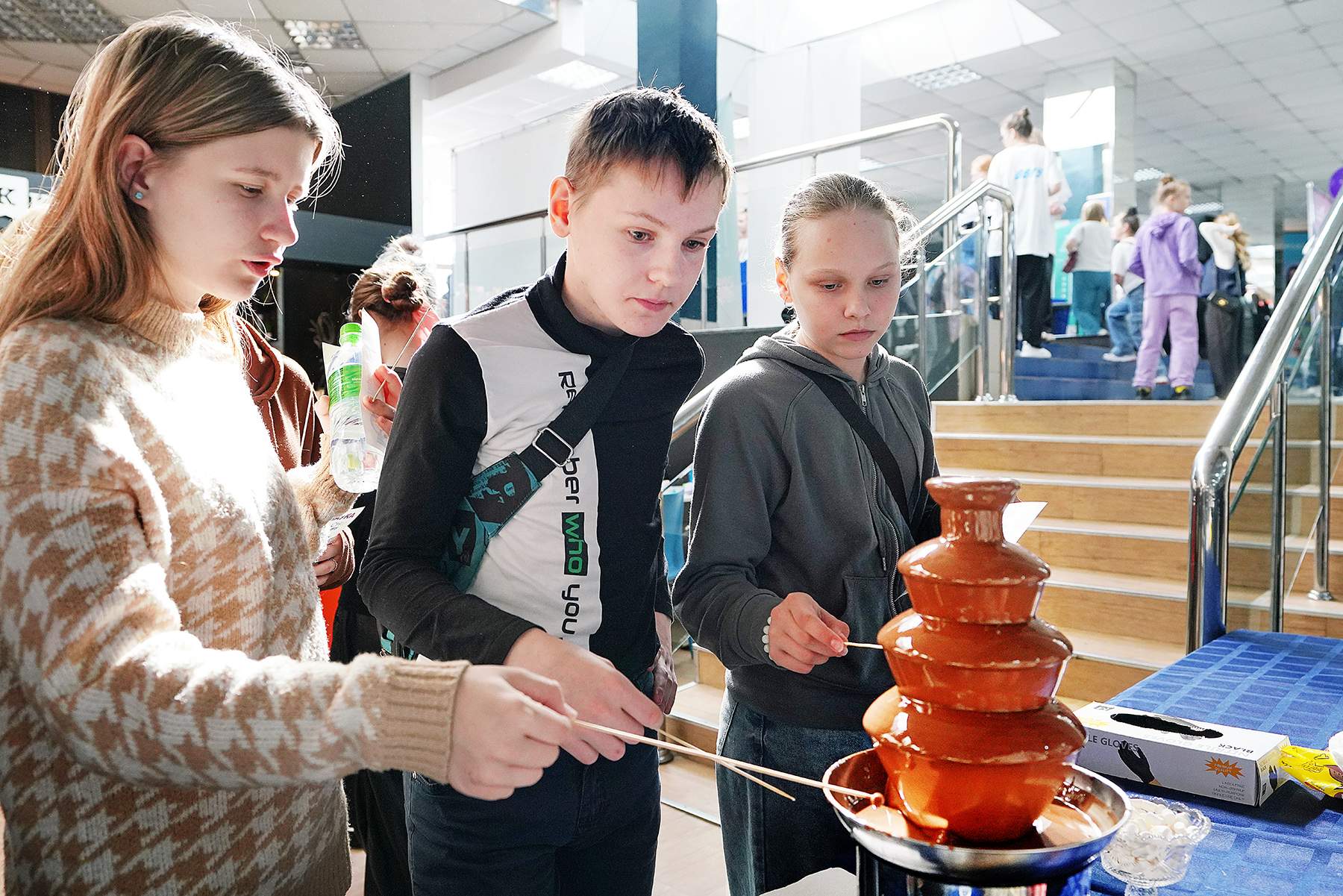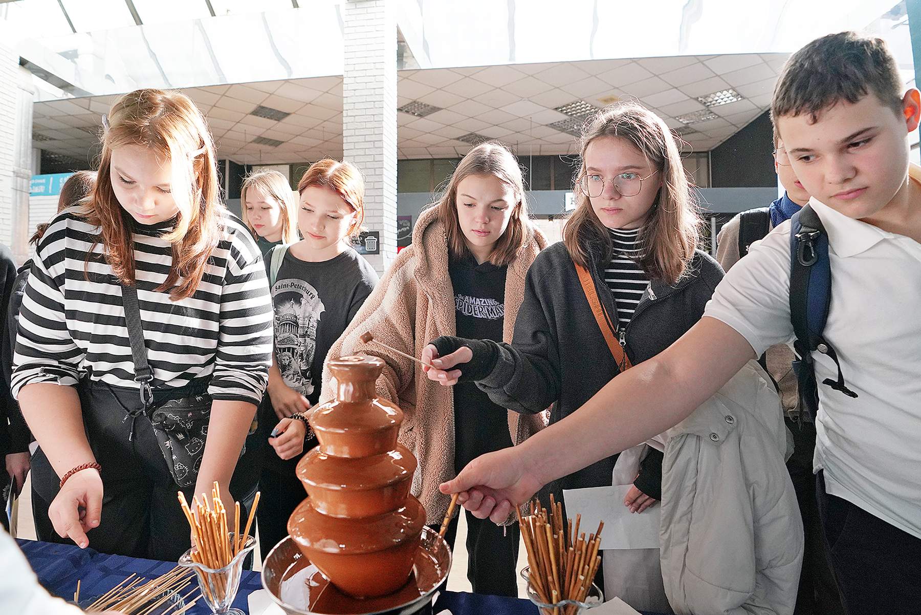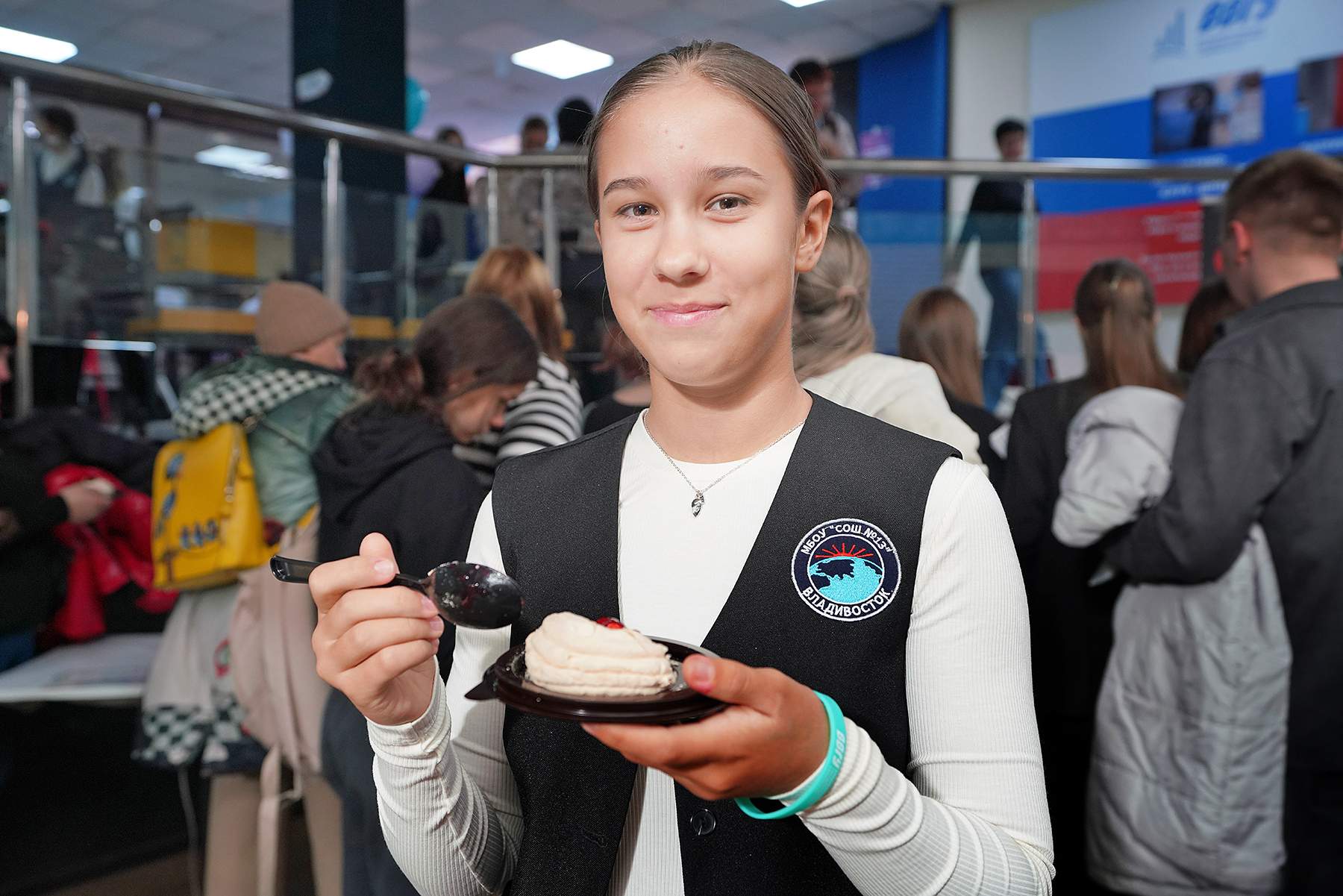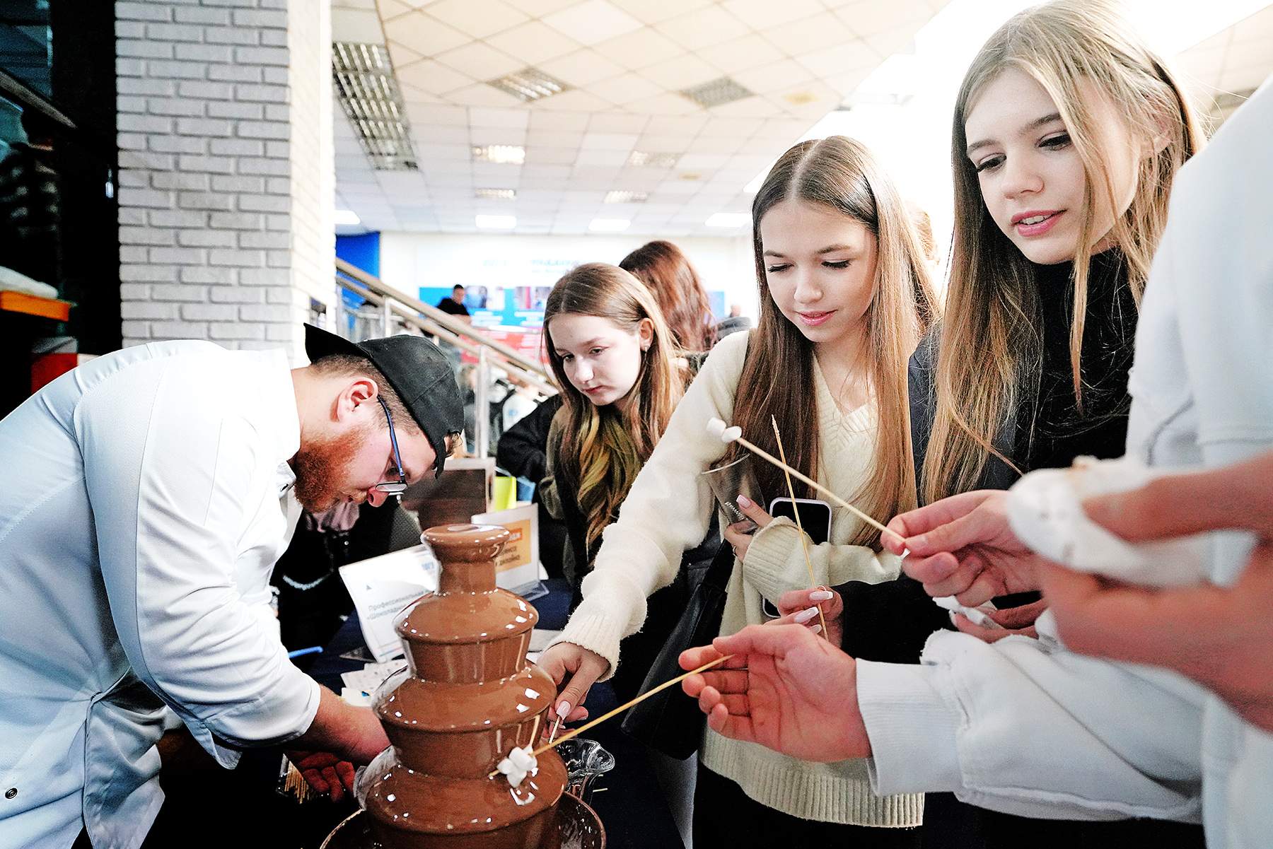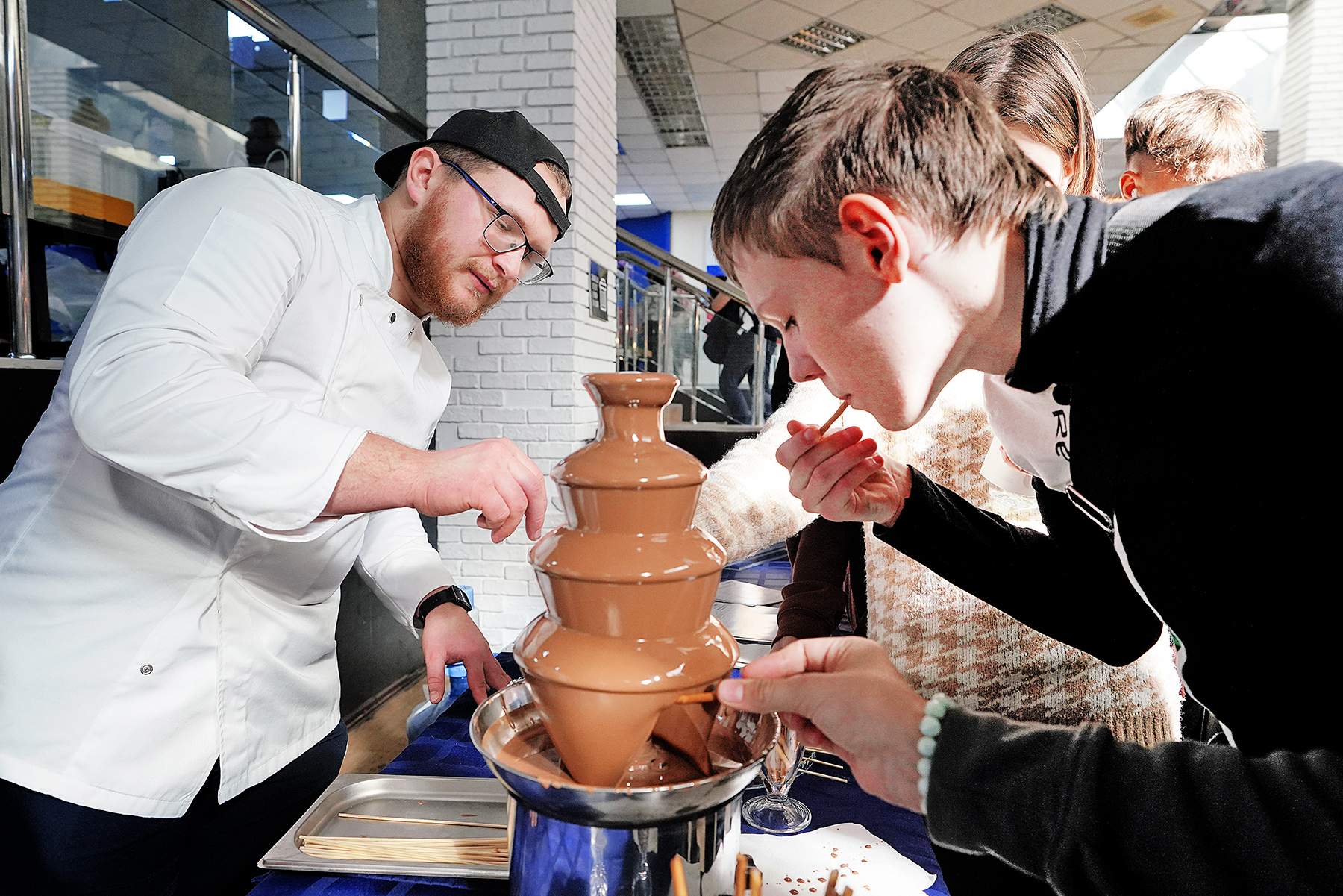 Арсений Морозов, студент ВВГУ, получивший гран-при в конкурсе Европейской кухни в Харбине, вместе с преподавателем-наставником, экспертом по компетенции «Поварское дело» Натальей Шекеро провели профессиональную пробу по кондитерскому искусству «Шоколадное удовольствие»: показали школьникам, как правильно подавать десерты и угостили молочным шоколадом из шоколадного фонтана.