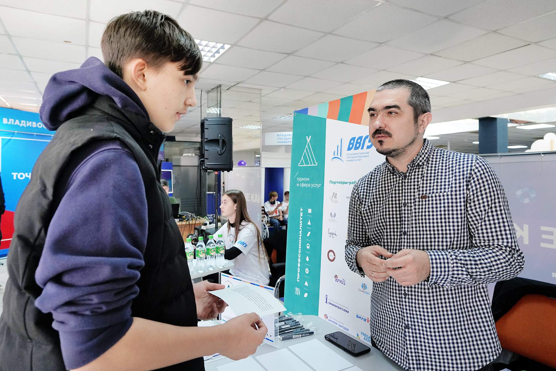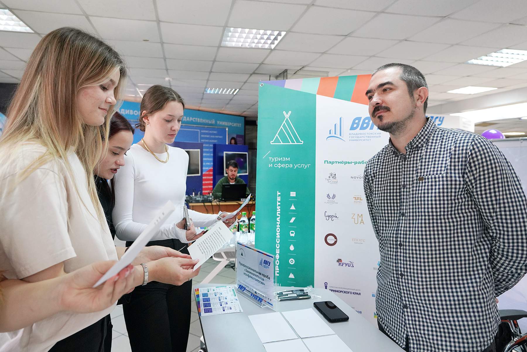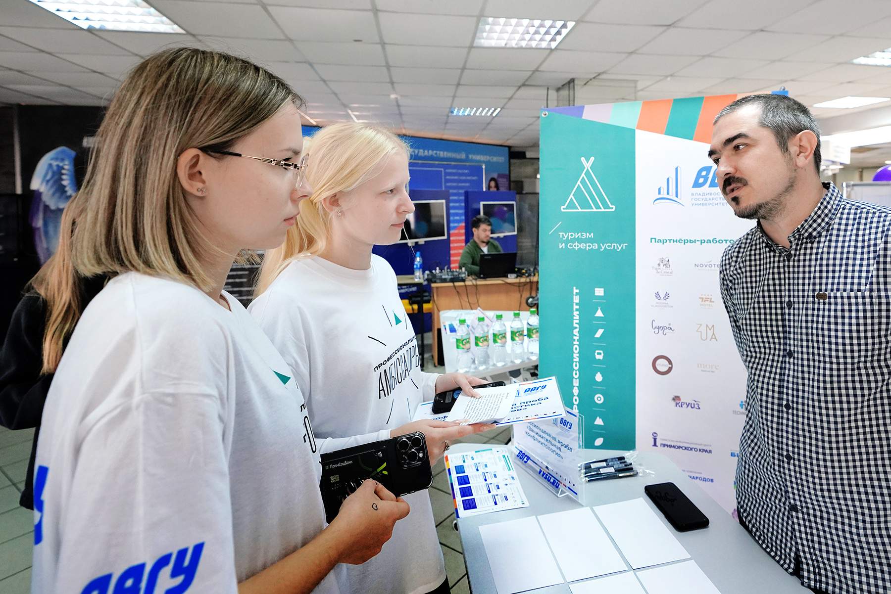 «Сегодня в рамках Единого дня открытых дверей ФП «Профессионалитет» на площадке ВВГУ, как базовой организации кластера среднего профессионального образования «Туризм и сфера услуг» Приморского края, собрались ведущие предприятия региона. Совместно с работодателями мы учим востребованных специалистов, готовых к вызовам современной экономики», – отметил первый проректор Сергей Голиков.