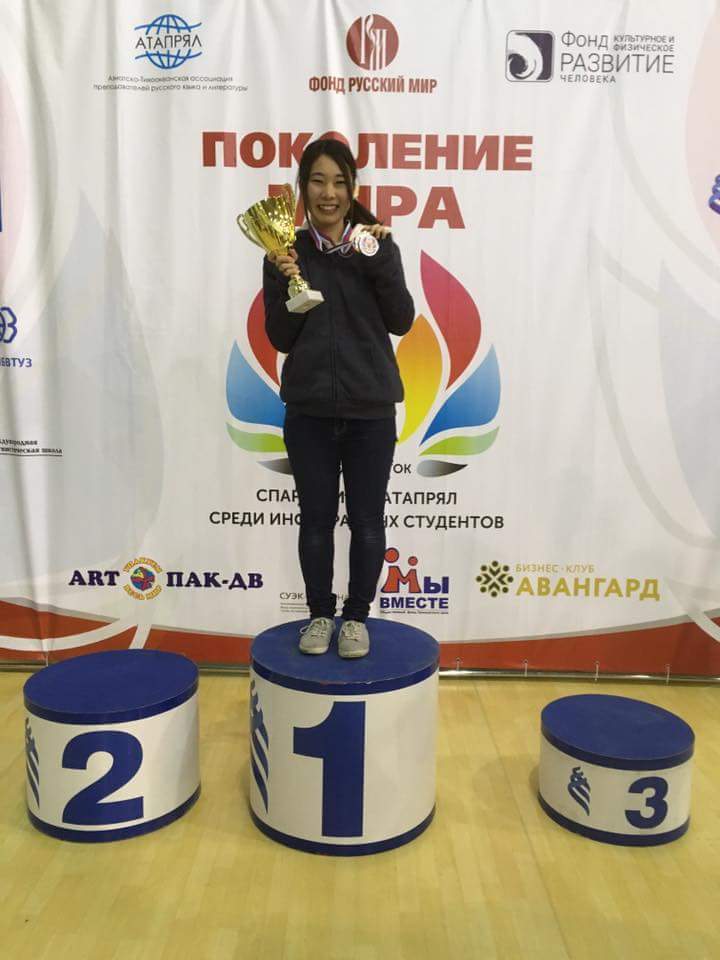 Сайто Юриа из Ниигаты занимается плаванием уже десять лет и даже успела поработать детским тренером в этом виде спорта. На спартакиаде она плыла две дистанции – 50 и 100 метров. О своих впечатлениях студентка написала на своей странице в Facebook: «14 октября я принимала участие в соревновании по плаванию. Это была спартакиада АТАПРЯЛ среди иностранных студентов во Владивостоке. Проплыв 50 метров, я заняла 1 место и 2 место за 100 метров! Среди других университетов я заняла 2 место от ВГУЭС!