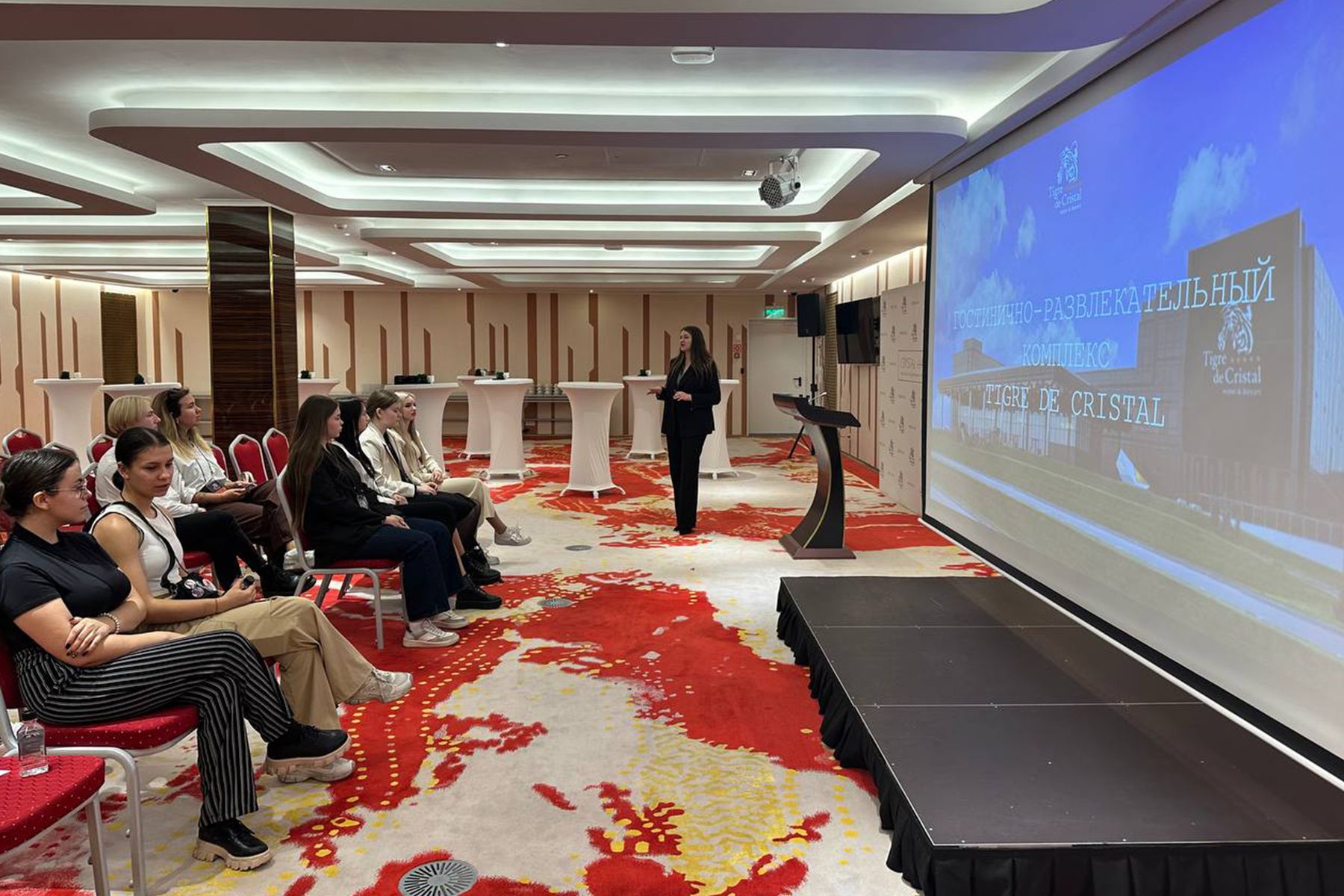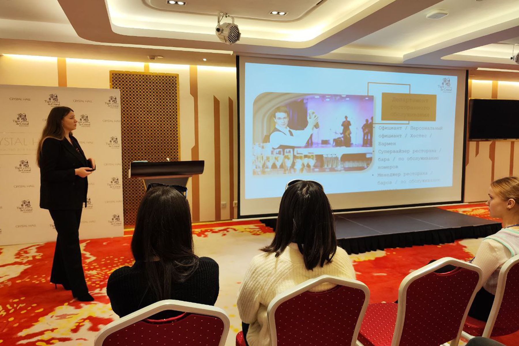 Во время посещения гостинично-развлекательный «Tigre de Cristal» вице-президент по персоналу ООО «Джи1 Интертейнмент» Татьяна Федулова рассказала о трудоустройстве и уровне заработной платы, о возможностях повышения квалификации во время работы: