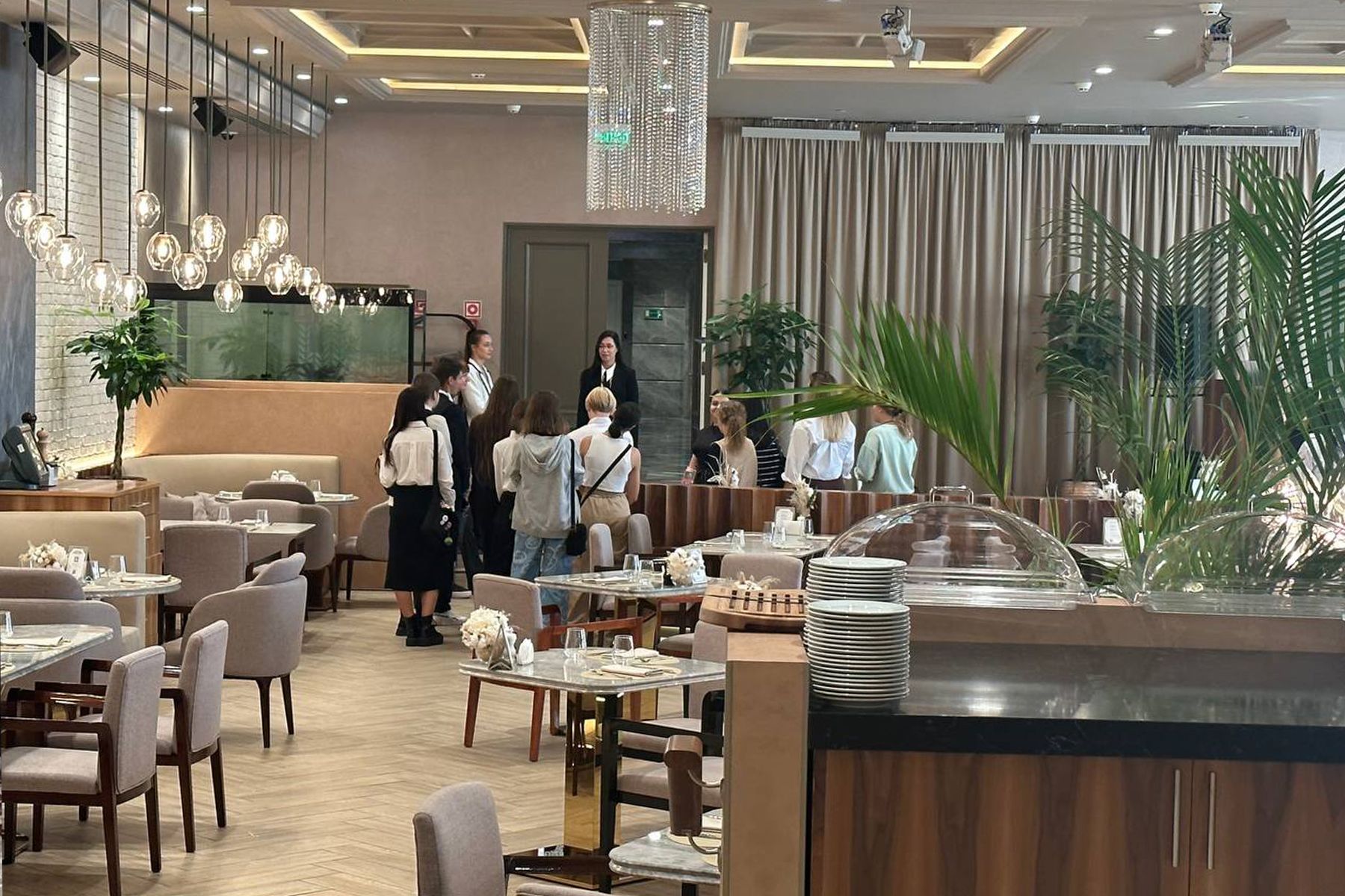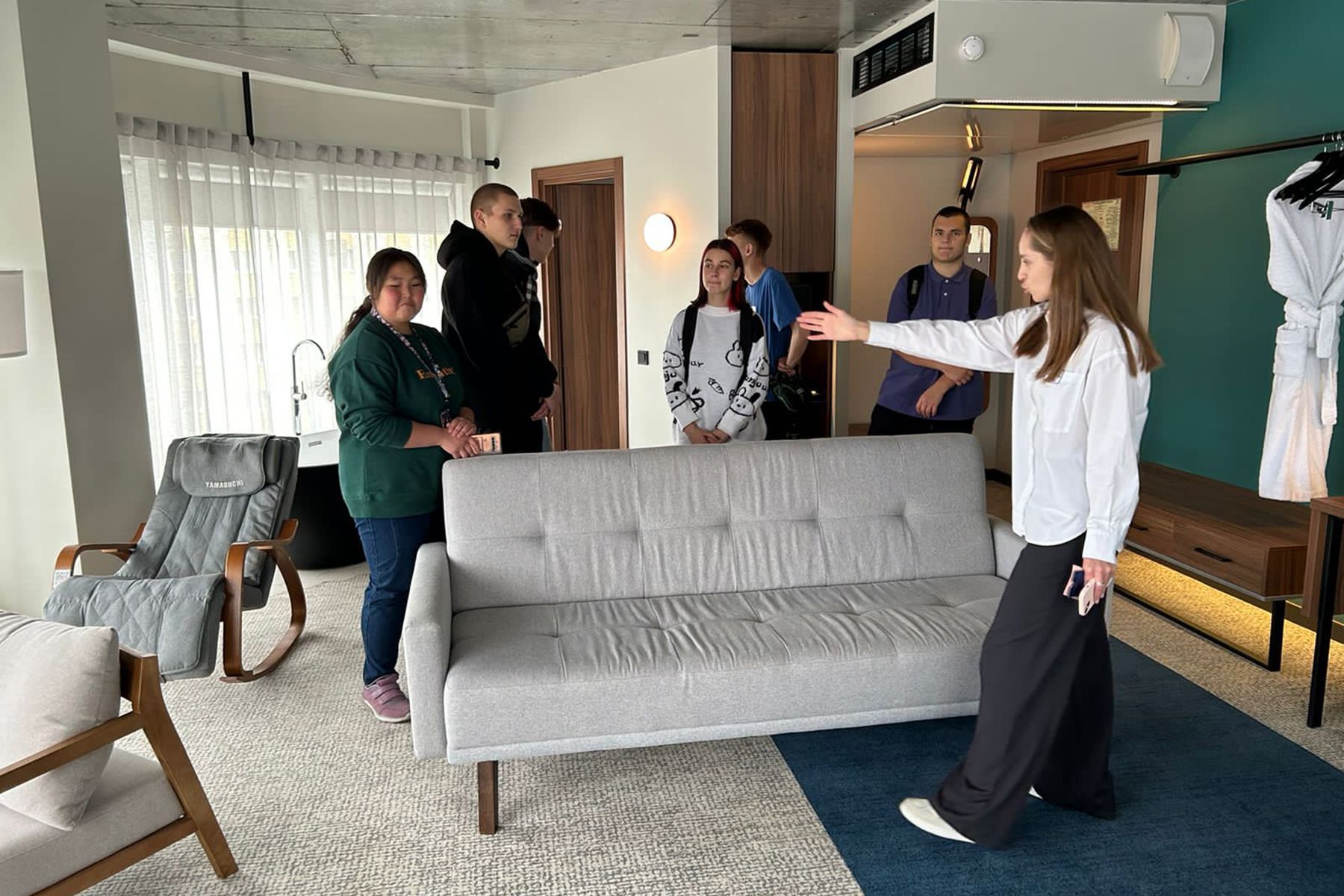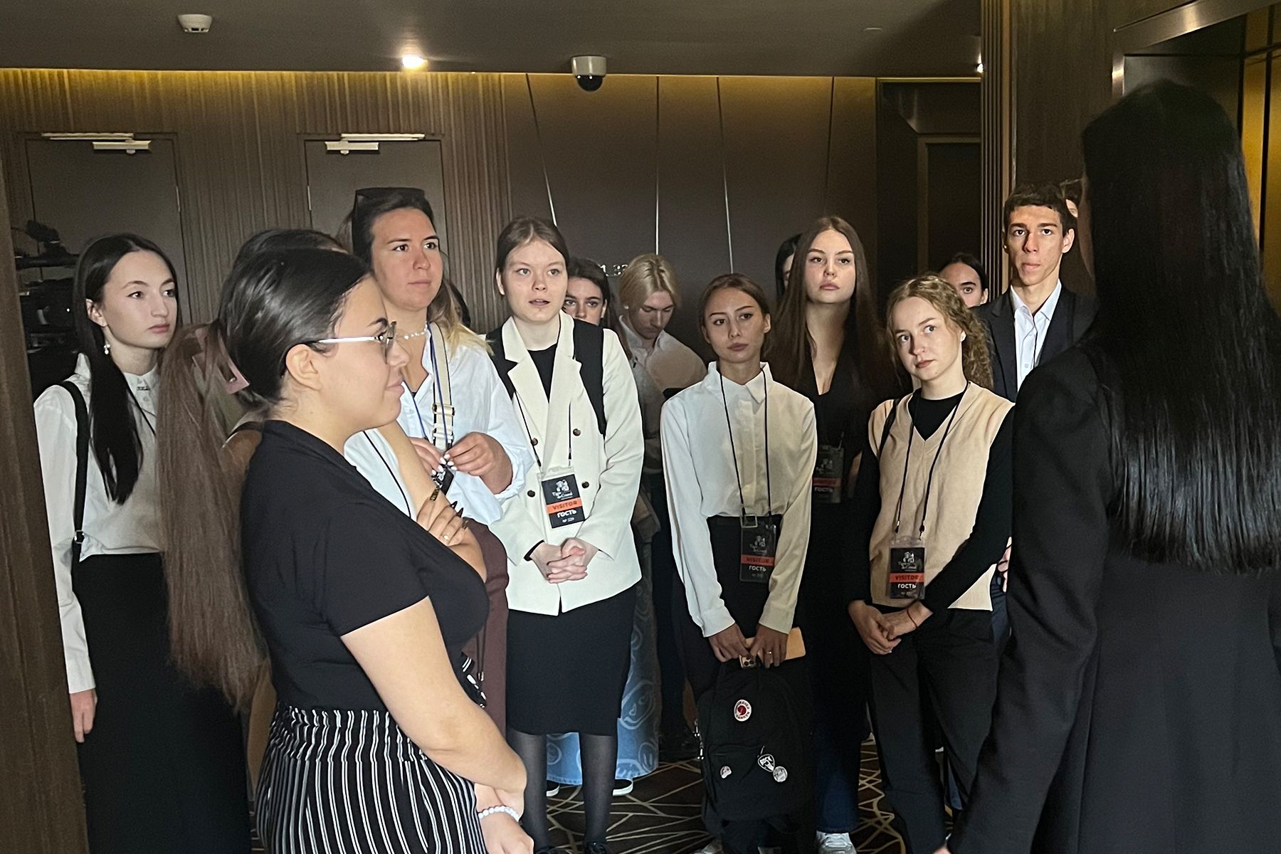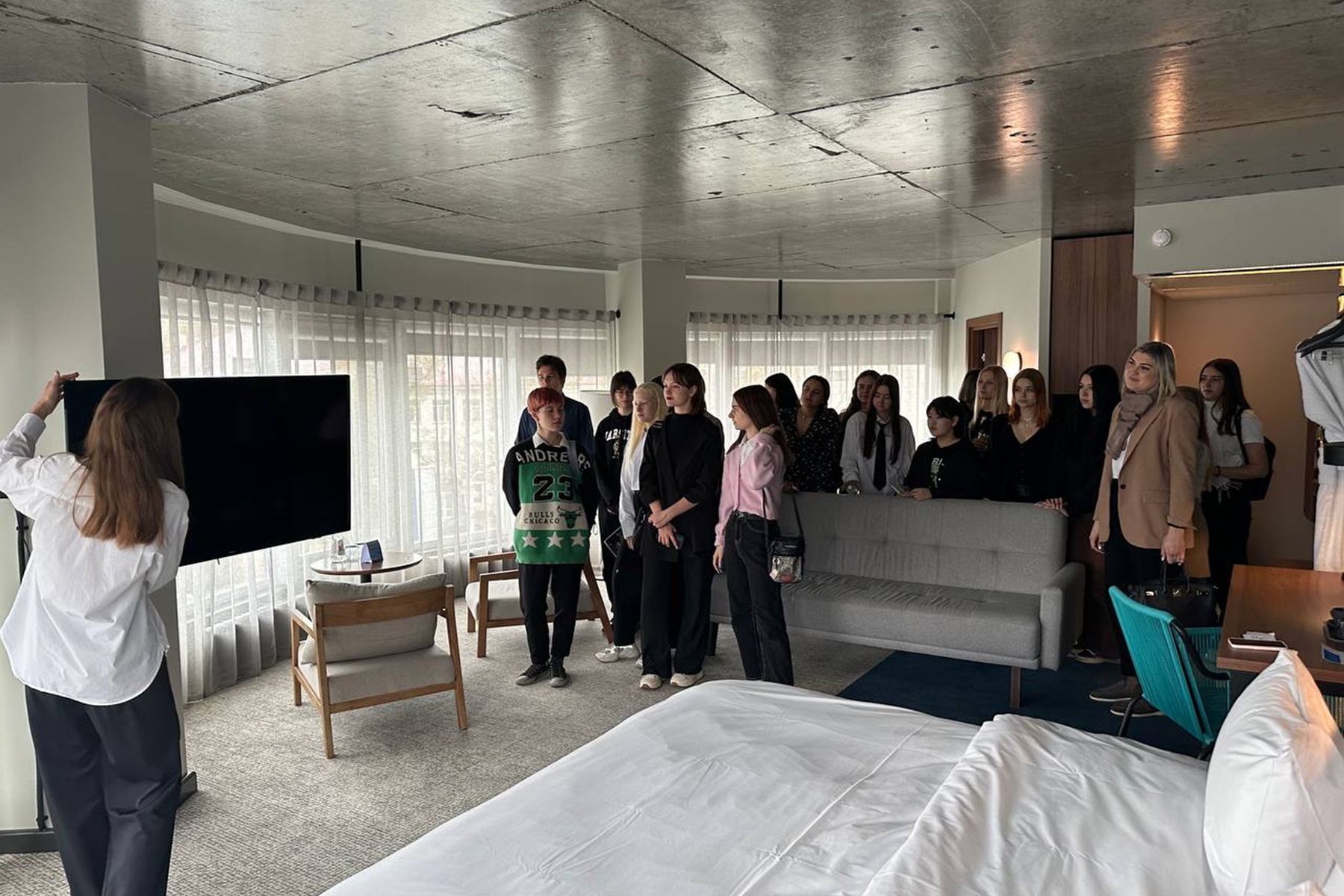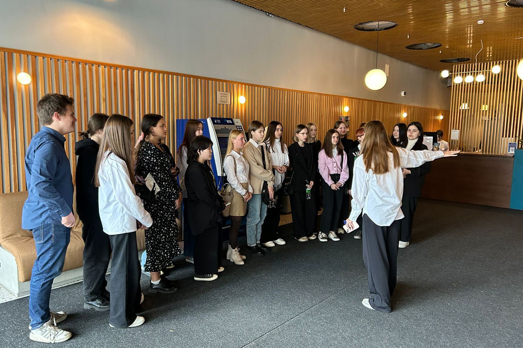 На экскурсиии в гостинице Новотель школьники побывали по приглашению Светланы Посадовой, операционного директора ООО «Нова» - гостиница Новотель. В качестве гида выступила менеджер по талантам и культуре ООО «Нова» Анастасия Харченко, она ознакомила школьников с циклом обслуживания клиентов при заселении и выселении, процедурами бронирования номеров, показом номерного фонда.