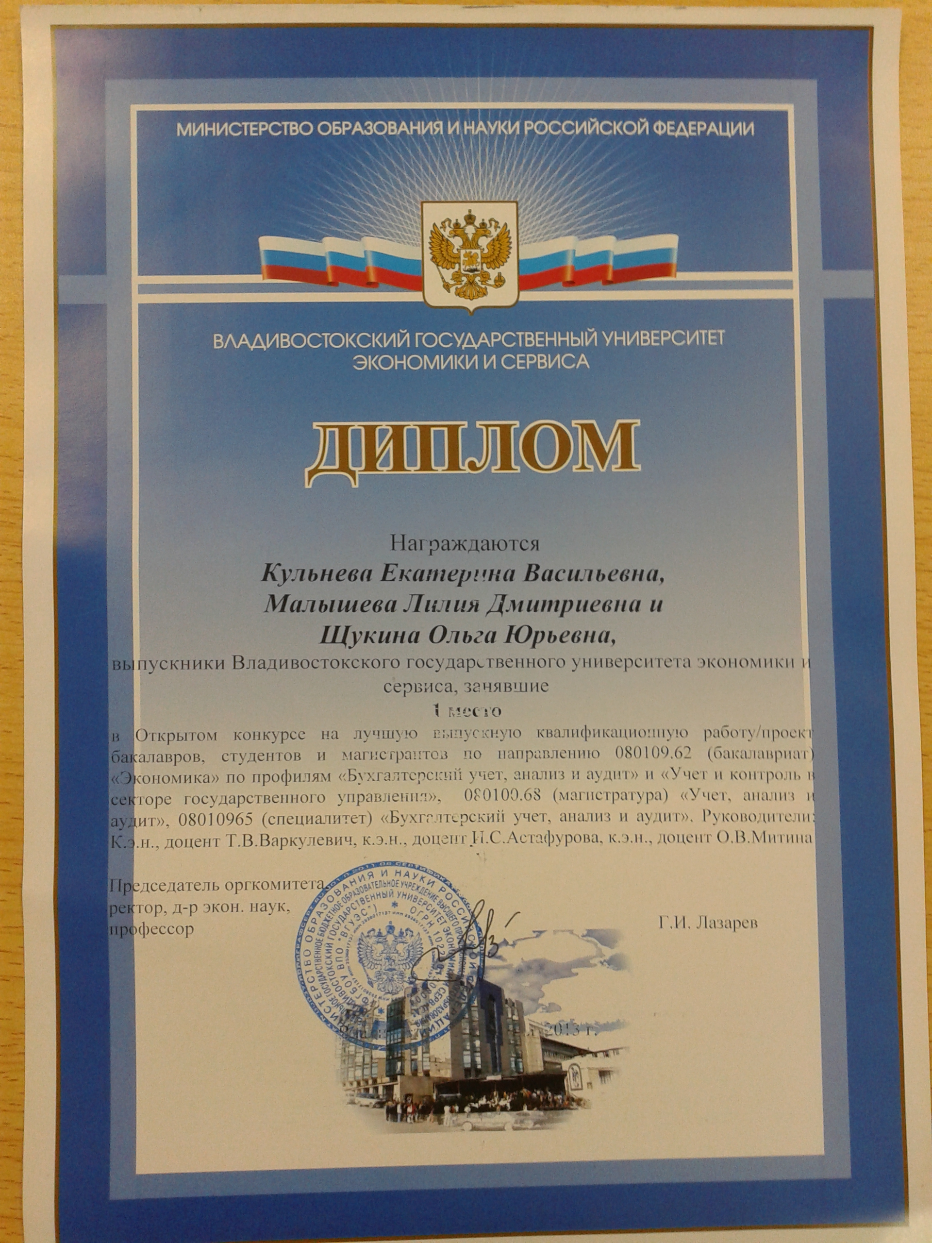 На кафедре «Бухгалтерского учёта и аудита» Института Международного бизнеса и экономики с 10 по 25 декабря 2013 года проводился Открытый конкурс на лучшую выпускную работу бакалавров, студентов и магистрантов по направлению «Экономика». Экспертную комиссию открытого конкурса возглавляла Терентьева Татьяна Валерьевна, доктор экономических наук, доцент, Проректор по научно-исследовательской работе, заведующая кафедрой «Бухгалтерского учёта и аудита» ВГУЭС. Проверку и оценку работ осуществляло жюри экспертной комиссии открытого конкурса: кандидаты экономических наук Татьяна Варкулевич, Марина Василенко, Ирина Астафурова, доцент Лариса Алексеева, практикующий специалист в области учёта Денис Ковалев, Финансовый директор ООО «Авто».