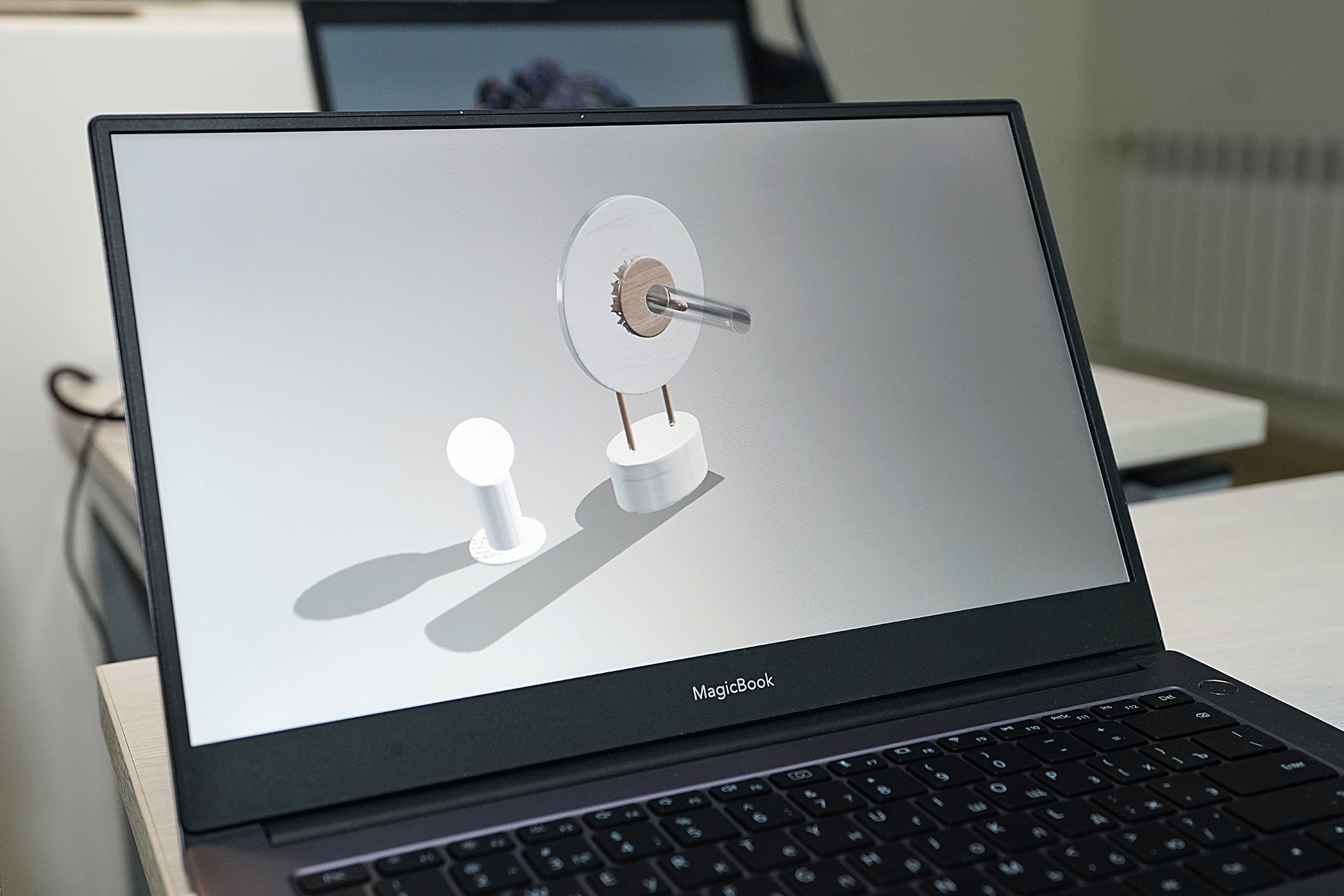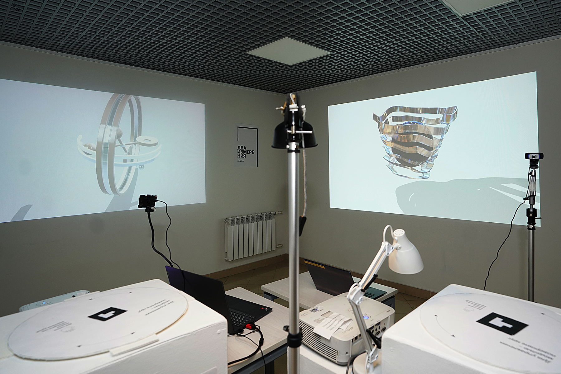 Исследовательский проект студентов и преподавателей в области визуальной коммуникации и цифрового искусства «ДВА ИЗМЕРЕНИЯ» . Проект изучает возможности взаимодействия (контакта) зрителя с виртуальным миром с помощью современных технологий и компьютерного зрения без использования какого-либо технического оборудования со стороны человека, через простые жесты, максимально доступные и интуитивно понятные каждому.На экспериментальных стендах представлены кинетические скульптуры, созданные студентами кафедры цифрового дизайна. Экспонаты доступны для активного изучения зрителем через взаимодействие с маркерами – предметами-посредниками между цифровым и реальным пространствами. На каждом стенде дана небольшая инструкция – описание возможностей пульта-управления виртуальным кинетическим предметом.
