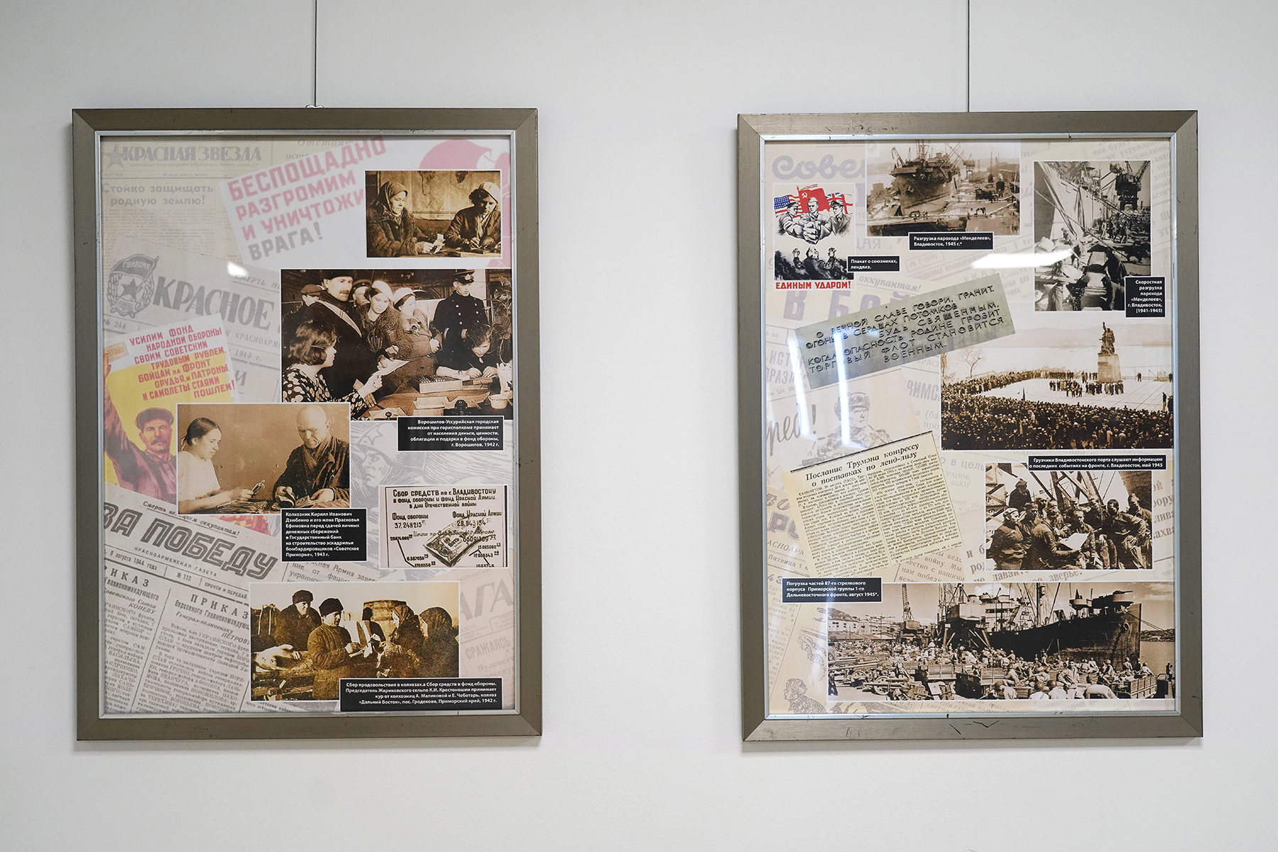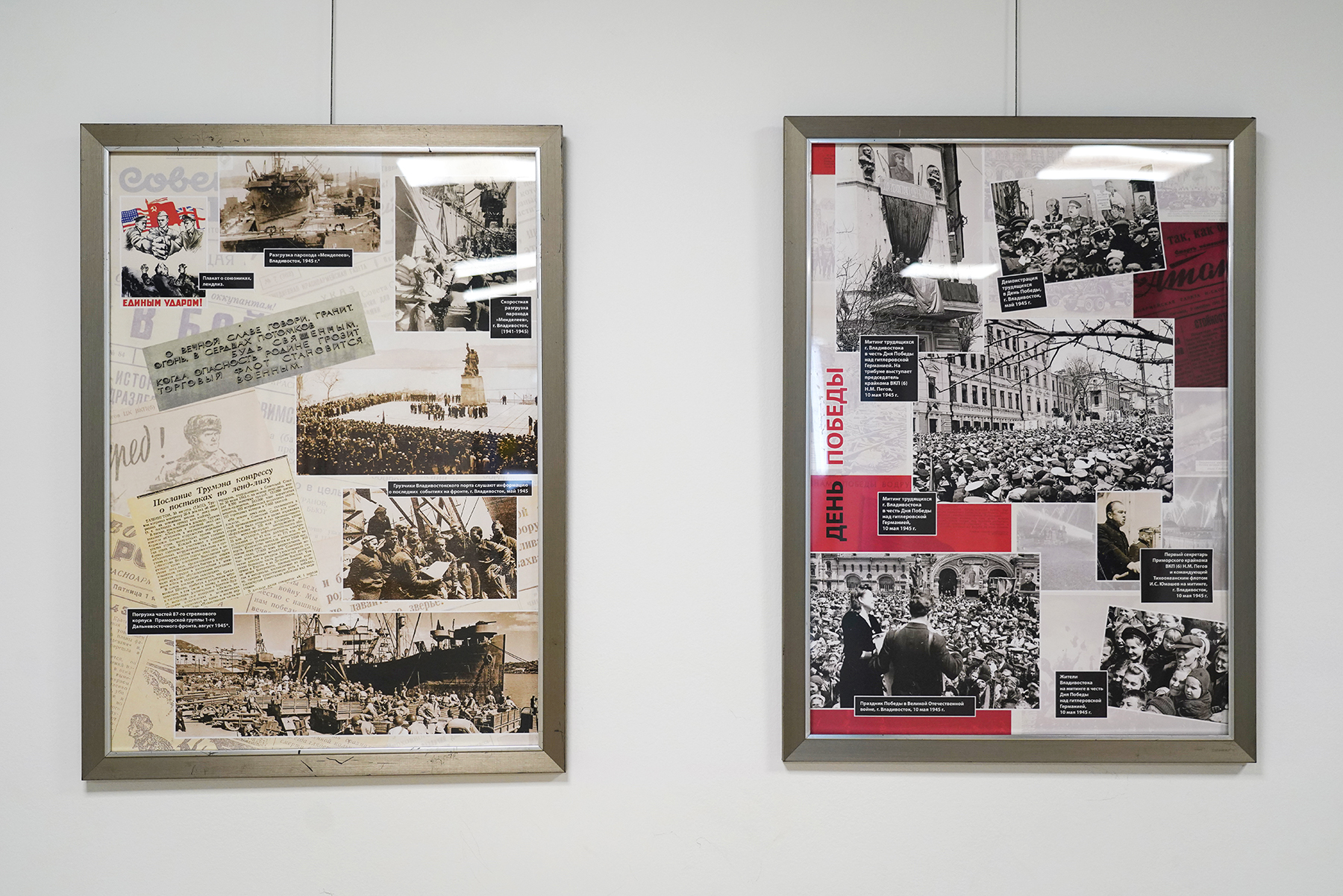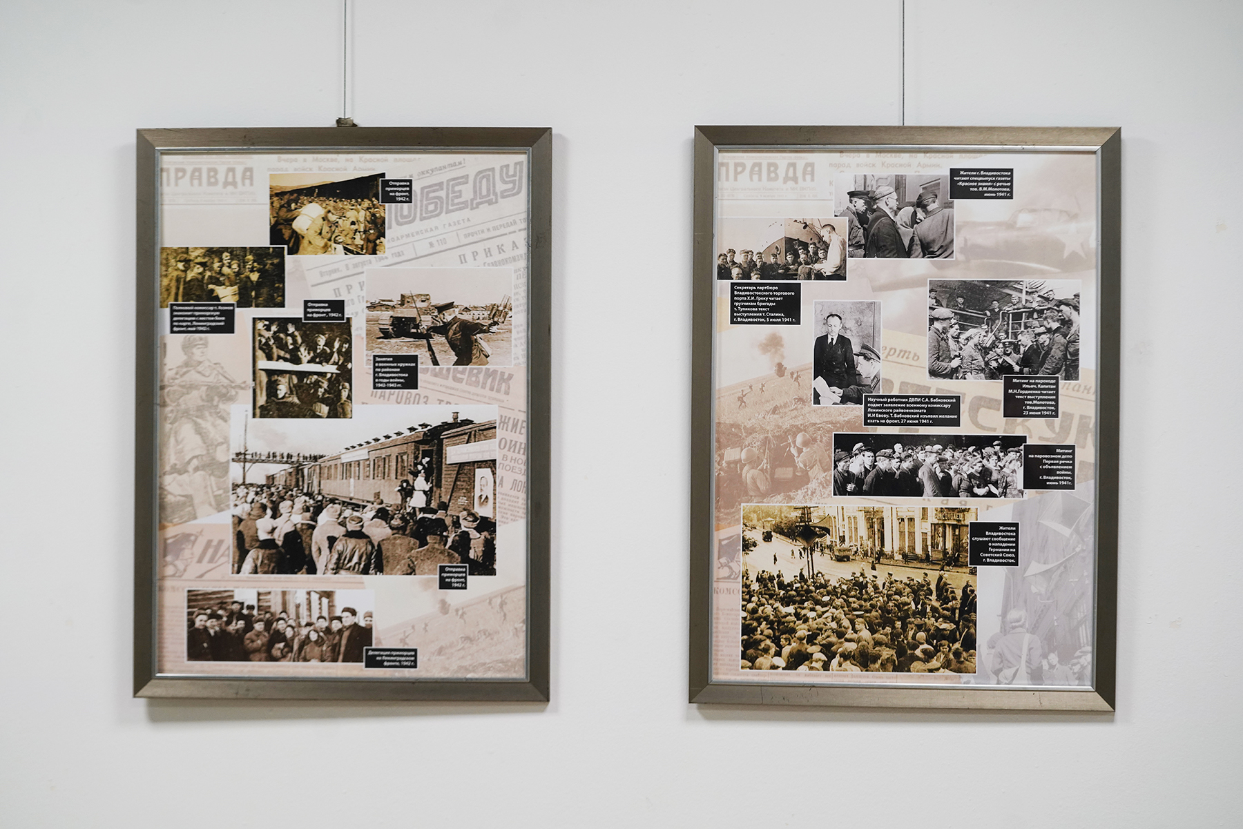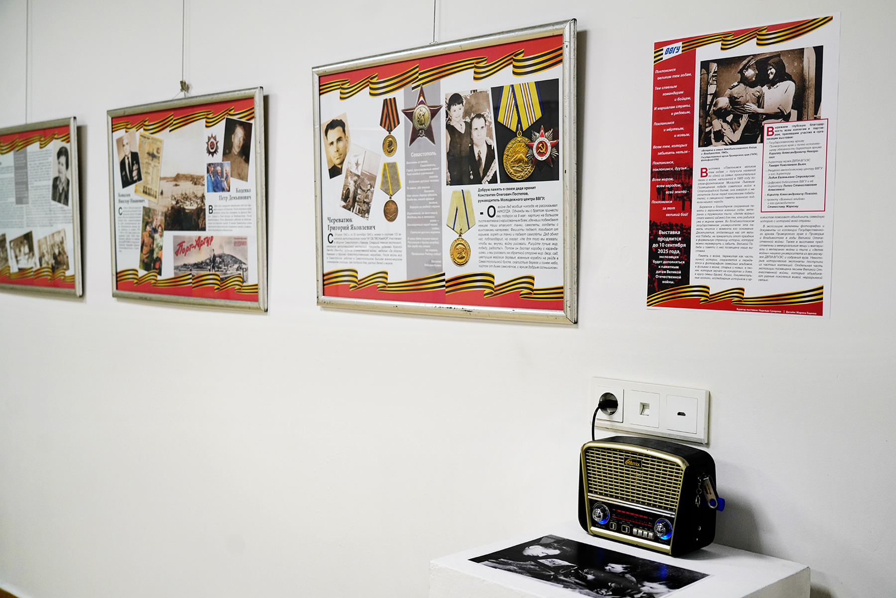 На выставке представлены интерактивные зоны с историями 12 ветеранов и детей войны. На каждой из них памятные вещи героев войны: боевые награды, амуниция, письма, книги, фотографии военных лет. Сопровождают экспозицию газеты, журналы и агитационные плакаты времён Великой Отечественной, оригиналы и реплики. Выставка подготовлена в сотрудничестве с Государственным архивом Приморского края, проектом «Военный альбом», библиотекой университета и частными коллекционерами.